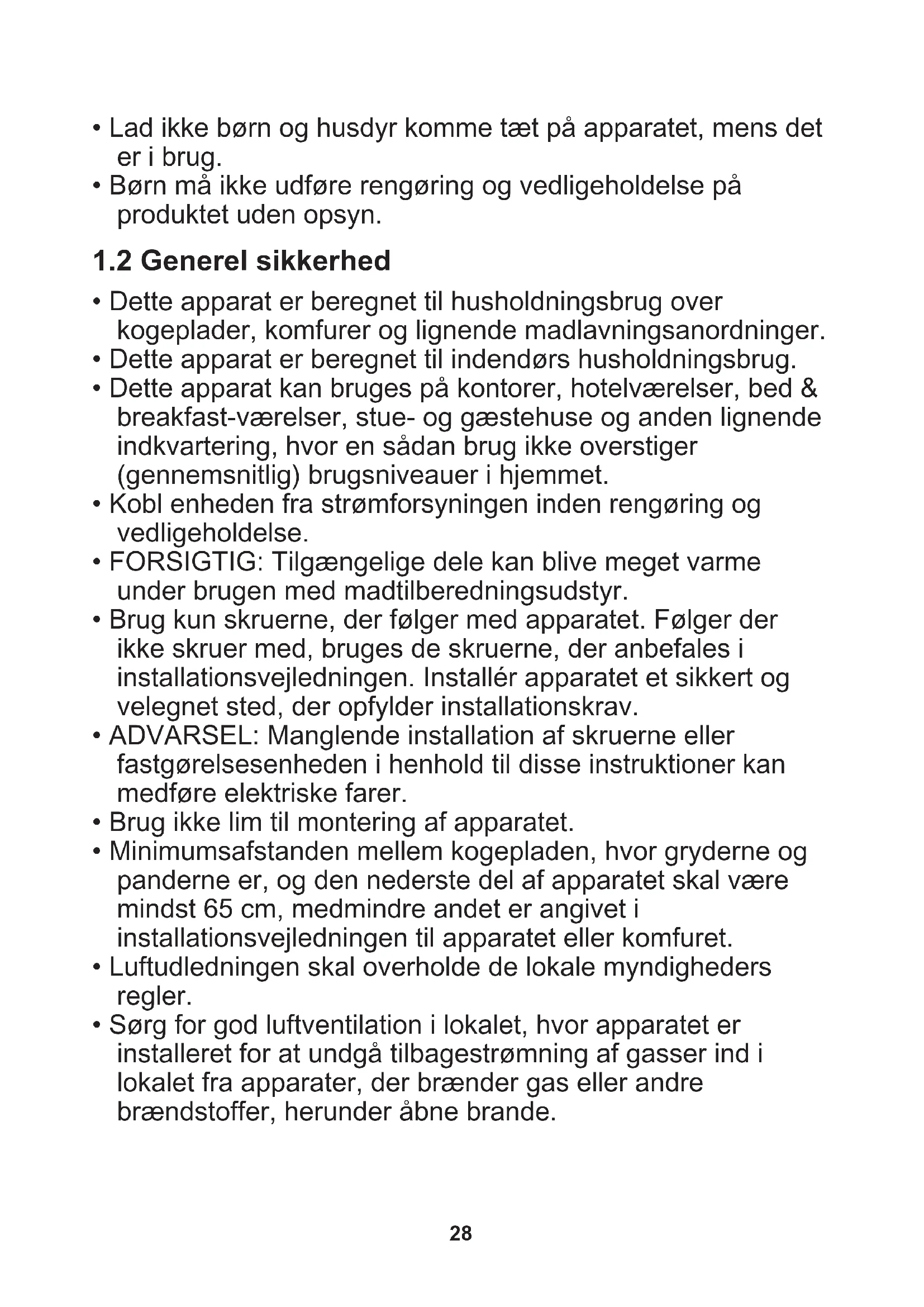 - Minimumsafstanden mellem kogepladen, hvor gryderne og panderne er, og den nederste del af apparatet skal være mindst 65 cm, medmindre andet er angivet i installationsvejledningen til apparatet eller komfuret.