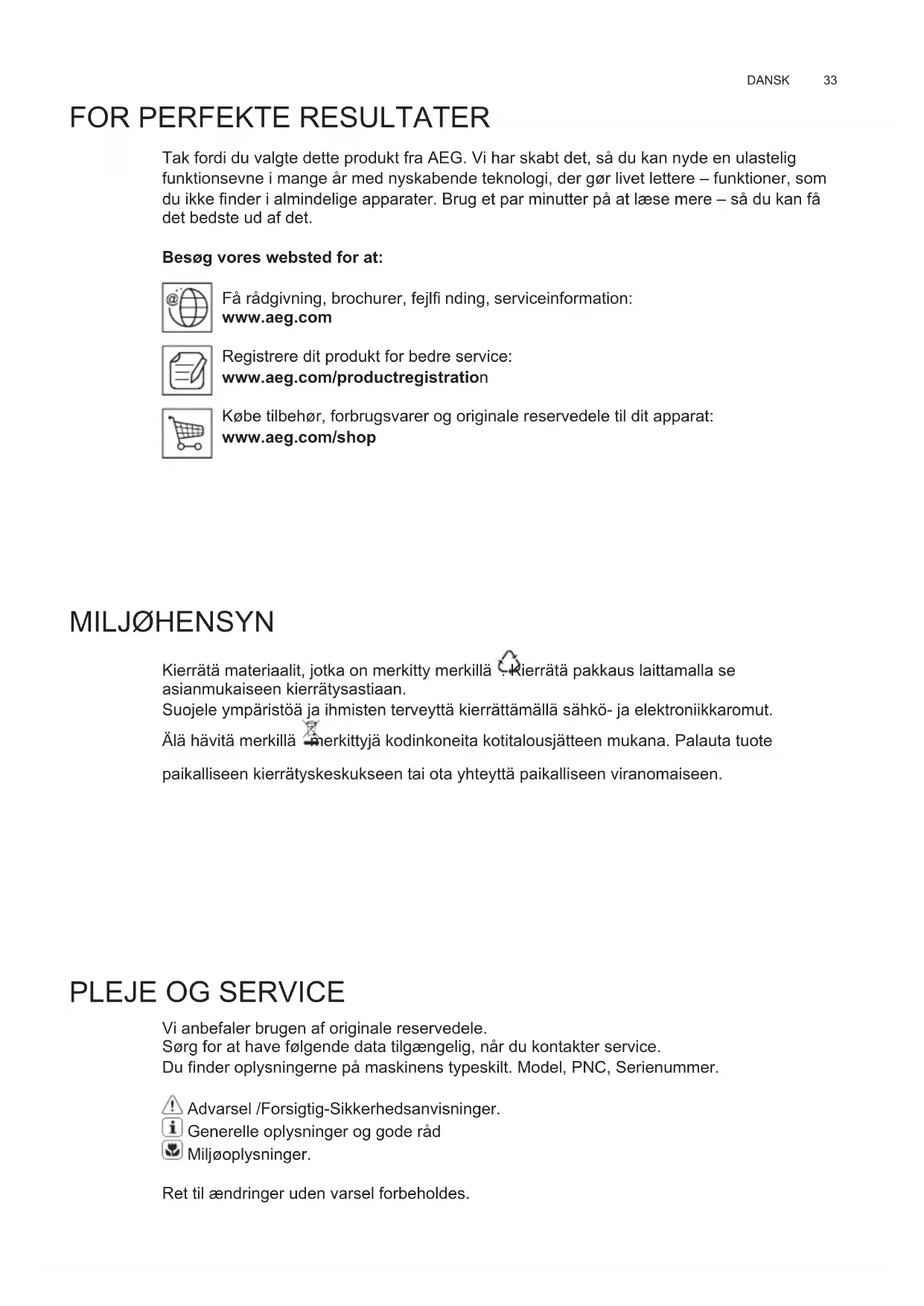 Vi anbefaler brugen af originale reservedele. Sørg for at have følgende data tilgængelig, når du kontakter service. Du fi nder oplysningerne på maskinens typeskilt. Model, PNC, Serienummer. Advarsel /Forsigtig-Sikkerhedsanvisninger. Generelle oplysninger og gode råd Miljøoplysninger. Ret til ændringer uden varsel forbeholdes. DA BRUGSVEJLEDNING34 ADVARSEL Overhold venligst alle instruktioner i denne vejledning. Fabrikanten frasiger sig ethvert ansvar for eventuelle fejl, skader eller brande forårsaget af apparatet, men afl edt af manglende overholdelse af instruktionerne i denne vejledning. Emhætten er udelukkende udviklet til brug i almindelige hjem. Pas på! Apparatet må ikke tilsluttes elnettet før installeringen er helt tilendebragt. Før der udføres nogen form for rengøring eller vedligeholdelse, skal emhætten afbrydes fra elnettet ved at trække stikket ud, eller ved at afbryde hovedafbryderen i hjemmet. Ved alle installations- og vedligeholdelsesindgreb skal der bæres arbejdshandsker. Apparatet må ikke benyttes af børn, eller af personer med nedsatte sanseevner eller mentale færdigheder, eller uden den nødvendige erfaring og kendskab, med mindre brugen sker under opsyn eller vejledning fra en person der har ansvaret for deres sikkerhed. Børn skal holdes under opsyn, så de ikke får mulighed for at lege med emhætten. Emhætten må aldrig benyttes uden korrekt monteret rist! Emhætten må ALDRIG benyttes som støtteoverfl ade, med mindre dette er udtrykkeligt tilladt. Lokalet skal have tilstrækkelig ventilation, når køkkenemhætten anvendes samtidigt med andre apparater der forbrænder gas eller andre brændstoffer. Den opsugede luft må ikke ledes ind i rør, der anvendes til udledning af røg fra apparater med forbrænding af gas eller af andre brændstoffer. Det er strengt forbudt at fl ambere under emhætten. Brug af åben ild er farligt for fi ltrene og kan medføre brand, og skal derfor altid undgås. Friturestegning skal ske under opsyn for at forhindre, at den overopvarmede olie bryder i brand. De tilgængelige dele kan blive meget varme, når de benyttes sammen med apparater til madlavning. Hvad angår de nødvendige tekniske forholdsregler og sikkerhedskrav for udledning af røg, skal alle reglementer fra de lokale myndigheder overholdes uden undtagelse. Emhætten skal rengøres ofte, både indvendigt og udvendigt (MINDST EN GANG OM MÅNEDEN; overhold under alle omstændigheder angivelserne i kapitlet om vedligeholdelse i denne vejledning). Manglende overholdelse af kravene for rengøring af emhætten, og for udskiftning og rengøring af fi ltrene, medfører brandfare. Emhætten må hverken benyttes eller efterlades uden korrekt indsatte lyspærer pga. fare for elektrisk stød. Fabrikanten fralægger sig ethvert ansvar for eventuelle fejl, skader eller brand forårsaget af apparatet, men afl edt af manglende overholdelse af instruktionerne i denne vejledning. ANVENDELSE Emhætten er udviklet til brug i den sugende udgave med ekstern udledning eller i den fi ltrerende udgave med intern recirkulation . INSTALLERING Netspændingen skal svare til spændingen vist på typeskiltet internt i emhætten. Hvis emhætten er udstyret med et stik, skal emhætten tilsluttes en let tilgængelig stikkontakt, der er i overensstemmelse med de gældende standarder. Stikkontakten skal også være let tilgængelig efter installeringen. Hvis emhætten ikke er udstyret med et stik (direkte tilslutning til elnettet), eller hvis stikket ikke fi ndes i et område, der også er let tilgængeligt efter installeringen, skal der monteres en topolet afbryderkontakt i overensstemmelse med standarderne, der sørger for fuld afbrydelse fra elnettet i tilfælde af forhold i overspændingskategori III, og i overensstemmelse med reglerne for elektriske installationer. Obs! Undersøg altid, at netkablet er blevet monteret rigtigt, før emhættens kredsløb tilsluttes forsyningsnettet og der udføres kontrol af korrekt funktion.35 DANSK Minimumsafstanden mellem kogegrejets støtteoverfl ade på komfuret og den nederste del af emhætten må ikke være under 65cm ved elektriske kogeplader, og ikke under 75cm ved gasblus eller komfurer med både gasblus og elektriske kogeplader. Hvis gaskomfurets vejledning angiver en større afstand, skal dette overholdes. VEDLIGEHOLDELSE Obs! Inden der udføres nogen form for rengøring eller vedligeholdelse skal emhætten afbrydes fra elnettet ved at fjerne stikket fra stikkontakten, eller ved at afbryde hjemmets hovedafbryder. Emhætten skal rengøres jævnligt både på ydersiden og på indersiden (mindst med samme frekvens som for vedligeholdelse af fedtfi ltrene). Ved rengøring skal man anvende en klud fugtet med neutrale, milde rengøringsmidler i fl ydende form. Undgå brug af produkter indeholdende slibemidler BENYT ALDRIG SPRIT! Pas på! Manglende overholdelse af vejledningen til rengøring af apparatet og udskiftning af fi ltrene medfører brandfare. Der henstilles således til, at instruktionerne følges. Fabrikanten frasiger sig ethvert ansvar for eventuel beskadigelse af motoren, brande forårsaget af utilstrækkelig vedligeholdelse af apparatet eller manglende overholdelse af ovenstående instruktioner. Fedtfi lter - Fedtfi lteret skal rengøres én gang om måneden med milde rengøringsmidler; fi lteret kan også vaskes i opvaskemaskine ved lav temperatur og på et kort opvaskeprogram. Ved vask i opvaskemaskinen kan metal-fedtfi lteret blive misfarvet, men dette vil ikke have negativ indfl ydelse på dets fi ltrerende egenskaber. Filter med aktivt kul der IKKE kan vaskes Kulfi lteret skal udskiftes hver 4. Måned, hvis emhætten ikke benyttes intensivt, eller oftere. Kulfi lteret kan IKKE vaskes eller genanvendes. BETJENING Emhætten er udstyret med et betjeningspanel med mulighed for regulering af sugestyrken og lys til oplysning af kogeområdet.