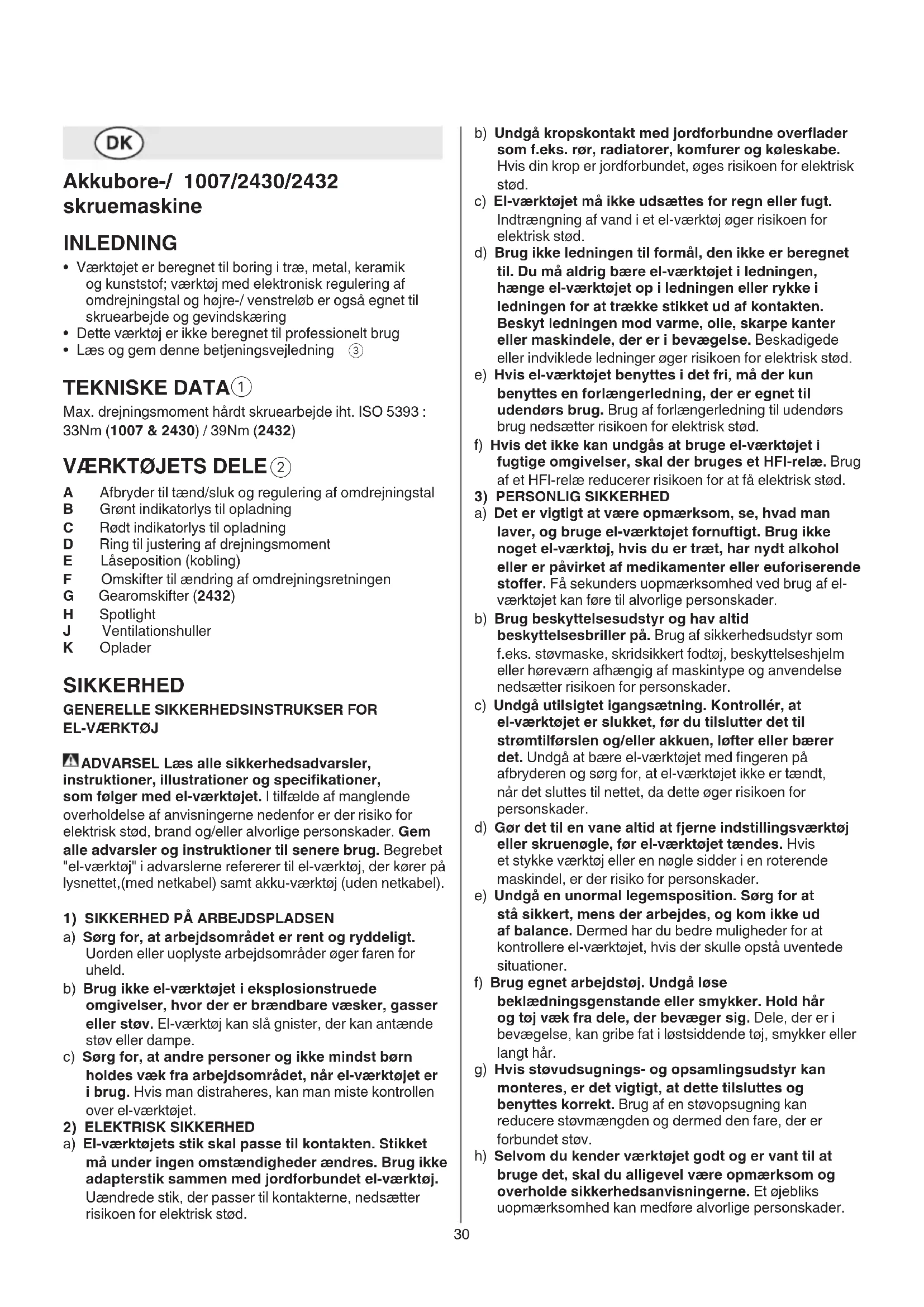 A Afbryder til tænd/sluk og regulering af omdrejningstal B Grønt indikatorlys til opladning C Rødt indikatorlys til opladning D Ring til justering af drejningsmoment E Låseposition (kobling) F Omskifter til ændring af omdrejningsretningen G Gearomskifter (2432) H Spotlight J Ventilationshuller K Oplader SIKKERHED