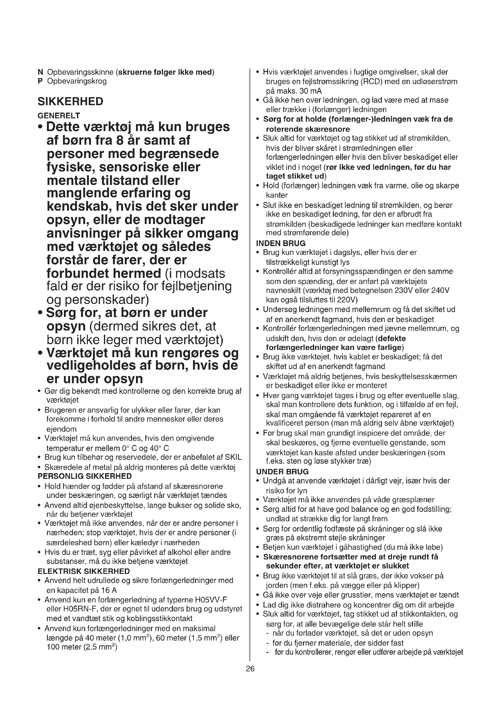 A Øvre husdel B Nedre husdel C Fastgøringsskruer (4) D Beskyttelsesskærm E Ledningsholder F Udløserkontakt G Dæksel til skæreklinge H Styregreb J Knap til fremføring af snor K Snoreskæreklinge L Spolehætte M Ventilationshuller26 N Opbevaringsskinne (skruerne følger ikke med) P Opbevaringskrog SIKKERHED GENERELT