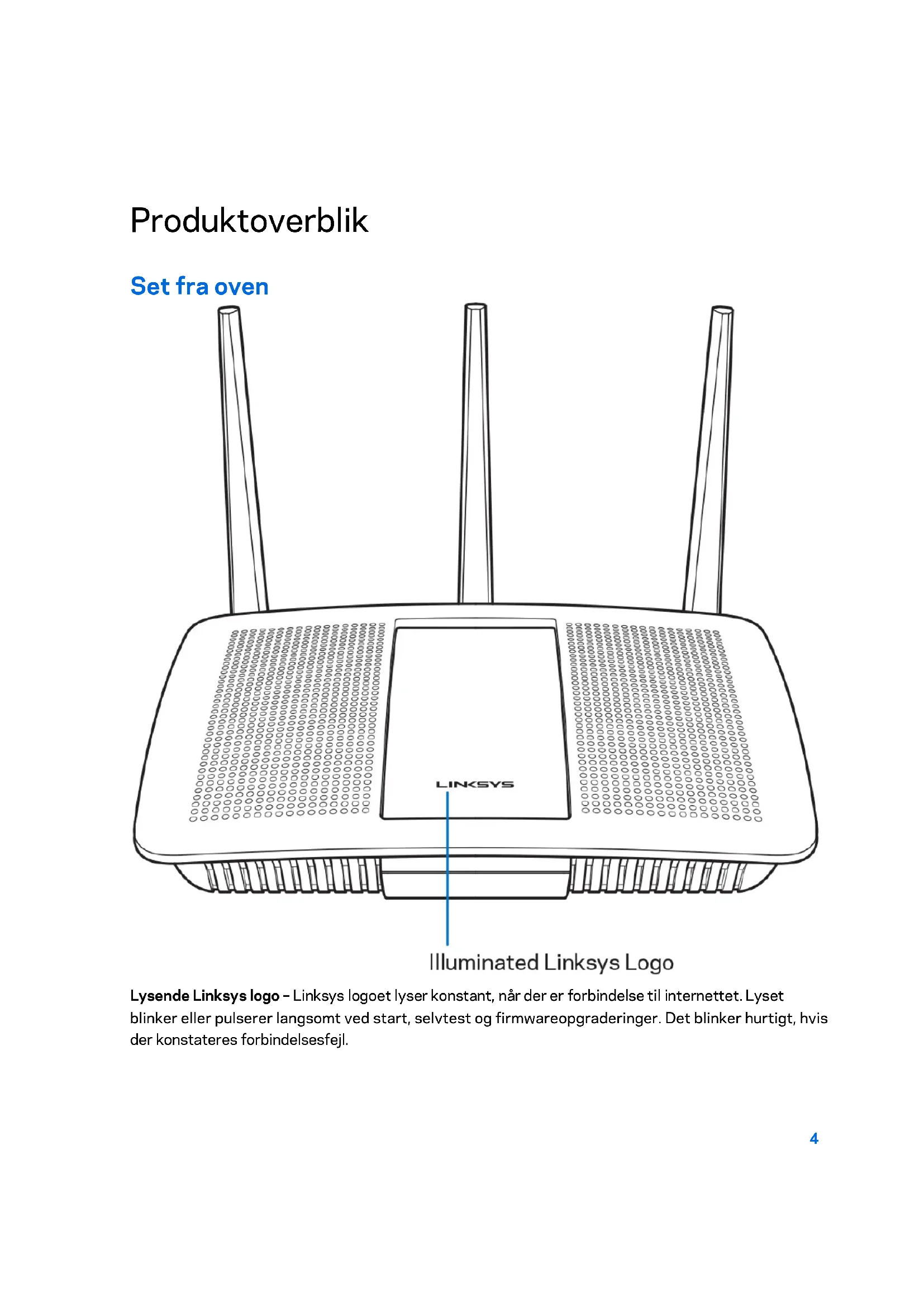 Linksys.com/support/EA7300 (dokumentation, download, spørgsmål/svar, teknisk support, chat, forummer) Bemærk – Licenser og meddelelser vedrørende tredjepartssoftware, som anvendes i dette produkt, kan ses på http://support.linksys.com/en-us/license. Se http://support.linksys.com/en- us/gplcodecenter, hvis du har spørgsmål eller ønsker GPL-kildekode. Installation af routeren