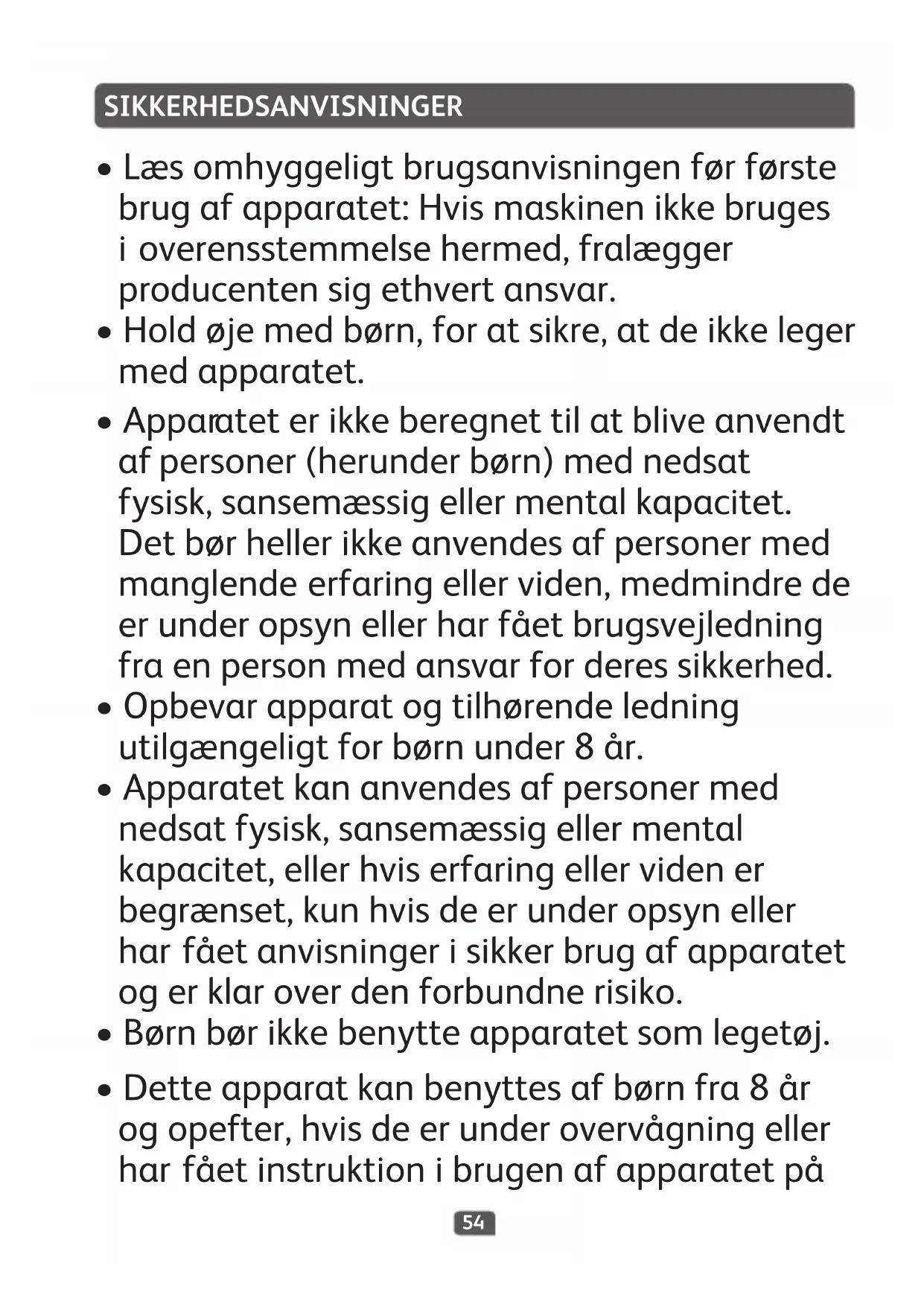 - Børnbørikkebenytteapparatetsomlegetøj.55 forsvarligmåde,ogerklaroverdenforbundne risiko.Rengøringogbrugervedligeholdelsebør ikkeudføresafbørn,medmindredeer8år ellermereogunderopsynafenvoksen.