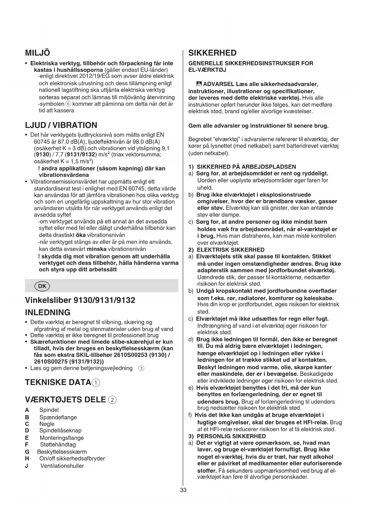 - Målt i henhold til EN 60745 er lydtryksniveauet for dette værktøj 87.0 dB(A) og lydeektniveauet 98.0 dB(A) (usikkerhed K = 3 dB),og vibrationen ved slibning af overader 9,1 (9130) / 7,7 (9131/9132) m/s² (triax vector sum; usikkerhed K = 1.5 m/s²) ! andre applikationer (som f.eks. skæring) kan have anderledes vibrations værdier