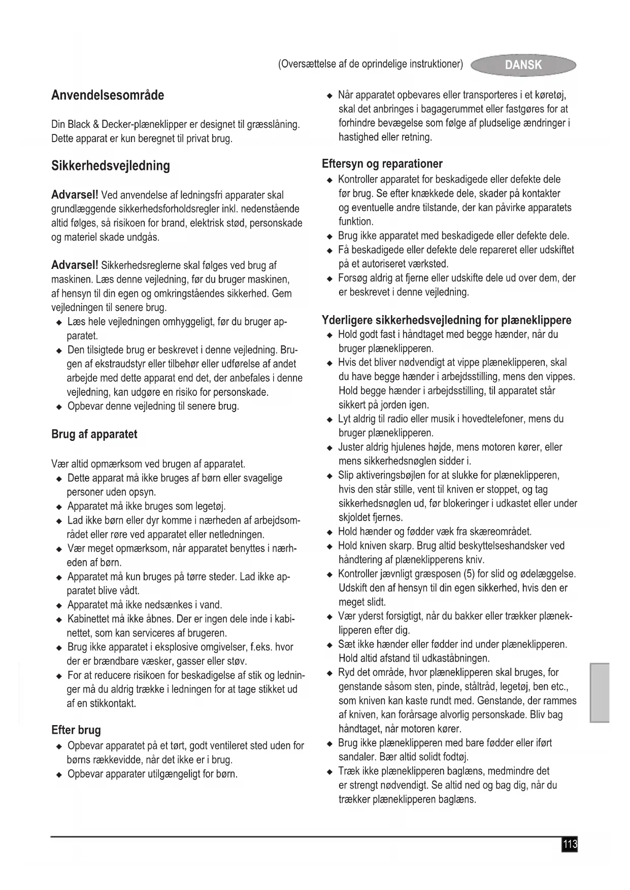 Garanti Black & Decker er trygg på kvaliteten på sine produkter og tilb- yr en enestående garanti. Denne garantierklæringen kommer i tillegg til dine lovbestemte rettigheter og er ikke i konikt med disse. Garantien er gyldig i EU- og EFTA-medlemsstatene. Hvis et Black & Decker-produkt går i stykker på grunn av material- og/eller fabrikasjonsfeil eller har mangler i forhold til spesikasjonene innen 24 måneder fra kjøpet, påtar Black & Decker seg å skifte ut defekte deler, reparere produkter som har vært utsatt for alminnelig slitasje, eller bytte ut slike produkter med minst mulig vanskelighet for kunden, med mindre: u Produktet har vært brukt i yrkes-/næringsvirksomhet eller til utleie. u Produktet har vært utsatt for feilaktig bruk eller dårlig vedlikehold. u Produktet har blitt skadet av fremmede gjenstander eller stoffer eller ved et uhell. u Andre enn autoriserte serviceverksteder eller Black & Deckers serviceteknikere har forsøk å reparere produktet. For å ta garantien i bruk må du vise kjøpskvittering til forhandleren eller til et autorisert serviceverksted. Du kan nne ut hvor nærmeste autoriserte serviceverksted er, ved å kontakte din lokale Black & Decker-avdeling på adressen som er oppgitt i denne håndboken. En oversikt over autoriserte Black & Decker-serviceverksteder og alle opplysninger om ettersalgsservice og kontakter er også tilgjengelig på Internett: www.2helpU.com Besøk vårt webområde www.blackanddecker.no for å registrere ditt nye Black & Decker-produkt og for å holde deg oppdatert om nye produkter og spesialtilbud. Du nner mer informasjon om Black & Decker og produktutvalget vårt på www.blackanddecker.no.113 (Oversættelse af de oprindelige instruktioner) DANSK Anvendelsesområde Din Black & Decker-plæneklipper er designet til græsslåning. Dette apparat er kun beregnet til privat brug. Sikkerhedsvejledning Advarsel! Ved anvendelse af ledningsfri apparater skal grundlæggende sikkerhedsforholdsregler inkl. nedenstående altid følges, så risikoen for brand, elektrisk stød, personskade og materiel skade undgås. Advarsel! Sikkerhedsreglerne skal følges ved brug af maskinen. Læs denne vejledning, før du bruger maskinen, af hensyn til din egen og omkringståendes sikkerhed. Gem vejledningen til senere brug. u Læs hele vejledningen omhyggeligt, før du bruger ap- paratet. u Den tilsigtede brug er beskrevet i denne vejledning. Bru- gen af ekstraudstyr eller tilbehør eller udførelse af andet arbejde med dette apparat end det, der anbefales i denne vejledning, kan udgøre en risiko for personskade. u Opbevar denne vejledning til senere brug. Brug af apparatet Vær altid opmærksom ved brugen af apparatet. u Dette apparat må ikke bruges af børn eller svagelige personer uden opsyn. u Apparatet må ikke bruges som legetøj. u Lad ikke børn eller dyr komme i nærheden af arbejdsom- rådet eller røre ved apparatet eller netledningen. u Vær meget opmærksom, når apparatet benyttes i nærh- eden af børn. u Apparatet må kun bruges på tørre steder. Lad ikke ap- paratet blive vådt. u Apparatet må ikke nedsænkes i vand. u Kabinettet må ikke åbnes. Der er ingen dele inde i kabi- nettet, som kan serviceres af brugeren. u Brug ikke apparatet i eksplosive omgivelser, f.eks. hvor der er brændbare væsker, gasser eller støv. u For at reducere risikoen for beskadigelse af stik og lednin- ger må du aldrig trække i ledningen for at tage stikket ud af en stikkontakt. Efter brug u Opbevar apparatet på et tørt, godt ventileret sted uden for børns rækkevidde, når det ikke er i brug. u Opbevar apparater utilgængeligt for børn. u Når apparatet opbevares eller transporteres i et køretøj, skal det anbringes i bagagerummet eller fastgøres for at forhindre bevægelse som følge af pludselige ændringer i hastighed eller retning. Eftersyn og reparationer u Kontroller apparatet for beskadigede eller defekte dele før brug. Se efter knækkede dele, skader på kontakter og eventuelle andre tilstande, der kan påvirke apparatets funktion. u Brug ikke apparatet med beskadigede eller defekte dele. u Få beskadigede eller defekte dele repareret eller udskiftet på et autoriseret værksted. u Forsøg aldrig at fjerne eller udskifte dele ud over dem, der er beskrevet i denne vejledning. Yderligere sikkerhedsvejledning for plæneklippere u Hold godt fast i håndtaget med begge hænder, når du bruger plæneklipperen. u Hvis det bliver nødvendigt at vippe plæneklipperen, skal du have begge hænder i arbejdsstilling, mens den vippes. Hold begge hænder i arbejdsstilling, til apparatet står sikkert på jorden igen. u Lyt aldrig til radio eller musik i hovedtelefoner, mens du bruger plæneklipperen. u Juster aldrig hjulenes højde, mens motoren kører, eller mens sikkerhedsnøglen sidder i. u Slip aktiveringsbøjlen for at slukke for plæneklipperen, hvis den står stille, vent til kniven er stoppet, og tag sikkerhedsnøglen ud, før blokeringer i udkastet eller under skjoldet fjernes. u Hold hænder og fødder væk fra skæreområdet. u Hold kniven skarp. Brug altid beskyttelseshandsker ved håndtering af plæneklipperens kniv. u Kontroller jævnligt græsposen (5) for slid og ødelæggelse. Udskift den af hensyn til din egen sikkerhed, hvis den er meget slidt. u Vær yderst forsigtigt, når du bakker eller trækker plænek- lipperen efter dig. u Sæt ikke hænder eller fødder ind under plæneklipperen. Hold altid afstand til udkaståbningen. u Ryd det område, hvor plæneklipperen skal bruges, for genstande såsom sten, pinde, ståltråd, legetøj, ben etc., som kniven kan kaste rundt med. Genstande, der rammes af kniven, kan forårsage alvorlig personskade. Bliv bag håndtaget, når motoren kører. u Brug ikke plæneklipperen med bare fødder eller iført sandaler. Bær altid solidt fodtøj. u Træk ikke plæneklipperen baglæns, medmindre det er strengt nødvendigt. Se altid ned og bag dig, når du trækker plæneklipperen baglæns.114 (Ove