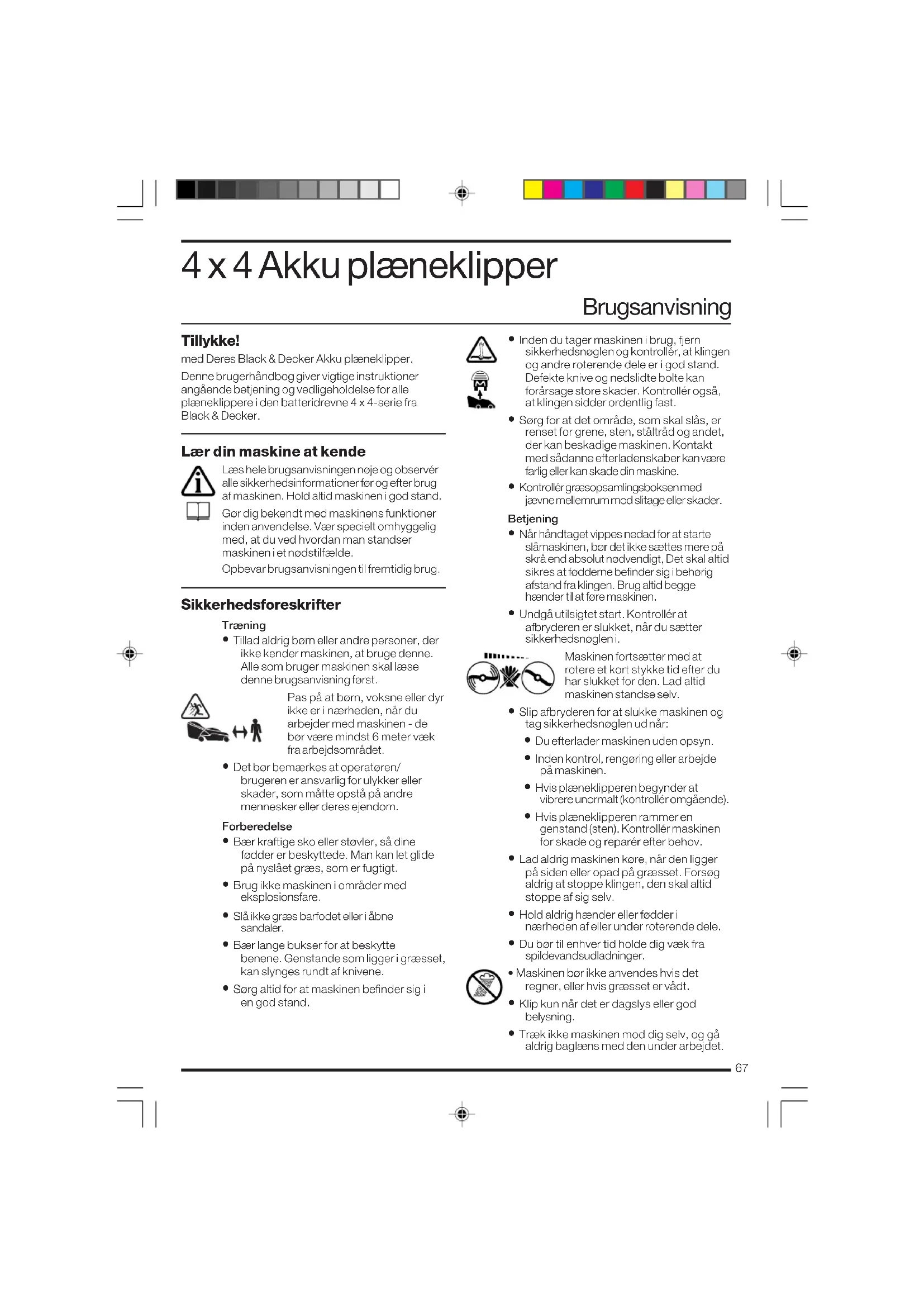 - Bemærk, at batteriet efter en længerevarende opbevaring kun kan opnå fuld kapacitet efter flere afladnings- og opladningsomgange. Fejlsøgning Hvis maskinen ikke fungerer rigtigt, brug da nedenstående oversigt for at lokalisere fejlen. Problem Afhjælpning Maskinen starter ikke (a) Kontrollér at når udløserstangen sikkerhedsnøglen er sat aktiveres. korrekt i. (b) Tag sikkerhedsnøglen ud. Læg maskinen på siden og kontrollér, at klingen roterer frit. (c) Kontrollér, at batteriet er fuldt opladet. (d) Kontrollér at sikringen ikke er sprunget. Maskinen standser (a) Tag sikkerhedsnøglen ud under slåningen. og kontrollér, at klingen roterer frit. (b) Hæv klippehøjden og start plæneklipperen. (c) Kontroller om batteriet er helt opladet. (d) Kontrollér sikkerhedsnøglens sikringsforbindelse; hvis den er knækket, er sikringen sprunget og skal udskiftes. Plæneklipperen kører men (a) Kontrollér om batteriet slår ikke græsset ordentligt. er helt opladet. (b) Batteriet skal måske udskiftes. Henvis til afsnittet “Bortskaffelse af batteri”.73 Plæneklipperen er svær (a) Hæv klippehøjden for at at skubbe. reducere trækning på græsset. Kontrollér om hvert hjul roterer frit. Plæneklipperen vibrerer (a) Tag sikkerhedsnøglen og larmer unormalt. ud. Læg maskinen på siden og undersøg om klingen er beskadiget. Hvis klingen er beskadiget, bør den udskiftes med en ny fra Black & Decker. (b) Hvis der ikke findes synlige skader på klingen eller undersiden af plæneklipperen, bør den returneres til dit lokale servicecenter eller en autoriseret forhandler. Advarsel! Tag altid sikkerhedsnøglen ud inden der udføres eventuelt eftersyn. Miljø Værktøj Når dit værktøj er udtjent, beskyt da naturen ved ikke at smide det ud sammen med det almindelige affald. Aflevér det til de opsamlingssteder, der findes i din kommune eller der hvor du købte værktøjet. Batterier