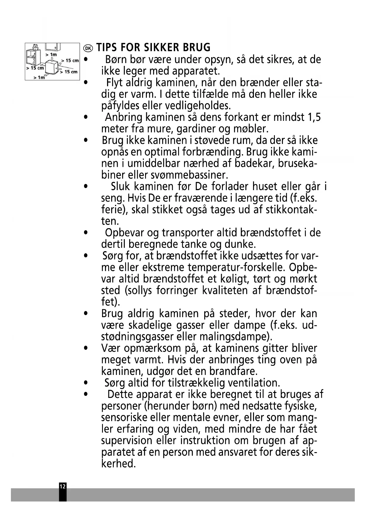 ). Du må ikke foretage ændringer af sikker- hedssystemet, da garantien for, at luftmåleren fungerer korrekt, derved bortfal- der. Kontakt forhandleren, hvis du har spørgsmål. Særlige oplysninger for brugere i Frankrig: Kaminen er fremstillet til kun at blive brugt med brændstof, der er beregnet til flytbare kaminer, som fyrer med flyden- de brændstof, i henhold til de franske dekreter af 18-07-2002 og 25-06-2010. Det er forbudt at bruge andre former for brændstof. Kontakt din forhandler, eller find adresser på forhandlere på vores websted. Denne flytbare kamin, der fyrer med flydende brændstof, er beregnet til brug som en ekstra varmekilde og ikke som en konstant varmekilde. Særlige oplysninger for brugere i Storbritannien: Brug kun Klasse C1 petroleum i henhold til BS2869 Del 2 eller lignende. Brugeren skal overholde følgende anvisninger om korrekt brug: UNDLAD AT - bruge den flytbare kamin, der fyrer med flydende brændstof, i campingvogne, både og førerhuse. - bruge den flytbare kamin, der fyrer med flydende brændstof, i lokaler med util- strækkelig ventilation (se minimummålene for det lokale, der skal opvarmes i skemaet med specifikationer) samt lokaler, der ligger under jordhøjde og/eller i en højde på over 1.000 meter - ændre kaminens sikkerhedsfunktioner. Anvendelse af denne type opvarmning på offentlige steder kræver forudgående til- ladelse fra myndighederne. Indhent korrekte oplysninger, før kaminen tages i brug.