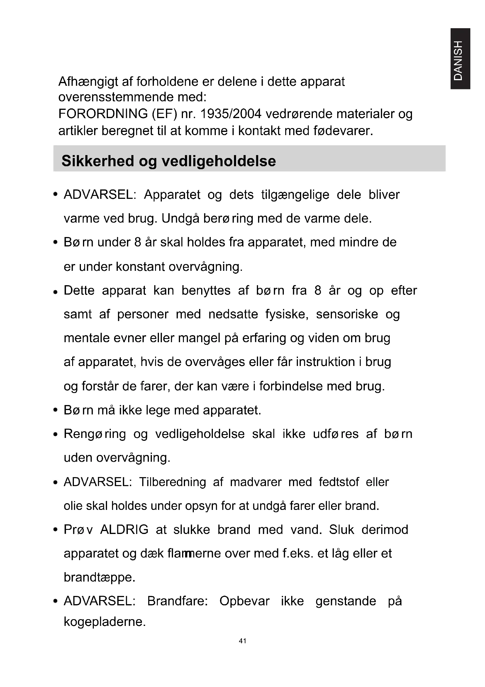 Enhver form for spild bør fjernes fra låget før åbning. Kogepladens overflade skal køle af, før låget lukkes. Efter brug , sluk da kogepladene elementer på deres kontrolknapper i stedet for at stole på detektoren . Apparatet er ikke beregnet til at blive betjent via en ekstern timer eller et særskilt fjernbetjeningssystem .