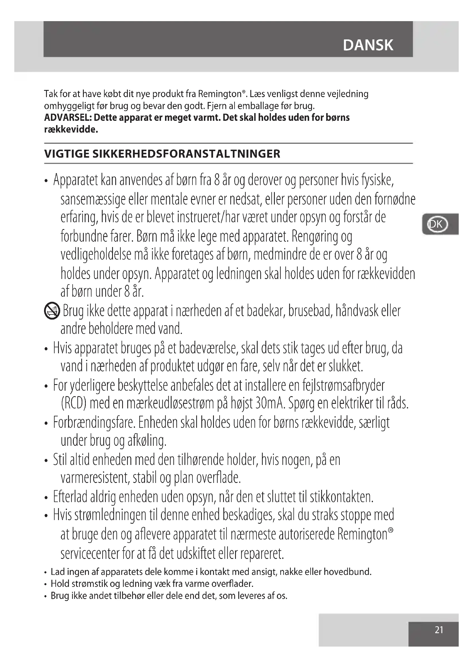 - Hvis strømledningen til denne enhed beskadiges, skal du straks stoppe med at bruge den og aflevere apparatet til nærmeste autoriserede Remington® servicecenter for at få det udskiftet eller repareret.