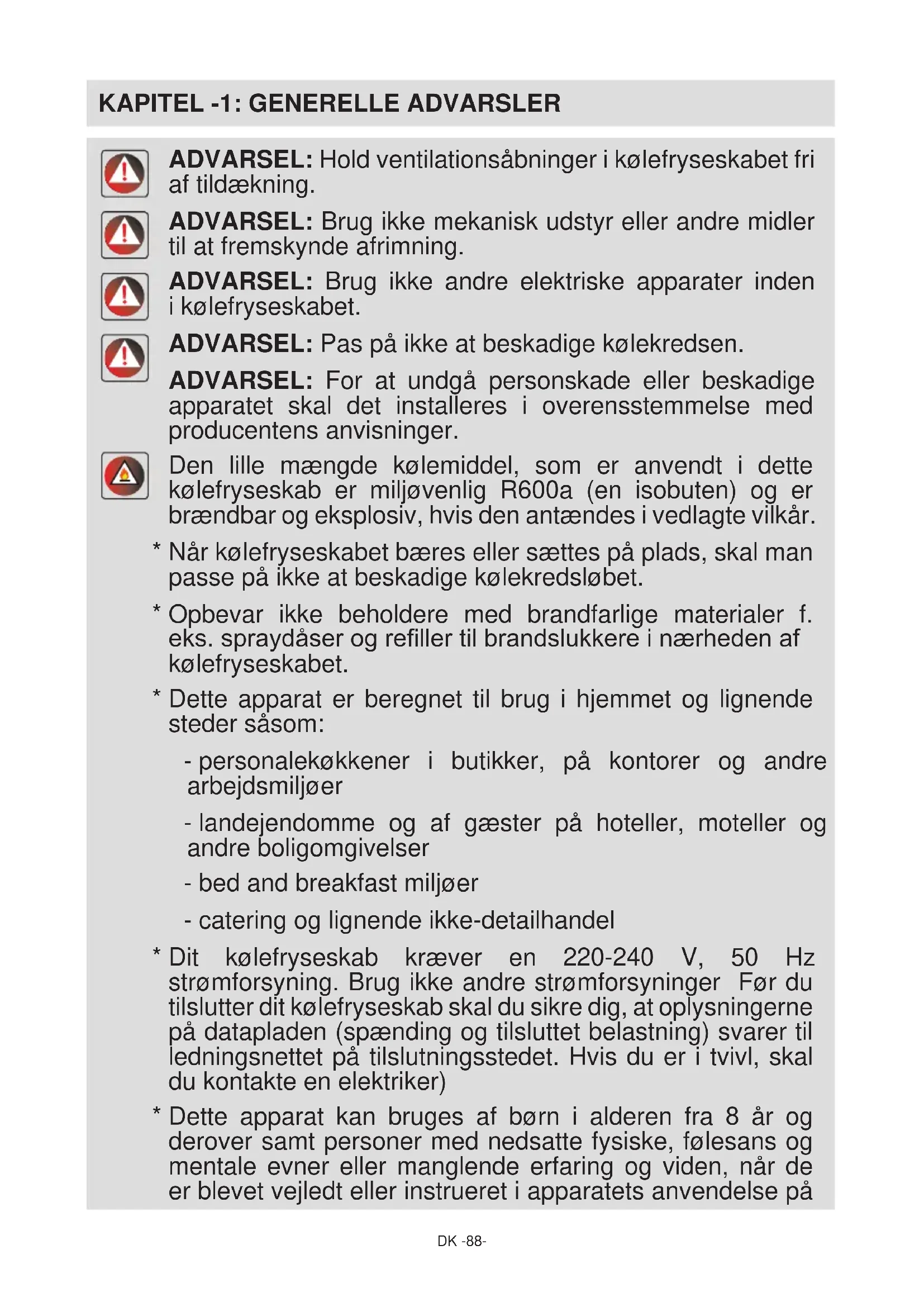 - Dette apparat er fremstillet til brug i hjem, og det er kun egnet til afkøling/opbevaring af fødevarer. Det er ikke velegnet til kommerciel eller fælles brug og/eller til opbevaring af andet end fødevarer. Firmaet er ikke ansvarligt for tab, der opstår, hvis det modsatte er tilfældet. Sikkerhedsadvarsler