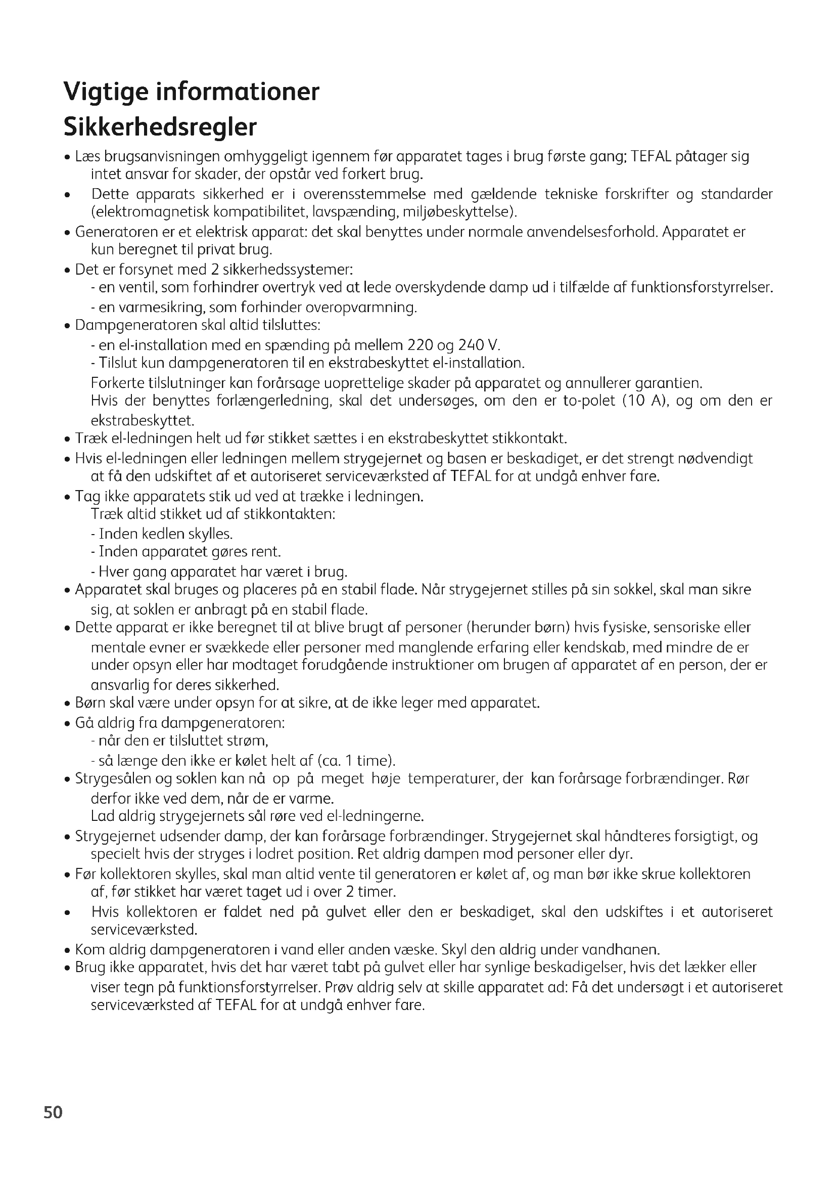 - Læs brugsanvisningen omhyggeligt igennem før apparatet tages i brug første gang; TEFAL påtager sig intet ansvar for skader, der opstår ved forkert brug.
