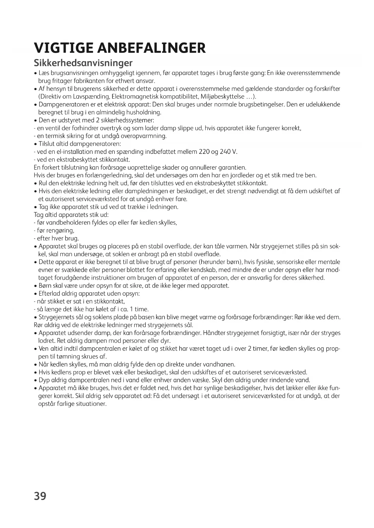 - Dampgeneratoren er et elektrisk apparat: Den skal bruges under normale brugsbetingelser. Den er udelukkende beregnet til brug i en almindelig husholdning.