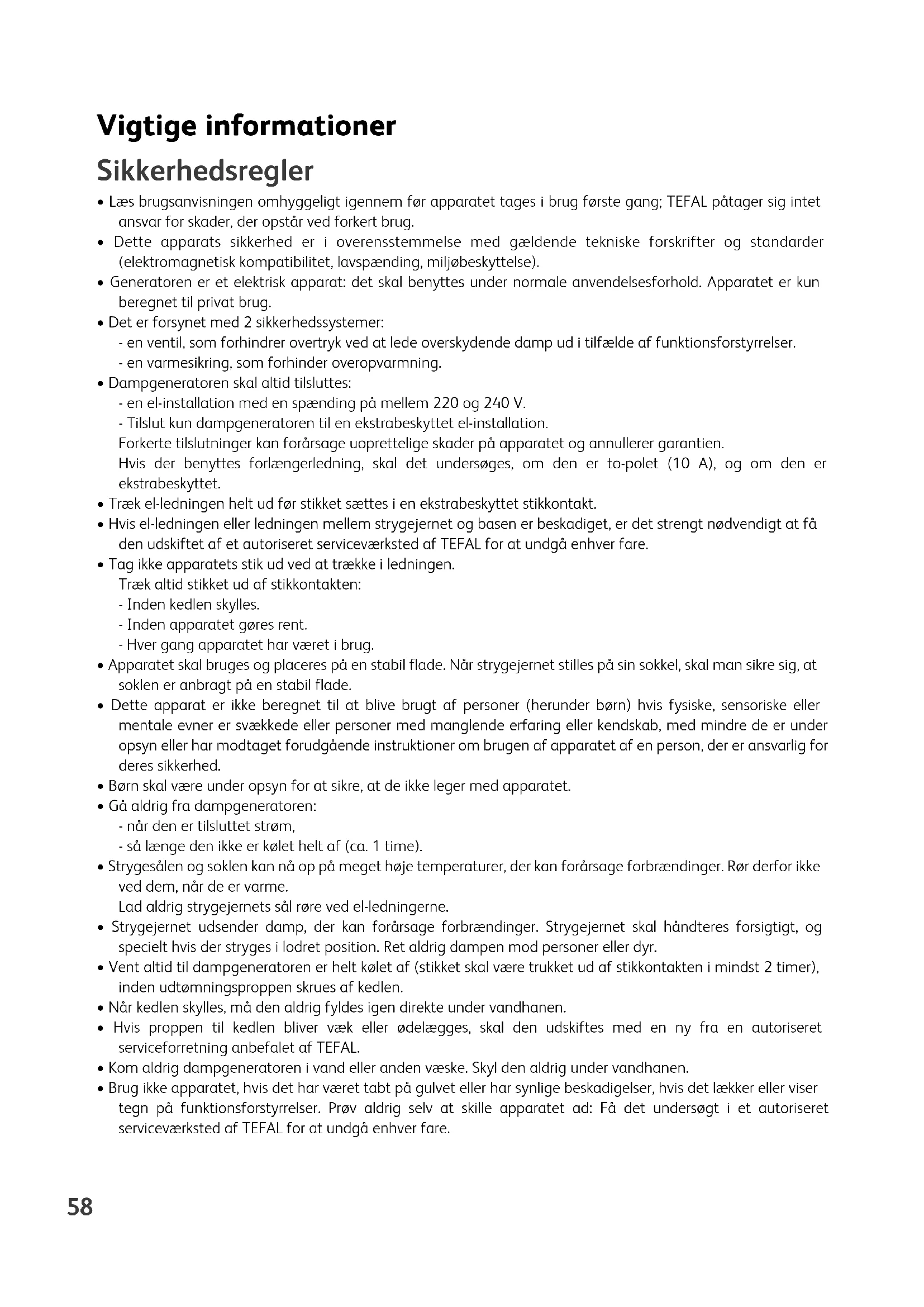 - Læs brugsanvisningen omhyggeligt igennem før apparatet tages i brug første gang; TEFAL påtager sig intet ansvar for skader, der opstår ved forkert brug.