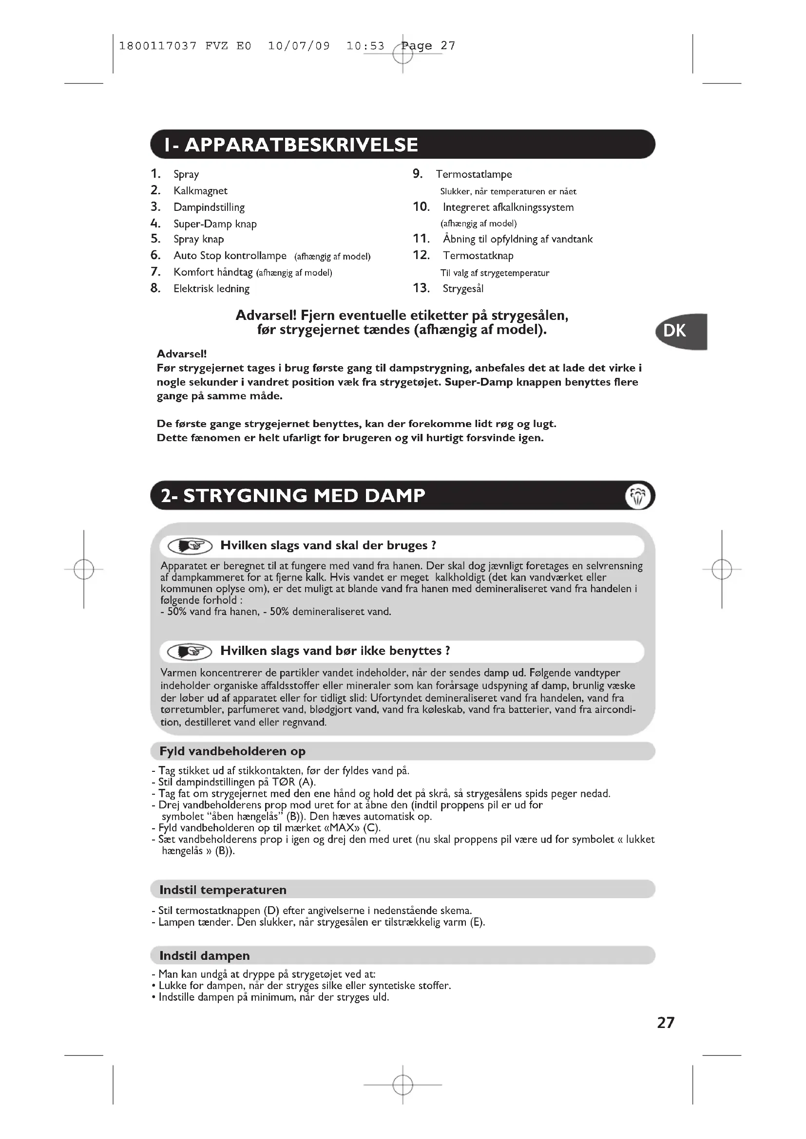Hvilken slags vand skal der bruges ? Apparatet er beregnet til at fungere med vand fra hanen. Der skal dog jævnligt foretages en selvrensningaf dampkammeret for at fjerne kalk. Hvis vandet er meget kalkholdigt (det kan vandværket eller kommunen oplyse om), er det muligt at blande vand fra hanen med demineraliseret vand fra handelen ifølgende forhold :- 50% vand fra hanen, - 50% demineraliseret vand. Hvilken slags vand bør ikke benyttes ? Varmen koncentrerer de partikler vandet indeholder, når der sendes damp ud. Følgende vandtyperindeholder organiske affaldsstoffer eller mineraler som kan forårsage udspyning af damp, brunlig væskeder løber ud af apparatet eller for tidligt slid: Ufortyndet demineraliseret vand fra handelen, vand fratørretumbler, parfumeret vand, blødgjort vand, vand fra køleskab, vand fra batterier, vand fra aircondi-tion, destilleret vand eller regnvand. Advarsel!Før strygejernet tages i brug første gang til dampstrygning, anbefales det at lade det virke inogle sekunder i vandret position væk fra strygetøjet. Super-Damp knappen benyttes fleregange på samme måde.De første gange strygejernet benyttes, kan der forekomme lidt røg og lugt.Dette fænomen er helt ufarligt for brugeren og vil hurtigt forsvinde igen. Advarsel! Fjern eventuelle etiketter på strygesålen, før strygejernet tændes (afhængig af model).
