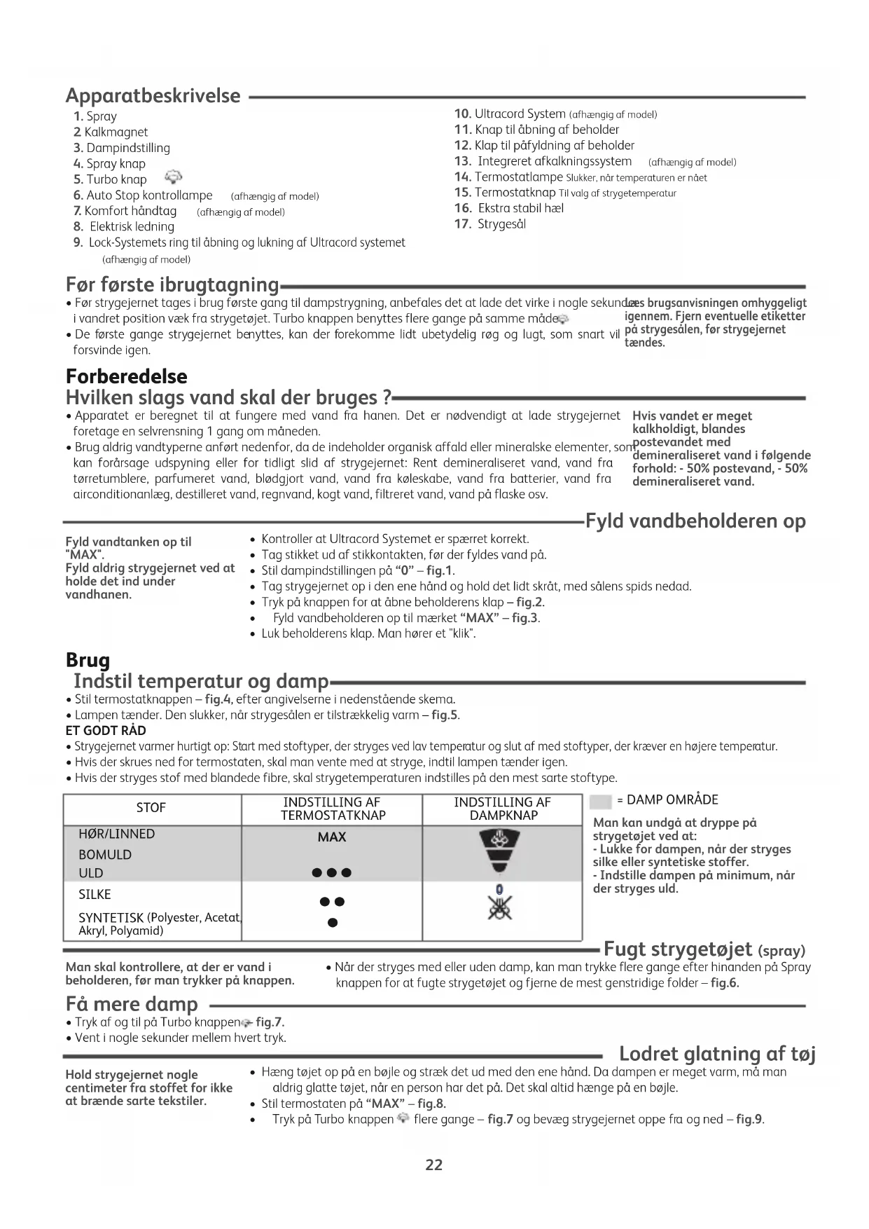 - Tryk på Turbo knappen flere gange – fig.7 og bevæg strygejernet oppe fra og ned – fig.9. Læs brugsanvisningen omhyggeligtigennem. Fjern eventuelle etiketterpå strygesålen, før strygejernettændes.Hvis vandet er megetkalkholdigt, blandespostevandet meddemineraliseret vand i følgendeforhold: - 50% postevand, - 50%demineraliseret vand.Fyld vandtanken op til"MAX".Fyld aldrig strygejernet ved atholde det ind undervandhanen. STOF INDSTILLING AF TERMOSTATKNAP INDSTILLING AF DAMPKNAP