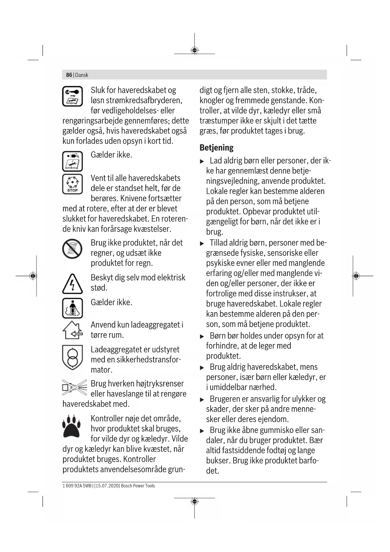 Om de gebruiksduur te verlengen, kunt u via een erkende klantenservice voor Bosch tuingereedschappen een extra accu aanschaffen. Storingen opsporen Symptoom Mogelijke oorzaak Oplossing Motor start niet Interne bekabeling van tuingereedschap defect Neem contact op met de klantenservice van Bosch Accu leeg Laad de accu op Bosch Power Tools 1 609 92A 5WB | (15.07.2020)84 | Nederlands Symptoom Mogelijke oorzaak Oplossing Accu te koud of te heet Accu laten opwarmen of afkoelen Gras te lang Max. toegestane grashoogte is 30cm met de grootste maaihoogte-instelling Motorbeveiliging aangesproken Laat de motor afkoelen en stel een grotere maai- hoogte in Stroomkringonderbreker is niet goed of niet volle- dig ingezet Goed inzetten Tuingereedschap loopt met onderbrekingen Interne bekabeling van tuingereedschap defect Neem contact op met de klantenservice van Bosch Motorbeveiliging aangesproken Laat de motor afkoelen en stel een grotere maai- hoogte in Tuingereedschap laat onregelmatig maai- beeld achter en/of motor werkt moeilijk Maaihoogte te laag Grotere maaihoogte instellen Messen bot Messen vervangen (zie afbeelding K) Verstopping mogelijk Tuingereedschap uitschakelen en stroomkringon- derbreker losmaken Onderzijde van het tuingereedschap controleren en indien nodig vrij maken (draag altijd tuinhand- schoenen) Mes omgekeerd gemonteerd Mes goed monteren Na het inschakelen van het tuingereedschap draait het mes niet Mes wordt gehinderd door gras Tuingereedschap uitschakelen en stroomkringon- derbreker losmaken Verstopping verwijderen (draag altijd tuinhand- schoenen) Moer of schroef van mes los Draai de moer of de schroef van het mes vast (27Nm) Sterke trillingen of ge- luiden Moer of schroef van mes los Draai de moer of de schroef van het mes vast (27Nm) Mes beschadigd Mes vervangen (zie afbeelding K) Accu en oplaadapparaat Symptomen Mogelijke oorzaak Oplossing Rode accuoplaadindi- catie knippert op op- laadapparaat Opladen niet mogelijk Accu niet of niet juist geplaatst Accu juist op oplaadapparaat plaatsen Accucontacten vuil Reinig de accucontacten, bijvoorbeeld door de accu enkele keren te plaatsen en te verwijderen, of vervang de accu indien nodig Accu defect Vervang de accu Accuoplaadindicaties branden niet op het op- laadapparaat Netstekker van het oplaadapparaat niet (of niet goed) vast gestoken Steek de stekker (volledig) in het stopcontact Stopcontact, netsnoer of oplaadapparaat defect Netspanning controleren, oplaadapparaat indien nodig door een erkende klantenservice voor Bosch elektrische gereedschappen laten contro- leren Onderhoud en service Onderhoud van de accu u Let op! Schakel het tuingereedschap uit, maak de stroomkringonderbreker los en verwijder accu en graszak voordat u onderhouds- of reinigingswerk- zaamheden uitvoert. u Draag altijd tuinhandschoenen wanneer u de scherpe messen vastpakt of eraan werkt. Neem de volgende aanwijzingen en maatregelen in acht om een optimaal gebruik van de accu te waarborgen: – Bescherm de accu tegen vocht en water. 1 609 92A 5WB | (15.07.2020) Bosch Power ToolsDansk | 85 – Bewaar het tuingereedschap en de accu alleen in het tem- peratuurbereik tussen –20en 50 °C. Laat de accu bij- voorbeeld in de zomer niet in de auto liggen. – Bewaar de accu apart en niet in het tuingereedschap. – Laat de accu bij fel zonlicht niet in het tuingereedschap zitten. – De optimale temperatuur voor het bewaren van de accu bedraagt 5°C. – Reinig de ventilatieopeningen van de accu af en toe met een zachte, schone en droge kwast. Een duidelijk kortere gebruiksduur na het opladen geeft aan dat de accu versleten is en moet worden vervangen. Klantenservice en gebruiksadvies Onze klantenservice beantwoordt uw vragen over reparatie en onderhoud van uw product en over vervangingsonderde- len. Explosietekeningen en informatie over vervangingson- derdelen vindt u ook op: www.bosch-pt.com Het Bosch-gebruiksadviesteam helpt u graag bij vragen over onze producten en accessoires. Vermeld bij vragen en bestellingen van vervangingsonderde- len altijd het uit tien cijfers bestaande productnummer vol- gens het typeplaatje van het product. Nederland Tel.: (076) 579 54 54 Fax: (076) 579 54 94 E-mail: gereedschappen@nl.bosch.com Meer serviceadressen vindt u onder: www.bosch-pt.com/serviceaddresses Transport Op de meegeleverde Lithium-Ion-accu’s zijn de eisen voor het vervoer van gevaarlijke stoffen van toepassing. De accu’s kunnen door de gebruiker zonder verdere voorwaarden over de weg worden vervoerd. Bij verzending door derden (bijv. luchtvervoer of vervoers- bedrijf) moeten bijzondere eisen ten aanzien van verpakking en markering in acht worden genomen. In deze gevallen moet bij de voorbereiding van de verzending een deskundige voor gevaarlijke goederen worden geraadpleegd. Verzend accu’s alleen als de behuizing onbeschadigd is. Plak blootliggende contacten af en verpak de accu zodanig dat deze niet in de verpakking beweegt. Neem ook eventuele bij- komende nationale voorschriften in acht. Afvalverwijdering Tuingereedschappen, accu’s, toebehoren en verpakkingen moeten op een voor het milieu verantwoorde wijze worden hergebruikt. Gooi tuingereedschappen, accu’s en batterijen niet bij het huisvuil. Alleen voor landen van deEU: Volgens de Europese richtlijn 2012/19/EU moeten niet meer bruikbare elektrische en elektronische apparaten en volgens de Europese richtlijn 2006/66/EG moeten defecte of lege accu’s en batterijen apart worden ingezameld en op een voor het milieu verantwoorde wijze worden hergebruikt. Accu’s en batterijen: Li-ion: Lees de aanwijzingen in het gedeelte Vervoer en neem deze in acht. Dansk Sikkerhedsinstrukser Bemærk! Læs efterfølgende instruk- ser omhyggeligt. Gør dig fortrolig med produktets betjeningsanord- ninger og korrekte anvendelse. Op- bevar betjeningsvejledningen et sik- kert sted til senere brug. Forklaring af symboler på haveredskabet Generel sikkerhedsadvarsel. Læs brugsanvisningen. Pas på, at personer i nærhe- den ikke 