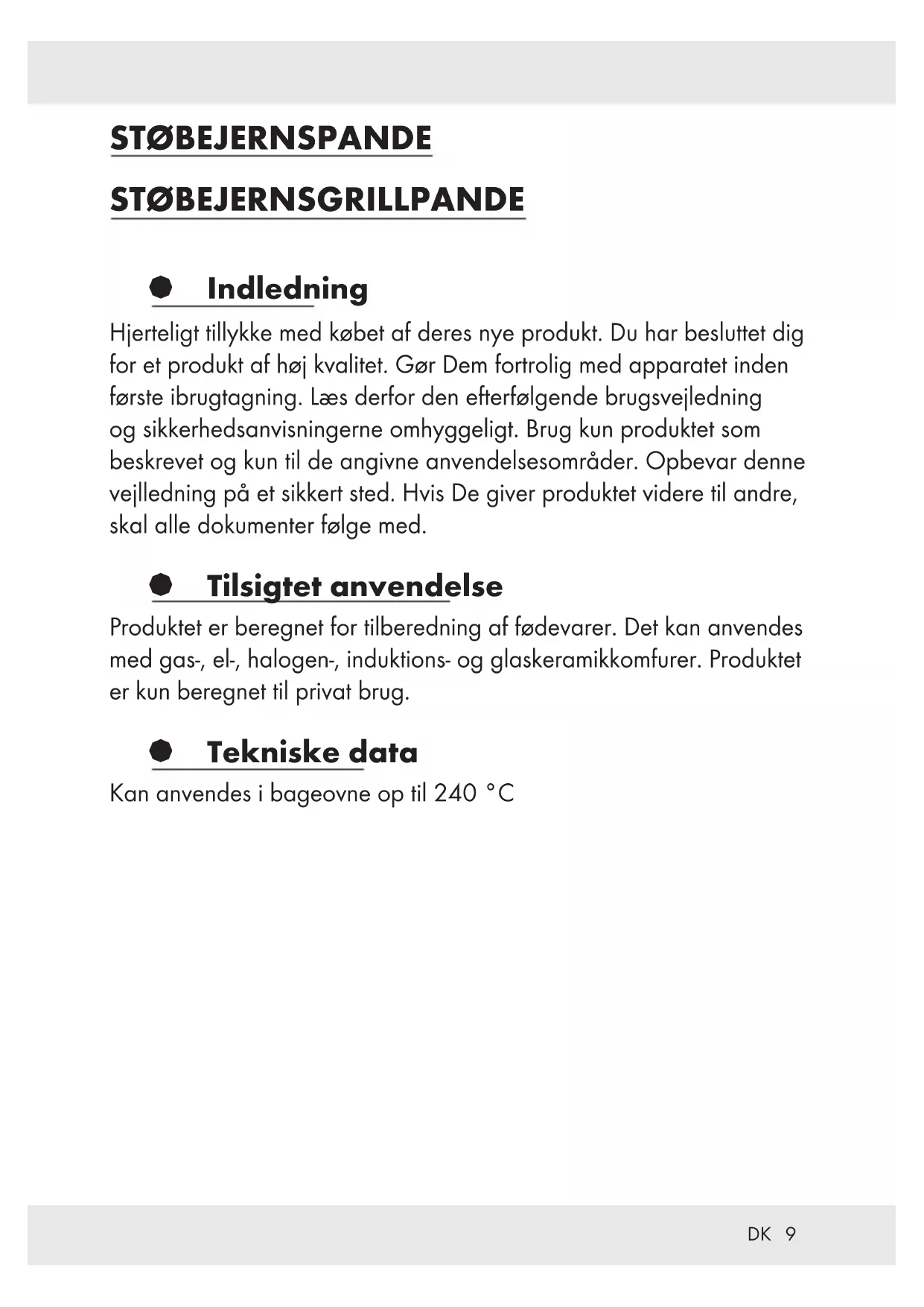 STØBEJERNSPANDE STØBEJERNSGRILLPANDE § Indledning Hjerteligt tillykke med købet af deres nye produkt. Du har besluttet dig for et produkt af høj kvalitet. Gør Dem fortrolig med apparatet inden første ibrugtagning. Læs derfor den efterfølgende brugsvejledning og sikkerhedsanvisningerne omhyggeligt. Brug kun produktet som beskrevet og kun til de angivne anvendelsesområder. Opbevar denne vejlledning på et sikkert sted. Hvis De giver produktet videre til andre, skal alle dokumenter følge med. § Tilsigtet anvendelse Produktet er beregnet for tilberedning af fødevarer. Det kan anvendes med gas-, el-, halogen-, induktions- og glaskeramikkomfurer. Produktet er kun beregnet til privat brug. § Tekniske data Kan anvendes i bageovne op til 240 °C10