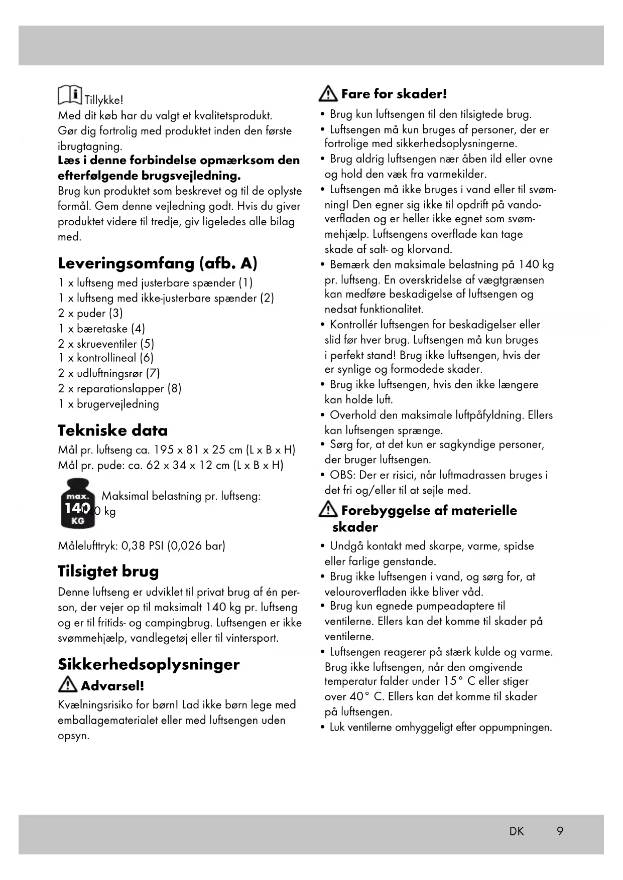 Maksimal belastning pr. luftseng: 140 kg Målelufttryk: 0,38 PSI (0,026 bar) Tilsigtet brug Denne luftseng er udviklet til privat brug af én per- son, der vejer op til maksimalt 140 kg pr. luftseng og er til fritids- og campingbrug. Luftsengen er ikke svømmehjælp, vandlegetøj eller til vintersport. Sikkerhedsoplysninger Advarsel! Kvælningsrisiko for børn! Lad ikke børn lege med emballagematerialet eller med luftsengen uden opsyn. Fare for skader!
