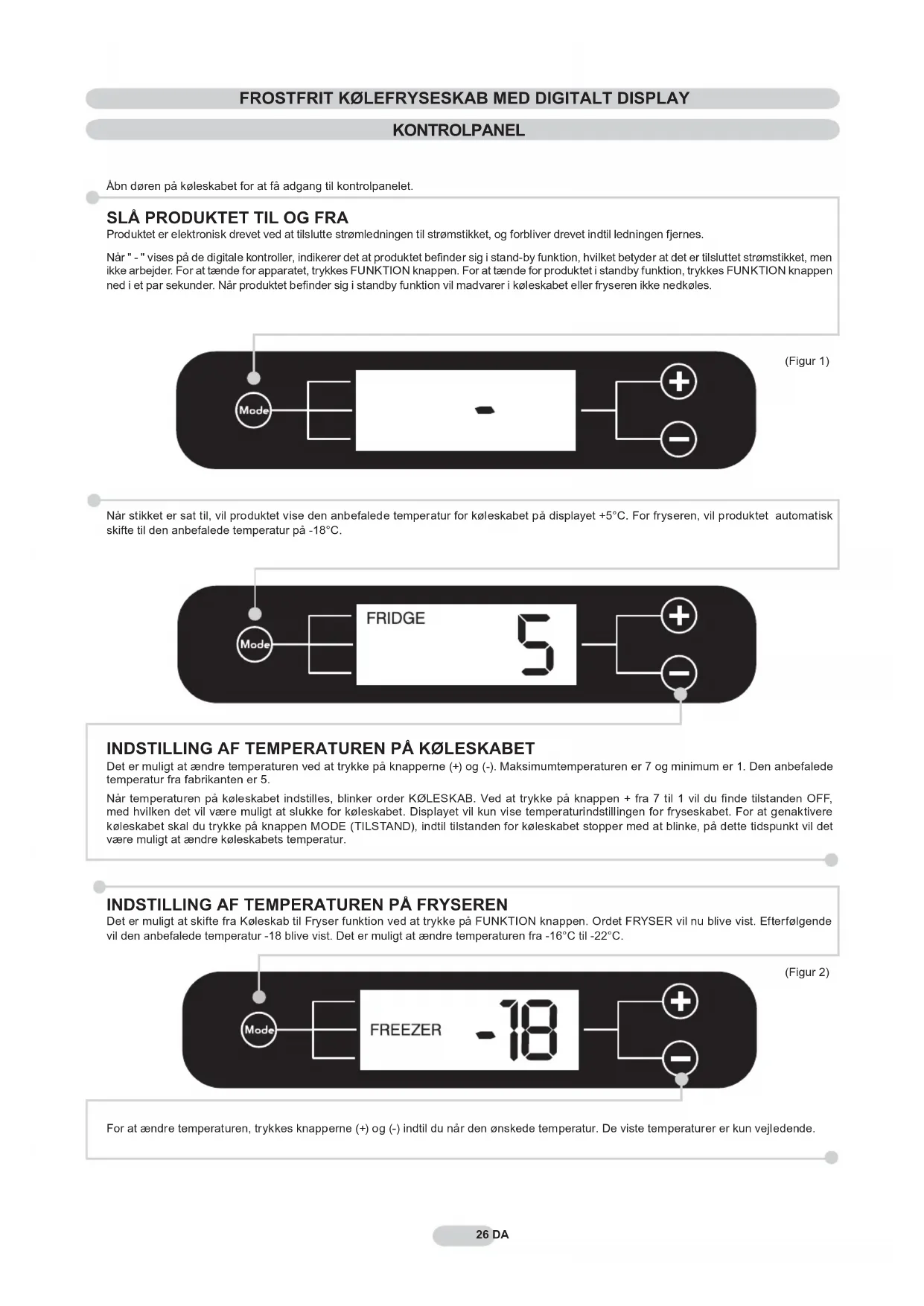 Det er muligt at skifte fra Køleskab til Fryser funktion ved at trykke på FUNKTION knappen. Ordet FRYSER vil nu blive vist. Efterfølgende vil den anbefalede temperatur -18 blive vist. Det er muligt at ændre temperaturen fra -16°C til -22°C. For at ændre temperaturen, trykkes knapperne (+) og (-) indtil du når den ønskede temperatur. De viste temperaturer er kun vejledende. (Figur 1) (Figur 2) 26 IT26 DA Når stikket er sat til, vil produktet vise den anbefalede temperatur for køleskabet på displayet +5°C. For fryseren, vil produktet automatisk skifte til den anbefalede temperatur på -18°C.27 DA