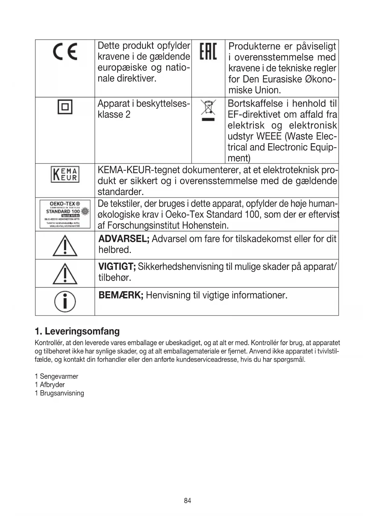 Kontrollér, at den leverede vares emballage er ubeskadiget, og at alt er med. Kontrollér før brug, at apparatet og tilbehøret ikke har synlige skader, og at alt emballagemateriale er fjernet. Anvend ikke apparatet i tvivlstil- fælde, og kontakt din forhandler eller den anførte kundeserviceadresse, hvis du har spørgsmål. 1 Sengevarmer 1 Afbryder 1 Brugsanvisning85