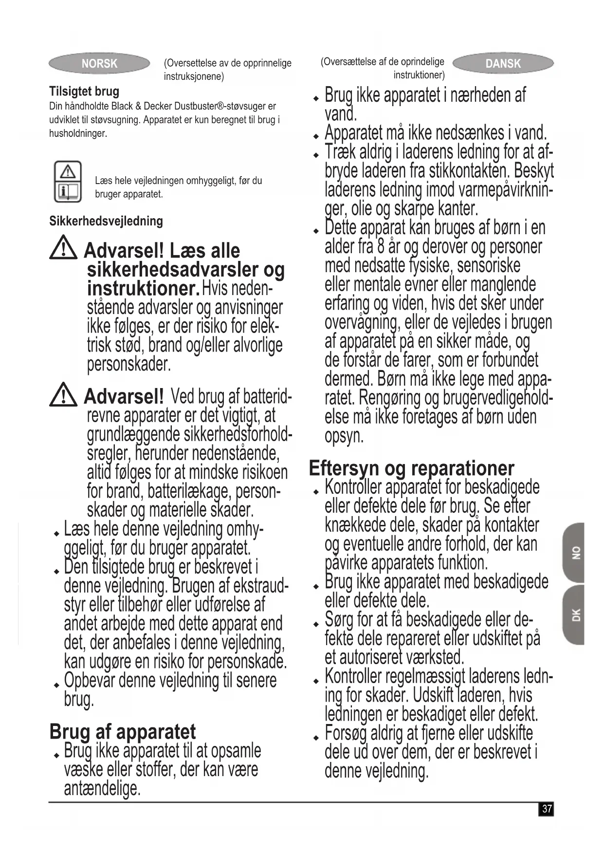 Ved separat bortskaffelse af brugte produkter og emballage bliver der mulighed for at genanvende forskellige materialer. Genanvendelse af materialer medvirker til at forebygge miljøforurening og mind- sker behovet for råstoffer. Lokal lovgivning kan kræve separat indsamling af elektriske husholdningsapparater på kommunale affaldsdepoter eller af den detailhandlende ved køb af et nyt produkt.40 (Oversættelse af de oprindelige instruktioner) DANSK Black & Decker sørger for at indsamle og genanvende Black & Decker-produkter, når disse ikke længere kan bruges. Hvis du vil benytte dig af denne service, skal du returnere produktet til et autoriseret værksted, der indsamler produkterne for os. Kontakt det lokale Black & Decker-kontor på den adresse, der er angivet i denne vejledning, for at få oplysninger om nærmeste autoriserede værksted. En liste over alle autoris- erede Black & Decker-serviceværksteder samt servicevilkår og kontaktpersoner er tilgængelig på internettet på adressen: www.2helpU.com Garanti Black & Decker garanterer, at produktet er fri for skader og fejl og tilbyder en fremragende garanti. Garantien er et tillæg til forbrugerens lovsikrede rettigheder og påvirker ikke disse. Ga- rantien gælder inden for medlemsstaterne af den Europæiske Union og i det Europæiske Frihandelsområde. Hvis et Black & Decker-produkt går i stykker på grund af materiel skade og/eller fabrikationsfejl eller på anden måde ikke fungerer i overensstemmelse med specikationen inden for 24 måneder fra købsdatoen, påtager Black & Decker sig at reparere eller ombytte produktet med mindst mulig ulempe for kunden. Garantien gælder ikke for fejl og mangler, der er sket i forbindelse med: u Produktet har været anvendt erhvervsmæssigt eller til udlejning. u Produktet har været anvendt forkert eller er ikke vedlige- holdt. u Produktet er beskadiget af fremmedlegemer, substanser eller pga. uheld. u Garantien gælder ikke, hvis reparationer er udført af andre end et autoriseret Black & Decker-værksted. For at udnytte garantien skal produktet og købskvitteringen indleveres til forhandleren eller til et autoriseret værksted. Kontakt det lokale Black & Decker-kontor på den adresse, der er opgivet i denne vejledning, for at få oplysninger om nærmeste autoriserede værksted. En liste over alle autoris- erede Black & Decker-serviceværksteder samt servicevilkår og kontaktpersoner er tilgængelig på internettet på adressen: www.2helpU.com Gå venligst ind på vores website www.blackanddecker.dk for at registrere dit nye produkt og for at blive holdt ajour om nye produkter og specialtilbud. Der ndes yderligere oplysninger om mærket Black & Decker og vores produktsortiment på adressen www.blackanddecker.dk Husk at registrere dit produkt! www.blackanddecker.dk/productregistration Registrer dit produkt online på www.blackanddecker.dk/productregistration, eller send dit navn, efternavn og produktkoden til Black & Decker i dit land. Käyttötarkoitus Black & Decker Dustbuster® -rikkaimuri on tarkoitettu imurointiin. Laite on tarkoitettu ainoastaan kotitalouskäyttöön. Lue nämä ohjeet huolellisesti ennen laitteen käyttöä. Turvallisuusohjeet