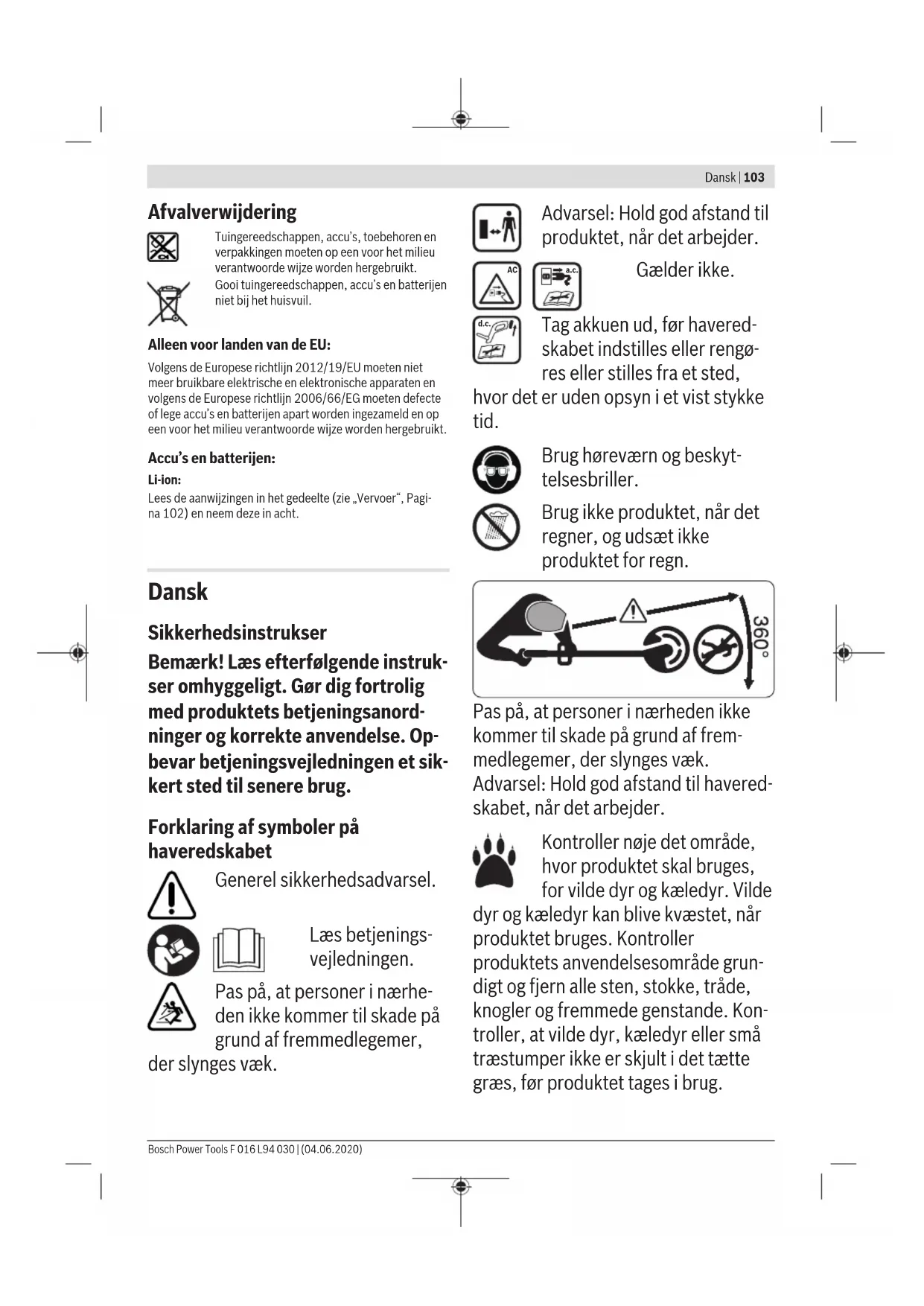 u Oplad kun akkuer i ladeaggrega- ter, der er anbefalet af fabrikan- ten. Et ladeaggregat, der er egnet til en bestemt type akkuer, må ikke be- nyttes med andre akkuer, da dette er forbundet med brandfare. u Brug kun de akkuer, der er bereg- net til haveredskaberne. Brug af andre akkuer kan føre til kvæstelser og er forbundet med brandfare. F 016 L94 030 | (04.06.2020) Bosch Power ToolsDansk | 107 u Ikke benyttede akkuer må ikke komme i berøring med kon- torclips, mønter, nøgler, søm, skruer eller andre små metalgen- stande, da disse kan kortslutte kontakterne. En kortslutning mel- lem akku-kontakterne øger risikoen for personskader i form af forbræn- dinger eller brand. u Hvis akkuen anvendes forkert, kan der slippe væske ud af akkuen. Undgå at komme i kontakt med denne væske. Hvis det alligevel skulle ske, skylles med vand. Søg læge, hvis væsken kommer i øjne- ne. Udstrømmende akku-væske kan give hudirritation eller forbrændin- ger. u Brug ikke akkuer eller værktøj, som er beskadiget eller modifice- ret. Beskadigede eller modificerede akkuer kan opføre sig uforudsigeligt og forårsage brand, eksplosion eller fare for personskade. u Akkuer eller værktøj må ikke ud- sættes for ild eller meget høje temperaturer. Ild eller temperaturer over 130°C kan medføre eksplosion. u Følg alle instruktioner for oplad- ning. Akkuen må ikke oplades ved temperaturer uden for det områ- de, der er angivet i instruktioner- ne. Forkert opladning eller opladning ved temperaturer uden for det angiv- ne område kan medføre skader på akkuen og forøge brandfaren. Service u Sørg for, at el‑værktøj kun repare- res af kvalificerede fagfolk og at der kun benyttes originale reser- vedele. Dermed sikres størst mulig maskinsikkerhed. u Beskadigede batterier må aldrig repareres. Reparation af batterier må kun udføres af producenten eller autoriserede reparatører. Sikkerhedsinstrukser haveredskab Betjening u Brugeren må kun benytte produktet i henhold til ovenstående punkter. Tag hensyn til omgivelserne. Hold øje med andre personer, især børn, når der arbejdes med produktet. u Tillad aldrig børn, personer med be- grænsede fysiske, sensoriske eller psykiske evner eller med manglende erfaring og/eller med manglende vi- den og/eller personer, der ikke er fortrolige med disse instrukser, at bruge haveredskabet. Lokale regler kan bestemme alderen på den per- son, som må betjene produktet. u Børn bør holdes under opsyn for at forhindre, at de leger med produktet. Anvendelse u Hold haveredskabet fast med beg- ge hænder og sørg for at stå sik- kert under arbejdet. Haveredska- bet føres sikkert med to hænder. Bosch Power Tools F 016 L94 030 | (04.06.2020)108 | Dansk u Læg først haveredskabet fra dig, når det står helt stille. u Brug aldrig haveredskabet, hvis be- skyttelseskappen eller afdækninger er defekte eller uden sikkerhedsan- ordning. Kontroller, at denne er monteret rigtigt. Brug aldrig ha- veredskabet, hvis det er ufuldstæn- digt, eller hvis det er blevet ændret uden autorisering. u Brug aldrig produktet, hvis kablet er beskadiget eller slidt. u Erstat aldrig ikke-metalliske skæree- lementer med metalliske skæreele- menter. u Reparer aldrig haveredskabet selv, medmindre du er kvalificeret til at udføre dette arbejde. u Andre personer og dyr bør opholde sig i god afstand, når haveredskabet bruges. Brugeren bærer ansvaret for tredjemand, der opholder sig i ar- bejdsområdet. u Skærehovedet skal altid stå helt stil- le, før det berøres. Skærehovedet roterer også efter at der er slukket for motoren. Dette kan føre til kvæ- stelser. u Arbejd kun i dagslys eller i god kun- stig belysning. u Arbejd ikke med trimmeren, hvis det er dårligt vejr, især ikke hvis der er tegn på uvejr. u Bruges trimmeren i vådt græs, kan dette forringe trimmerens arbejdsy- delse. u Sluk for haveredskabet og tag akku- en ud, før det transporteres. u Sørg altid for at stå sikkert, når der arbejdes med trimmeren. Hold dine hænder og fødder i god afstand til ro- terende dele. u Hold balancen under arbejdet, så du ikke falder. u Pas på, at du ikke kommer til at snuble over haveredskabet, når det lægges fra på jorden. u Fjern akkuen, før spolen skiftes. u Kontroller og vedligehold trimmeren med regelmæssige mellemrum. u Brug altid beskyttelseshandsker, når produktet rengøres, eller skæretrå- den skiftes. u Vær opmærksom på, at du kan blive kvæstet af klingen, der bruges til at skære skæretråden. Stil altid trim- meren vandret, når skæretråden er fremført, før den tændes. Sluk for haveredskabet og tag akkuen ud : – altid, før haveredskabet forlades i et vist stykke tid – før spolen udskiftes – før trimmeren rengøres eller før der arbejdes på trimmeren – før trimmeren opbevares u Opbevar produktet et tørt og lukket sted, uden for børns rækkevidde. Stil ikke andre genstande oven på produktet. u Brug ikke haveredskabet som en stok til at gå med. F 016 L94 030 | (04.06.2020) Bosch Power ToolsDansk | 109 Henvisninger til optimal håndtering af akkuen u Åbn ikke akkuen. Fare for kortslut- ning. Beskyt akkuen mod varme (f.eks. også mod varige sol- stråler), brand, vand og fug- tighed. Fare for eksplosionsfare. u Beskadiges akkuen eller bruges den forkert, kan der sive dampe ud. Udluft området og gå til læge, hvis du føler dig utilpas. Dampene kan irritere luftvejene. u Brug kun akkuen i producentens produkter. Kun på denne måde be- skyttes akkuen mod farlig overbe- lastning. u Akkuen kan blive beskadiget af spidse genstande som f.eks. nåle eller skruetrækkere eller ekstern kraftpåvirkning. Der kan opstå ind- vendig kortslutning, så akkuen kan antændes, ryge, eksplodere eller overophedes. u Kortslut ikke akkuen. Fare for eks- plosionsfare. u Rengør akkuens ventilationsåbninger en gang imellem med en blød, ren og tør pensel. Sikkerhedsinstrukser for ladeaggregater Læs alle sikkerhedsinstruk- ser og instrukser.