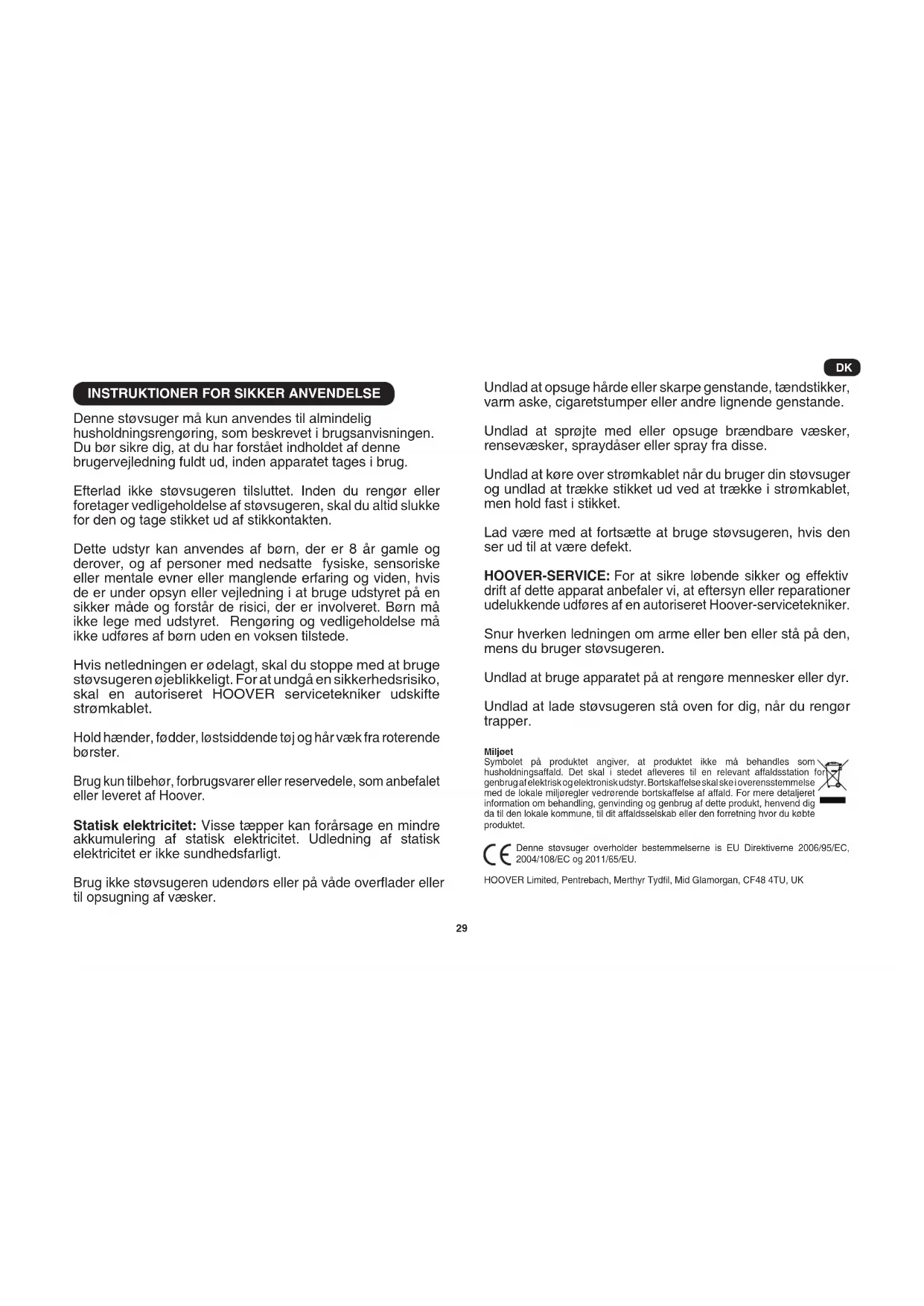 Denne støvsuger må kun anvendes til almindelig husholdningsrengøring, som beskrevet i brugsanvisningen. Du bør sikre dig, at du har forstået indholdet af denne brugervejledning fuldt ud, inden apparatet tages i brug. Efterlad ikke støvsugeren tilsluttet. Inden du rengør eller foretager vedligeholdelse af støvsugeren, skal du altid slukke for den og tage stikket ud af stikkontakten. Dette udstyr kan anvendes af børn, der er 8 år gamle og derover, og af personer med nedsatte fysiske, sensoriske eller mentale evner eller manglende erfaring og viden, hvis de er under opsyn eller vejledning i at bruge udstyret på en sikker måde og forstår de risici, der er involveret. Børn må ikke lege med udstyret. Rengøring og vedligeholdelse må ikke udføres af børn uden en voksen tilstede. Hvis netledningen er ødelagt, skal du stoppe med at bruge støvsugeren øjeblikkeligt. For at undgå en sikkerhedsrisiko, skal en autoriseret HOOVER servicetekniker udskifte strømkablet. Hold hænder, fødder, løstsiddende tøj og hår væk fra roterende børster. Brug kun tilbehør, forbrugsvarer eller reservedele, som anbefalet eller leveret af Hoover. Statisk elektricitet: Visse tæpper kan forårsage en mindre akkumulering af statisk elektricitet. Udledning af statisk elektricitet er ikke sundhedsfarligt. Brug ikke støvsugeren udendørs eller på våde overader eller til opsugning af væsker. Undlad at opsuge hårde eller skarpe genstande, tændstikker, varm aske, cigaretstumper eller andre lignende genstande. Undlad at sprøjte med eller opsuge brændbare væsker, rensevæsker, spraydåser eller spray fra disse. Undlad at køre over strømkablet når du bruger din støvsuger og undlad at trække stikket ud ved at trække i strømkablet, men hold fast i stikket. Lad være med at fortsætte at bruge støvsugeren, hvis den ser ud til at være defekt. HOOVER-SERVICE: For at sikre løbende sikker og effektiv drift af dette apparat anbefaler vi, at eftersyn eller reparationer udelukkende udføres af en autoriseret Hoover-servicetekniker. Snur hverken ledningen om arme eller ben eller stå på den, mens du bruger støvsugeren. Undlad at bruge apparatet på at rengøre mennesker eller dyr. Undlad at lade støvsugeren stå oven for dig, når du rengør trapper. Miljøet Symbolet på produktet angiver, at produktet ikke må behandles som husholdningsaffald. Det skal i stedet aeveres til en relevant affaldsstation for genbrug af elektrisk og elektronisk udstyr. Bortskaffelse skal ske i overensstemmelse med de lokale miljøregler vedrørende bortskaffelse af affald. For mere detaljeret information om behandling, genvinding og genbrug af dette produkt, henvend dig da til den lokale kommune, til dit affaldsselskab eller den forretning hvor du købte produktet. Denne støvsuger overholder bestemmelserne is EU Direktiverne 2006/95/EC, 2004/108/EC og 2011/65/EU. HOOVER Limited, Pentrebach, Merthyr Tydl, Mid Glamorgan, CF48 4TU, UK DKN1. Tæppemundstykke (CA)** N2. Mundstykke til hårde gulve (HF)**