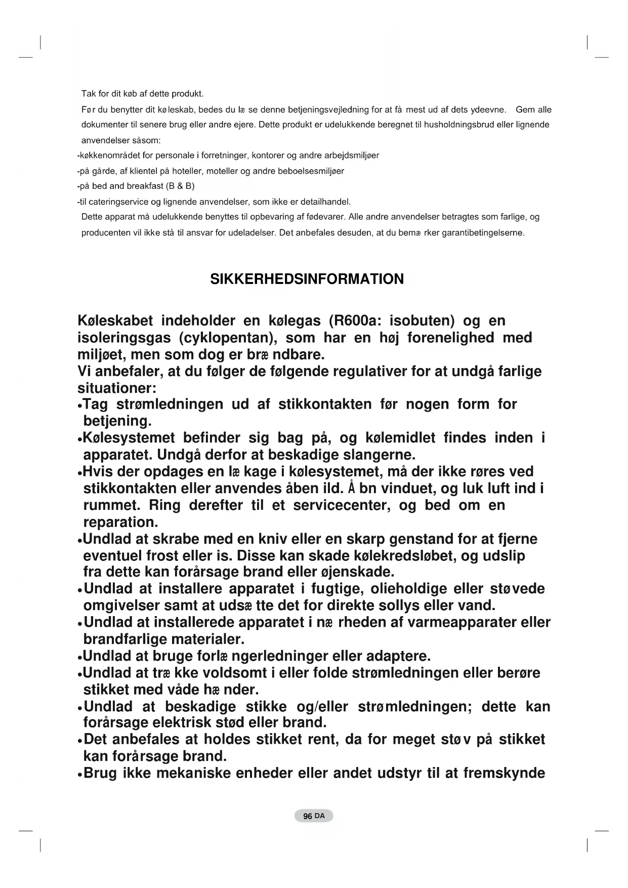 95Tak for dit køb af dette produkt. Før du benytter dit køleskab, bedes du læ se denne betjeningsvejledning for at få mest ud af dets ydeevne. Gem alle dokumenter til senere brug eller andre ejere. Dette produkt er udelukkende beregnet til husholdningsbrud eller lignende anvendelser såsom: -køkkenområdet for personale i forretninger, kontorer og andre arbejdsmiljøer-på gårde, af klientel på hoteller, moteller og andre beboelsesmiljøer-på bed and breakfast (B & B)-til cateringservice og lignende anvendelser, som ikke er detailhandel. Dette apparat må udelukkende benyttes til opbevaring af fødevarer. Alle andre anvendelser betragtes som farlige, og producenten vil ikke stå til ansvar for udeladelser. Det anbefales desuden, at du bemæ rker garantibetingelserne. SIKKERHEDSINFORMATION Køleskabet indeholder en kølegas (R600a: isobuten) og en isoleringsgas (cyklopentan), som har en høj forenelighed med miljøet, men som dog er bræ ndbare. Vi anbefaler, at du følger de følgende regulativer for at undgå farlige situationer: Tag strømledningen ud af stikkontakten før nogen form for betjening. Kølesystemet befinder sig bag på, og kølemidlet findes inden i apparatet. Undgå derfor at beskadige slangerne. Hvis der opdages en læ kage i kølesystemet, må der ikke røres ved stikkontakten eller anvendes åben ild. Å bn vinduet, og luk luft ind i rummet. Ring derefter til et servicecenter, og bed om en reparation. Undlad at skrabe med en kniv eller en skarp genstand for at fjerne eventuel frost eller is. Disse kan skade kølekredsløbet, og udslip fra dette kan forårsage brand eller øjenskade. Undlad at installere apparatet i fugtige, olieholdige eller støvede omgivelser samt at udsæ tte det for direkte sollys eller vand. Undlad at installerede apparatet i næ rheden af varmeapparater eller brandfarlige materialer. Undlad at bruge forlæ ngerledninger eller adaptere. Undlad at træ kke voldsomt i eller folde strømledningen eller berøre stikket med våde hæ nder. Undlad at beskadige stikke og/eller strømledningen; dette kan forårsage elektrisk stød eller brand. Det anbefales at holdes stikket rent, da for meget støv på stikket kan forårsage brand. Brug ikke mekaniske enheder eller andet udstyr til at fremskynde