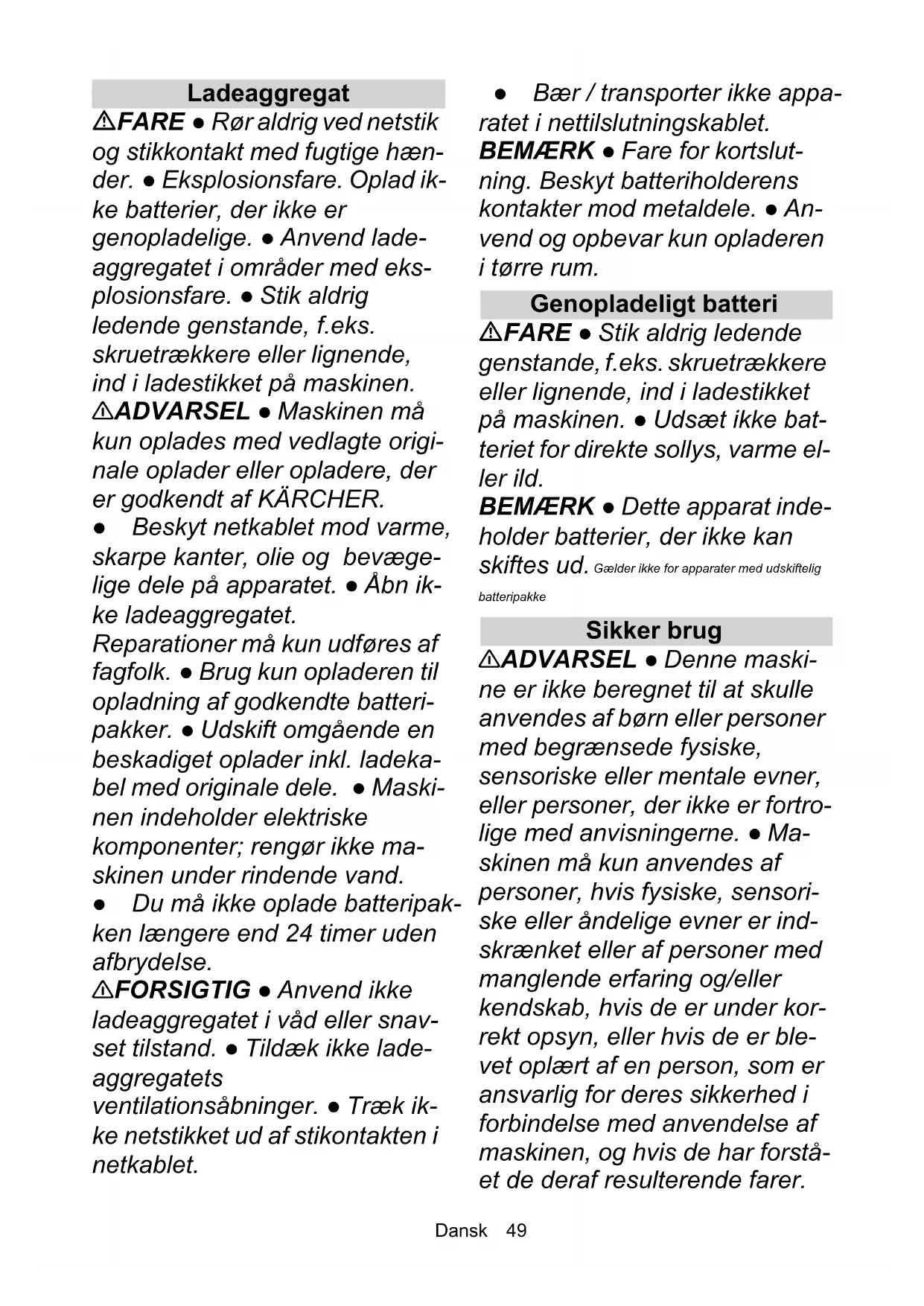 - 2000/14/CE: Anexo V Nível de potência sonora dB(A) Medido: 81 Garantido: 84 Os signatários actuam em nome e em procuração do Conselho de Administração. Representante da documentação: S. Reiser Alfred Kärcher SE & Co. KG Alfred-Kärcher-Str. 28 - 40 71364 Winnenden (Alemanha) Tel.: +49 7195 14-0 Fax: +49 7195 14-2212 Winnenden, 01/02/2019 Indhold Sikkerhedshenvisninger Læs disse sikkerheds- henvisninger og den originale driftsvejledning, inden maskinen tages i brug første gang. Betjen maskinen i hen- hold til disse. Opbevar de to hæfter til senere brug eller til se- nere ejere. Faregrader FARE ● Henviser til en umiddelbar fa- re, der medfører alvorlige kvæ- stelser eller død. 몇 ADVARSEL ● Henviser til en mulig farlig situ- ation, der kan medføre alvorli- ge kvæstelser eller død. 몇 FORSIGTIG ● Henviser til en mulig farlig situ- ation, der kan medføre lettere kvæstelser. BEMÆRK ● Henviser til en mulig farlig situ- ation, der kan medføre materi- elle skader. Chairman of the Board of ManagementDirector Regulatory Affairs & Certification H. Jenner S. Reiser Sikkerhedshenvisninger p. 48