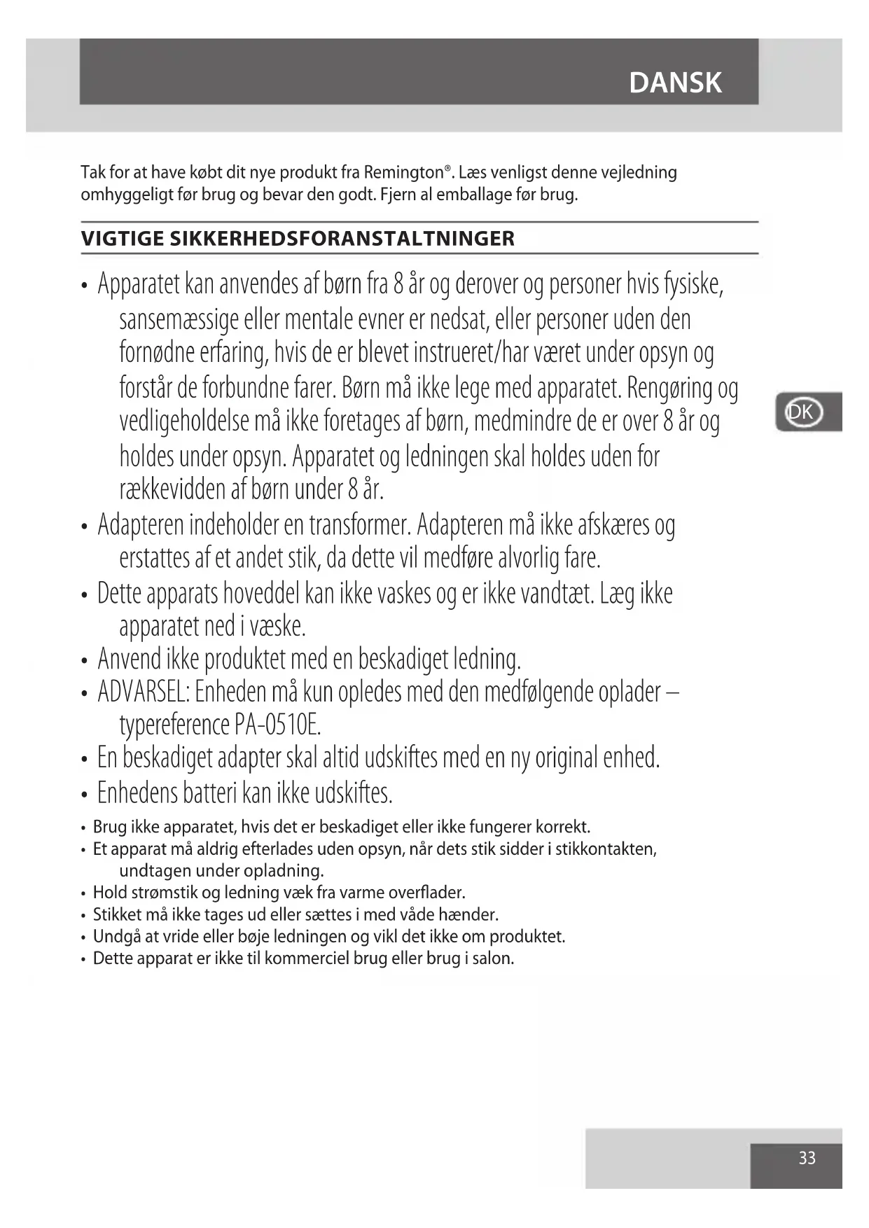 For å unngå miljø- og helseproblemer på grunn av farlige stoer, må apparater og oppladbare og ikke-oppladbare batterier markert med en av disse symbolene ikke kastes i usortert oentlig avfall. Kast alltid elektriske og elektroniske produkter og, hvis relevant, oppladbare og ikke-oppladbare batterier, på et egnet retursted for oentlig resirkulering/innsamling.45 Kiitos, että valitsit tämän uuden Remington®-tuotteen. Lue ohjeet huolellisesti ja pidä ne tallessa. Poista kaikki pakkausmateriaali ennen käyttöä.