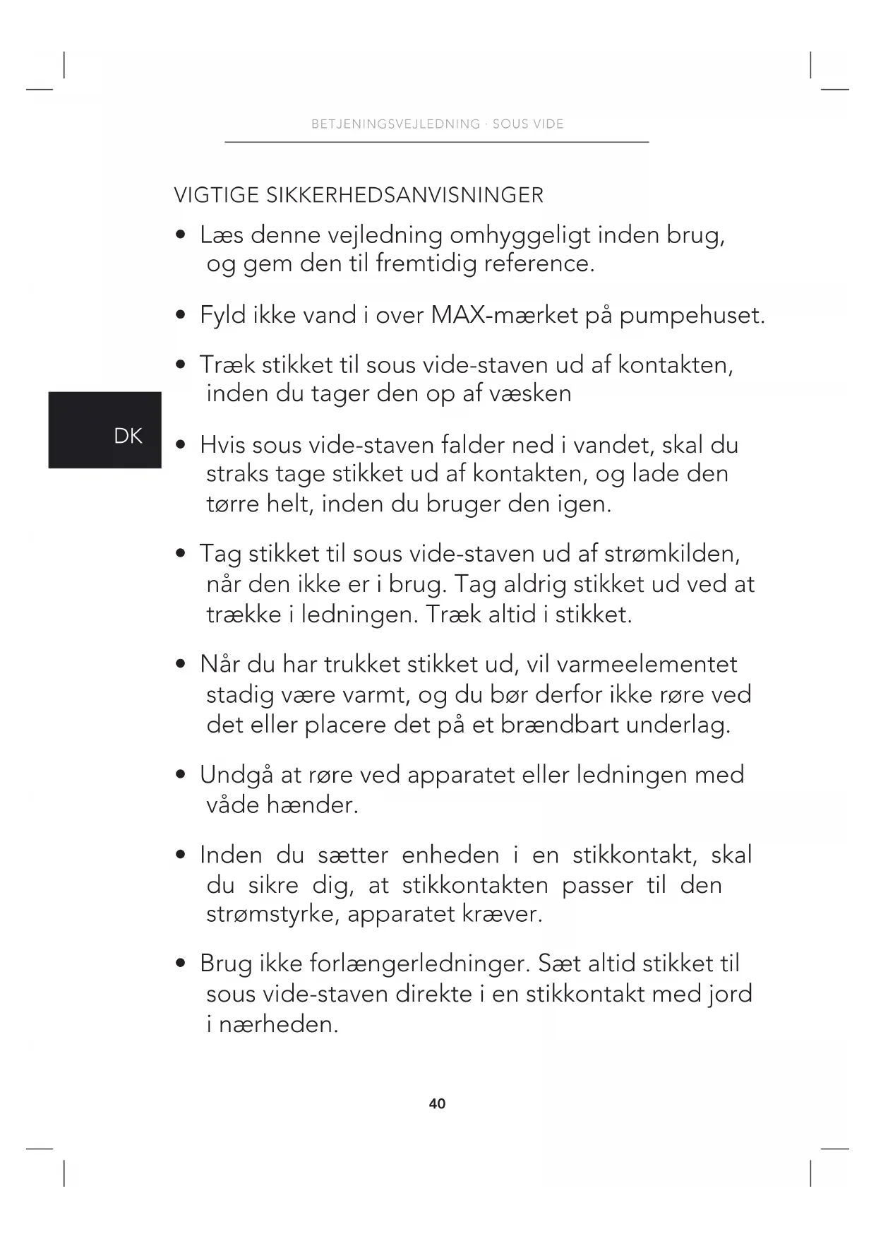 - Brug ikke forlængerledninger. Sæt altid stikket til sous vide-staven direkte i en stikkontakt med jord i nærheden.41