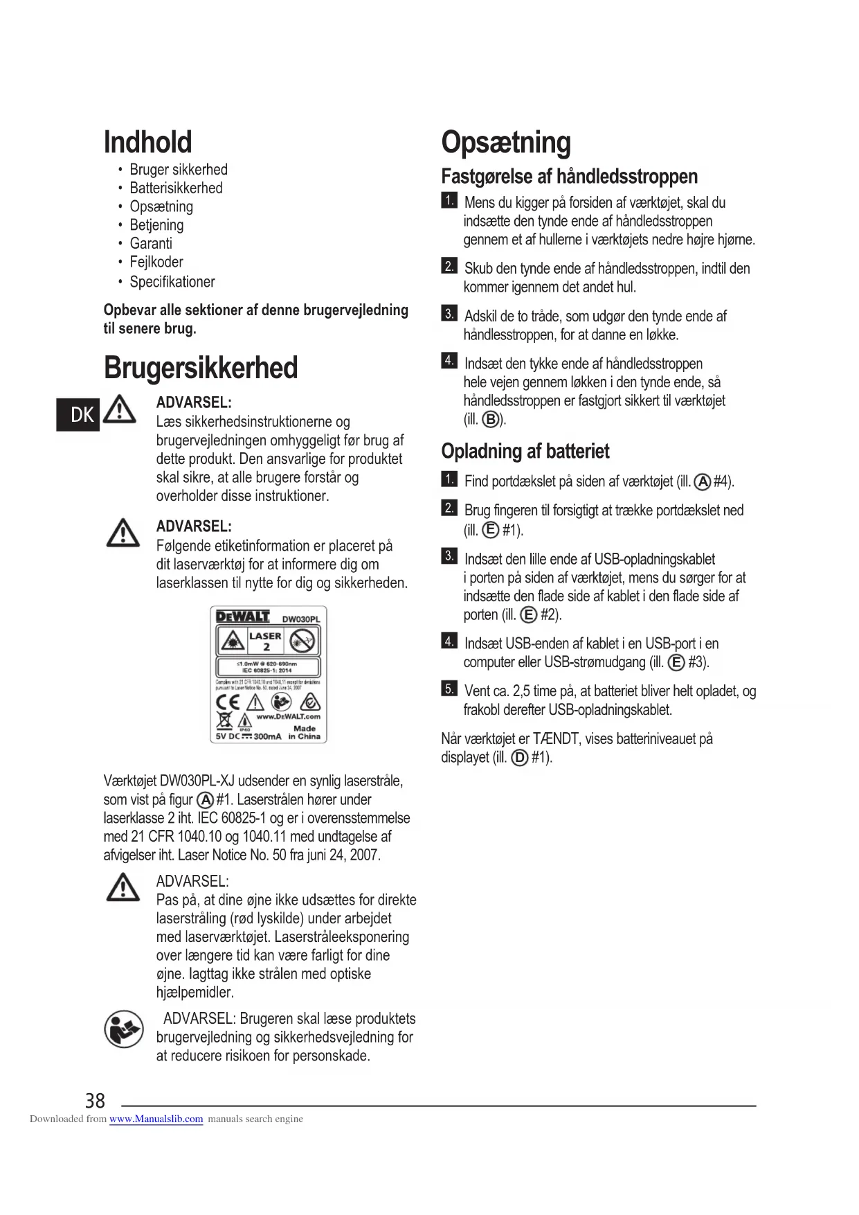- Specikationer Opbevar alle sektioner af denne brugervejledning til senere brug. Brugersikkerhed ADVARSEL: Læs sikkerhedsinstruktionerne og brugervejledningen omhyggeligt før brug af dette produkt. Den ansvarlige for produktet skal sikre, at alle brugere forstår og overholder disse instruktioner. ADVARSEL: Følgende etiketinformation er placeret på dit laserværktøj for at informere dig om laserklassen til nytte for dig og sikkerheden. Værktøjet DW030PL-XJ udsender en synlig laserstråle, som vist på figur