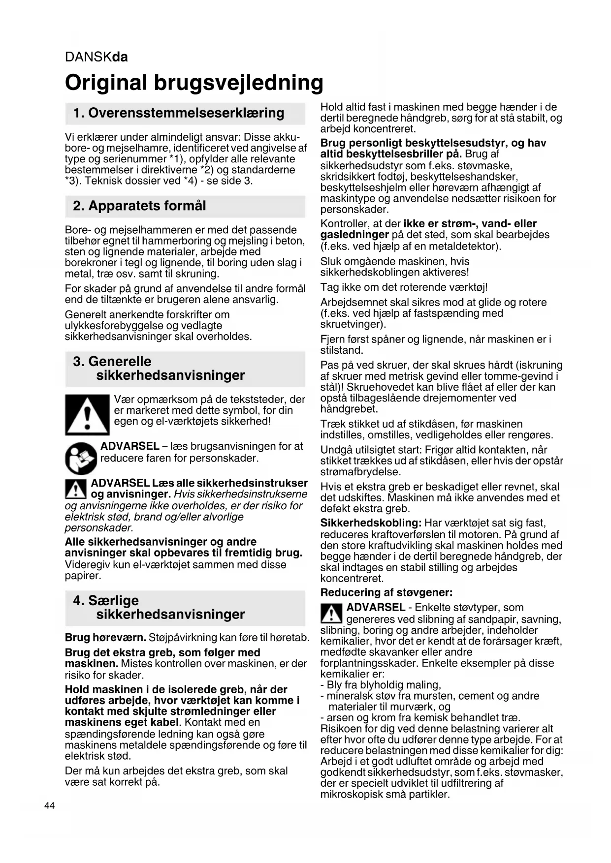 Vi erklærer under almindeligt ansvar: Disse akku- bore- og mejselhamre, identificeret ved angivelse af type og serienummer *1), opfylder alle relevante bestemmelser i direktiverne *2) og standarderne *3). Teknisk dossier ved *4) - se side 3. Bore- og mejselhammeren er med det passende tilbehør egnet til hammerboring og mejsling i beton, sten og lignende materialer, arbejde med borekroner i tegl og lignende, til boring uden slag i metal, træ osv. samt til skruning. For skader på grund af anvendelse til andre formål end de tiltænkte er brugeren alene ansvarlig. Generelt anerkendte forskrifter om ulykkesforebyggelse og vedlagte sikkerhedsanvisninger skal overholdes. Vær opmærksom på de tekststeder, der er markeret med dette symbol, for din egen og el-værktøjets sikkerhed! ADVARSEL – læs brugsanvisningen for at reducere faren for personskader. ADVARSEL Læs alle sikkerhedsinstrukser og anvisninger. Hvis sikkerhedsinstrukserne og anvisningerne ikke overholdes, er der risiko for elektrisk stød, brand og/eller alvorlige personskader. Alle sikkerhedsanvisninger og andre anvisninger skal opbevares til fremtidig brug. Videregiv kun el-værktøjet sammen med disse papirer. Brug høreværn. Støjpåvirkning kan føre til høretab. Brug det ekstra greb, som følger med maskinen. Mistes kontrollen over maskinen, er der risiko for skader. Hold maskinen i de isolerede greb, når der udføres arbejde, hvor værktøjet kan komme i kontakt med skjulte strømledninger eller maskinens eget kabel. Kontakt med en spændingsførende ledning kan også gøre maskinens metaldele spændingsførende og føre til elektrisk stød. Der må kun arbejdes det ekstra greb, som skal være sat korrekt på. Hold altid fast i maskinen med begge hænder i de dertil beregnede håndgreb, sørg for at stå stabilt, og arbejd koncentreret. Brug personligt beskyttelsesudstyr, og hav altid beskyttelsesbriller på. Brug af sikkerhedsudstyr som f.eks. støvmaske, skridsikkert fodtøj, beskyttelseshandsker, beskyttelseshjelm eller høreværn afhængigt af maskintype og anvendelse nedsætter risikoen for personskader. Kontroller, at der ikke er strøm-, vand- eller gasledninger på det sted, som skal bearbejdes (f.eks. ved hjælp af en metaldetektor). Sluk omgående maskinen, hvis sikkerhedskoblingen aktiveres! Tag ikke om det roterende værktøj! Arbejdsemnet skal sikres mod at glide og rotere (f.eks. ved hjælp af fastspænding med skruetvinger). Fjern først spåner og lignende, når maskinen er i stilstand. Pas på ved skruer, der skal skrues hårdt (iskruning af skruer med metrisk gevind eller tomme-gevind i stål)! Skruehovedet kan blive flået af eller der kan opstå tilbageslående drejemomenter ved håndgrebet. Træk stikket ud af stikdåsen, før maskinen indstilles, omstilles, vedligeholdes eller rengøres. Undgå utilsigtet start: Frigør altid kontakten, når stikket trækkes ud af stikdåsen, eller hvis der opstår strømafbrydelse. Hvis et ekstra greb er beskadiget eller revnet, skal det udskiftes. Maskinen må ikke anvendes med et defekt ekstra greb. Sikkerhedskobling: Har værktøjet sat sig fast, reduceres kraftoverførslen til motoren. På grund af den store kraftudvikling skal maskinen holdes med begge hænder i de dertil beregnede håndgreb, der skal indtages en stabil stilling og arbejdes koncentreret. Reducering af støvgener: ADVARSEL - Enkelte støvtyper, som genereres ved slibning af sandpapir, savning, slibning, boring og andre arbejder, indeholder kemikalier, hvor det er kendt at de forårsager kræft, medfødte skavanker eller andre forplantningsskader. Enkelte eksempler på disse kemikalier er: - Bly fra blyholdig maling, - mineralsk støv fra mursten, cement og andre materialer til murværk, og - arsen og krom fra kemisk behandlet træ. Risikoen for dig ved denne belastning varierer alt efter hvor ofte du udfører denne type arbejde. For at reducere belastningen med disse kemikalier for dig: Arbejd i et godt udluftet område og arbejd med godkendt sikkerhedsudstyr, som f.eks. støvmasker, der er specielt udviklet til udfiltrering af mikroskopisk små partikler. Original brugsvejledning
