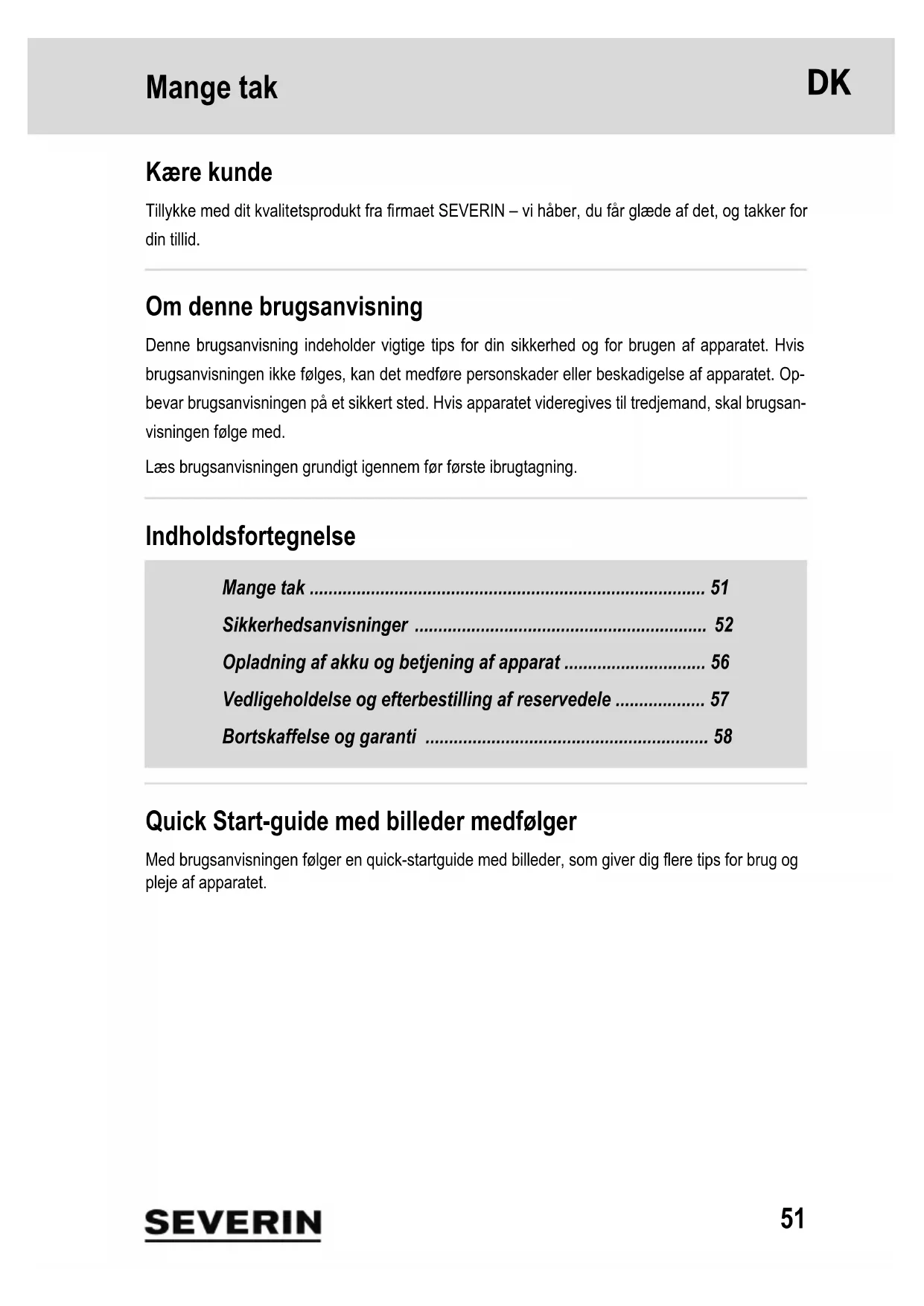 - Smaltimento separato dell'apparecchio e dell'accumulatore Gli apparecchi e gli accumulatori arrecanti questo simbolo devono essere smaltiti separatamente dai rifiuti domestici. Gli apparecchi e gli accumulatori contengono materie prime pregiate che possono essere riutilizzate. Lo smaltimento corretto pro- tegge l'ambiente e la salute delle persone. Consegnare separatamente per lo smal- timento nel relativo centro di raccolta l'apparecchio e l'accumulatore disassemblati. Garanzia Le condizioni di garanzia che seguono non pregiudicano i diritti alla prestazione in garanzia di legge nei confronti del venditore, né eventuali garanzie del venditore. Qualora si rendesse necessaria una riparazione, contattare telefonicamente o per e-mail la nostra Assistenza Clienti. I dettagli di contatto sono riportati nell'Allegato alle presenti istru- zioni per l'uso. In caso di ricorso alla garanzia, in alternativa rivolgersi anche direttamente al ri- venditore. SEVERIN concede inoltre una garanzia produttore di due anni a partire dalla data d'ac- quisto. In detto periodo viene effettuata senza spese l'eliminazione di tutti i difetti riconducibili in modo dimostrabile a difetti di materiale o di produzione e che compromettono in modo rilevante il funzionamento. Ogni altra rivendicazione è esclusa. Sono esclusi dalla garanzia: Danni riconducibili al mancato rispetto delle istruzioni per l'uso, all'uso non conforme o a normale usura, come pure particolari fragili come ad esempio vetro, plastica o lampadine o LED. Dalla garanzia sono inoltre esclusi batterie e accumulatori divenuti difettosi a se- guito della normale usura o uso non conforme, o la cui durata si è ridotta. In caso d'intervento da parte di soggetti non autorizzati da SEVERIN la garanzia decade.51 Mange tak 1Mange tak Kære kunde Tillykke med dit kvalitetsprodukt fra firmaet SEVERIN – vi håber, du får glæde af det, og takker for din tillid. Om denne brugsanvisning Denne brugsanvisning indeholder vigtige tips for din sikkerhed og for brugen af apparatet. Hvis brugsanvisningen ikke følges, kan det medføre personskader eller beskadigelse af apparatet. Op- bevar brugsanvisningen på et sikkert sted. Hvis apparatet videregives til tredjemand, skal brugsan- visningen følge med. Læs brugsanvisningen grundigt igennem før første ibrugtagning. Indholdsfortegnelse Mange tak p. 51