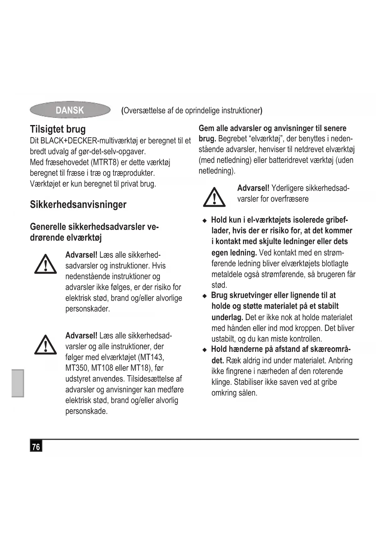MTRT8 Black & Decker erklærer at disse produktene, som er beskrevet under “Tekniske data”, er i samsvar med: 2006/42/EF, EN60745-1, EN60745-2-17 Disse produktene er også i samsvar med direktiv 2014/30/EU og 2011/65/EU. Hvis du ønsker mer informasjon, kontakt Black & Decker på følgende adresse, eller se på baksiden av håndboken. Undertegnede er ansvarlig for utarbeidelsen av den tekniske dokumentasjonen og gir denne erklæringen på vegne av Black & Decker. R. Laverick Engineering Manager Black & Decker Europe, 210 Bath Road, Slough, Berkshire, SL1 3YD Storbritannia 17/09/201476 (Oversættelse af de oprindelige instruktioner) DANSK Tilsigtet brug Dit BLACK+DECKER-multiværktøj er beregnet til et bredt udvalg af gør-det-selv-opgaver. Med fræsehovedet (MTRT8) er dette værktøj beregnet til fræse i træ og træprodukter. Værktøjet er kun beregnet til privat brug. Sikkerhedsanvisninger Generelle sikkerhedsadvarsler ve- drørende elværktøj