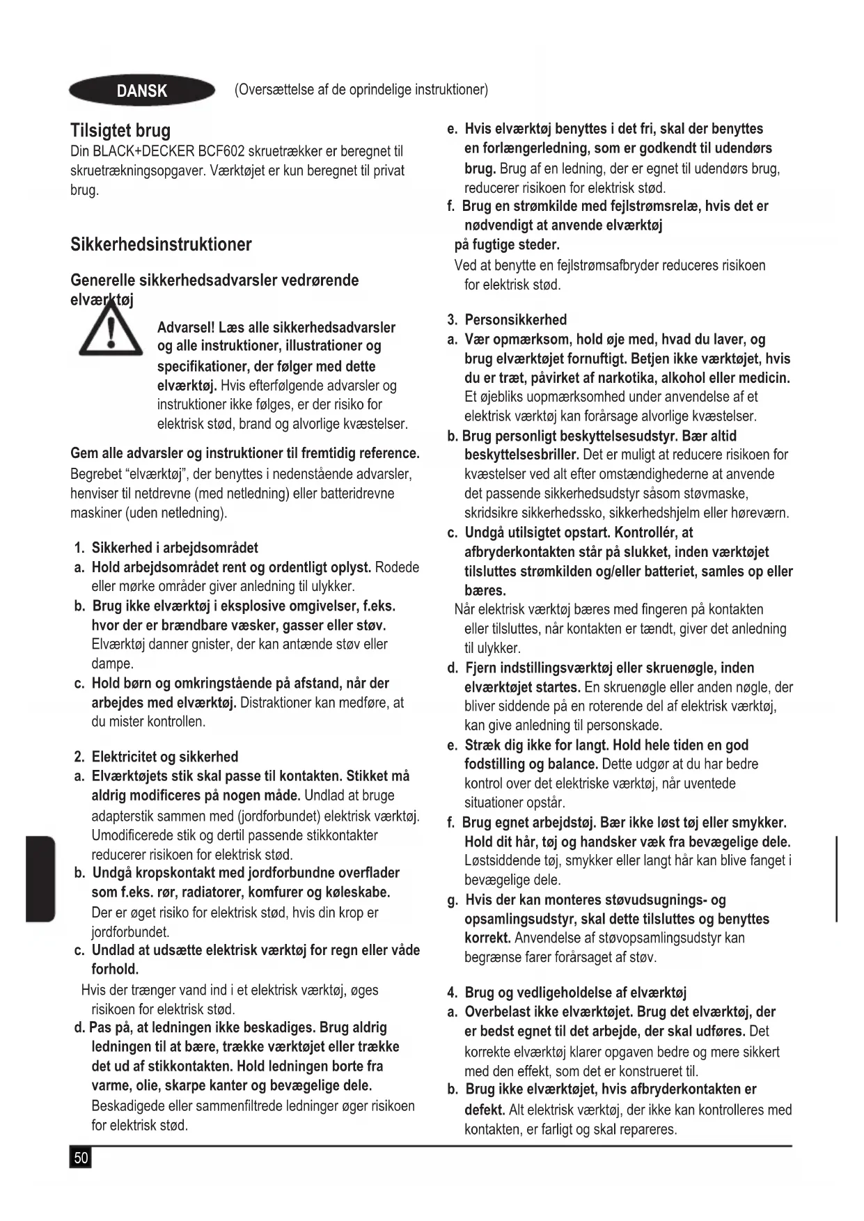 BCF602 - Skruetrækker Black & Decker erklærer, at produkterne beskrevet under ”Tekniske data” er i overensstemmelse med: 2006/42/EC, EN62841-1:2015, EN62841-2-2:2014. Disse produkter er endvidere i overensstemmelse med direktiv 2014/30/EU og 2011/65/EU. Kontakt Black & Decker på nedenstående adresse eller se vejledningens bagside for at få yderligere oplysninger. Undertegnede er ansvarlig for udarbejdelsen af de tekniske data og fremsætter denne erklæring på vegne af Black & Decker. R. Laverick Engineering Manager Black & Decker Europe, 210 Bath Road, Slough, Berkshire, SL1 3YD Storbritannien 10/04/2018 Garanti Black & Decker er overbevist om den gode kvalitet af sine produkter og giver forbrugerne en garanti på 24 måneder fra købsdatoen. Garantien er et tillæg til forbrugerens lovmæssige rettigheder og påvirker ikke disse. Garantien er gyldig inden for medlemsstaterne af Den Europæiske Union og Det Europæiske Frihandelsområde. Når du gør krav på garantien, skal kravet være i overensstemmelse med Black & Decker vilkår og betingelser, og du skal indsende dokumentation for købet til sælgeren eller til en autoriseret reparatør. Vilkår og betingelser for Black & Decker 2 års garanti og placeringen af dit nærmeste autoriserede serviceværksted kan fås på internettet på www.2helpU.com, eller ved at kontakte dit lokale Black & Decker kontor på den adresse, der er angivet i denne vejledning. Besøg venligst vores websted www.blackanddecker.co.uk for at registrere dit nye Black & Decker produkt og modtage opdateringer om nye produkter og specielle tilbud.55 (Alkuperäisten ohjeiden käännös) SUOMI Käyttötarkoitus BLACK+DECKER BCF602 -ruuviväännin on tarkoitettu ruuvaukseen. Tämä työkalu on tarkoitettu vain yksityiskäyttöön. Turvallisuusohjeet Sähkötyökalujen yleiset turvavaroitukset Varoitus! Lue kaikki turvaohjeet ja kaikki tämän työkalun mukana toimitetut ohjeet, kuvat ja tekniset tiedot. Alla olevien varoitusten ja ohjeiden noudattamisen laiminlyönti saattaa johtaa sähköiskuun, tulipaloon ja/tai vakavaan loukkaantumiseen. Säästä kaikki varoitukset ja ohjeet tulevaa käyttöä varten. Jäljempänä olevissa varoituksissa käytetyllä käsitteellä ”sähkötyökalu” tarkoitetaan verkkokäyttöisiä sähkötyökaluja (verkkojohdolla) ja akkukäyttöisiä sähkötyökaluja (ilman verkkojohtoa).