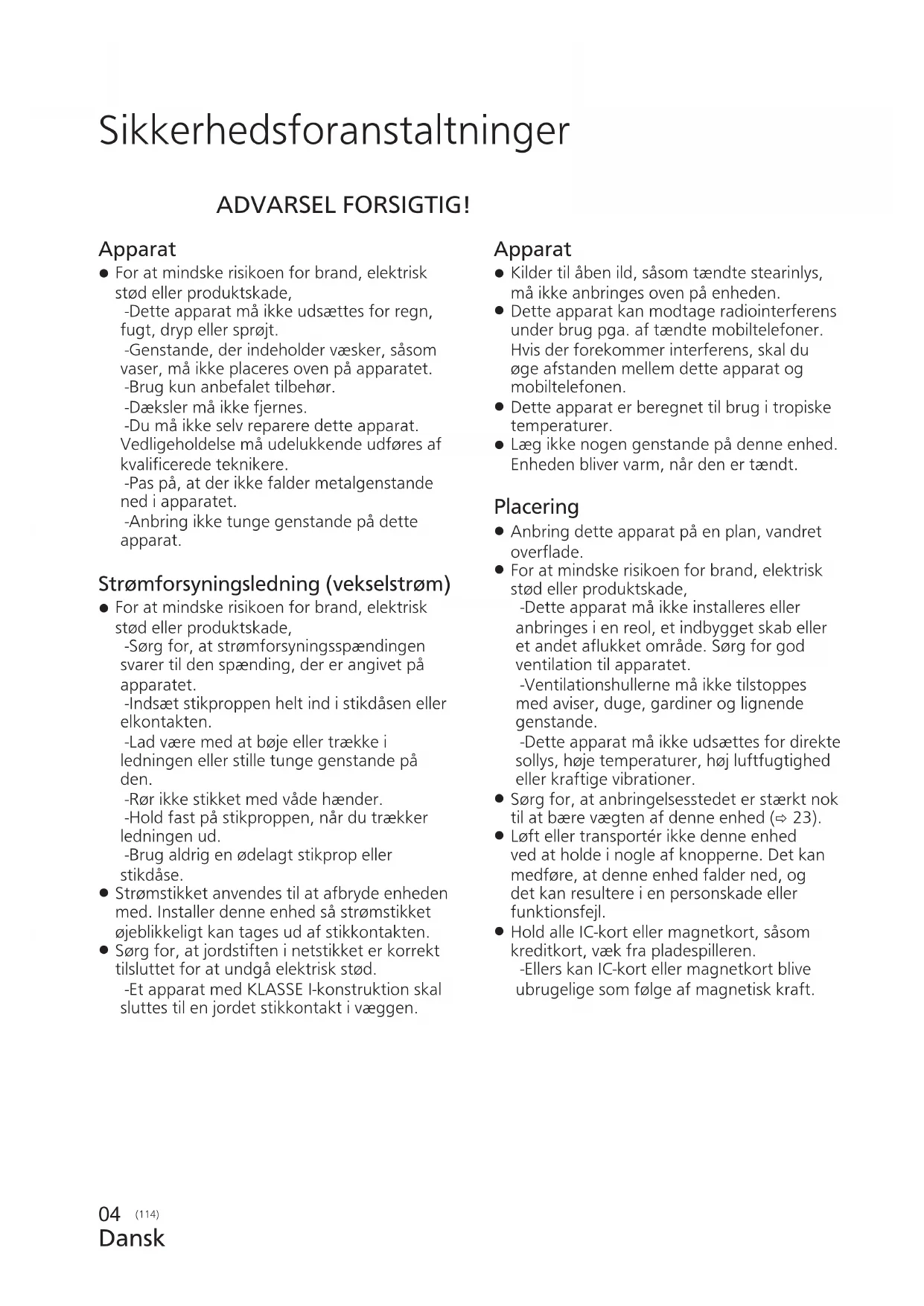 For at mindske risikoen for brand, elektrisk stød eller produktskade, -Dette apparat må ikke udsættes for regn, fugt, dryp eller sprøjt. -Genstande, der indeholder væsker, såsom vaser, må ikke placeres oven på apparatet. -Brug kun anbefalet tilbehør. -Dæksler må ikke fjernes. -Du må ikke selv reparere dette apparat. Vedligeholdelse må udelukkende udføres af kvalificerede teknikere. -Pas på, at der ikke falder metalgenstande ned i apparatet. -Anbring ikke tunge genstande på dette apparat. Strømforsyningsledning (vekselstrøm)