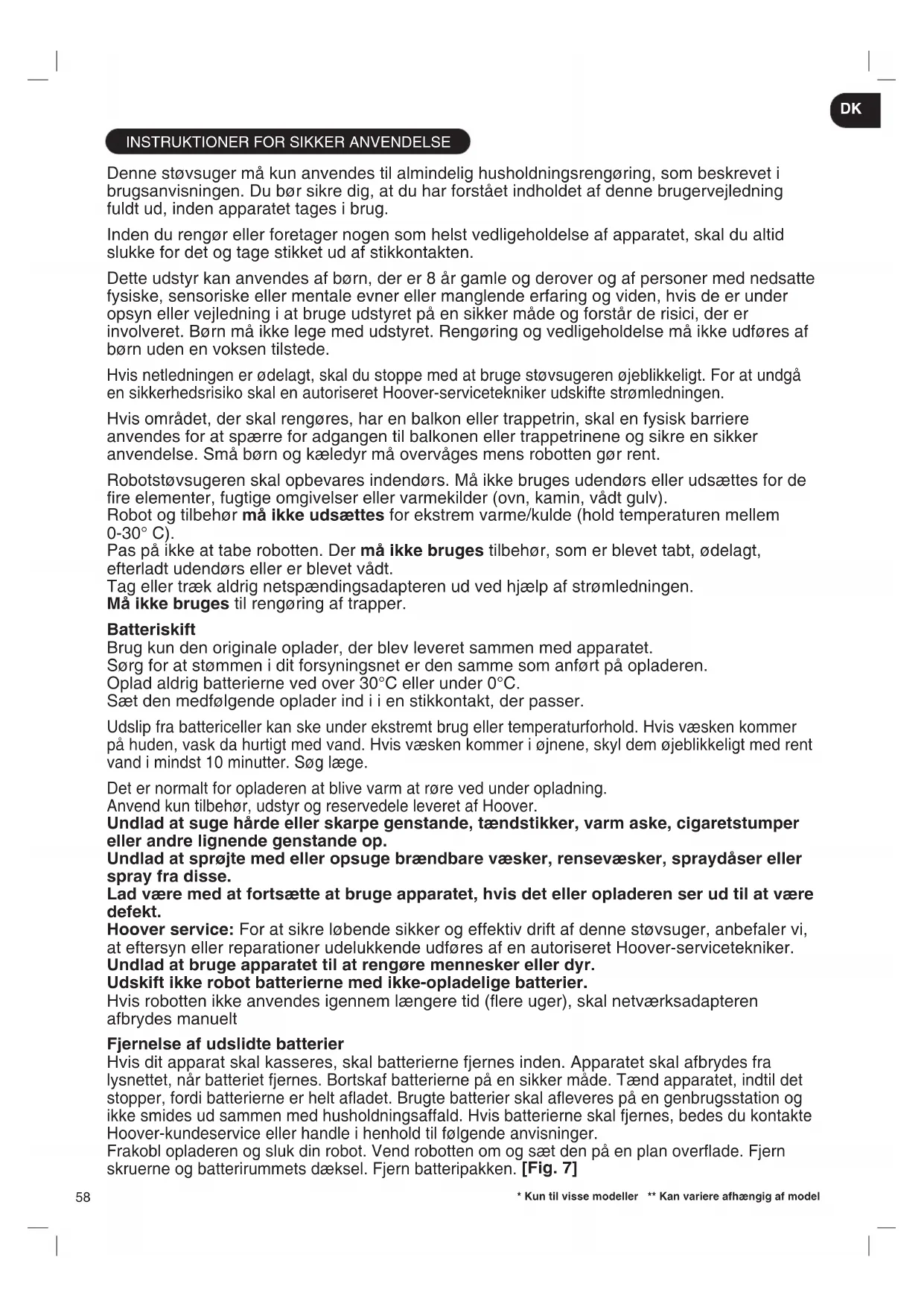 Denne støvsuger må kun anvendes til almindelig husholdningsrengøring, som beskrevet i brugsanvisningen. Du bør sikre dig, at du har forstået indholdet af denne brugervejledning fuldt ud, inden apparatet tages i brug. Inden du rengør eller foretager nogen som helst vedligeholdelse af apparatet, skal du altid slukke for det og tage stikket ud af stikkontakten. Dette udstyr kan anvendes af børn, der er 8 år gamle og derover og af personer med nedsatte fysiske, sensoriske eller mentale evner eller manglende erfaring og viden, hvis de er under opsyn eller vejledning i at bruge udstyret på en sikker måde og forstår de risici, der er involveret. Børn må ikke lege med udstyret. Rengøring og vedligeholdelse må ikke udføres af børn uden en voksen tilstede. Hvis netledningen er ødelagt, skal du stoppe med at bruge støvsugeren øjeblikkeligt. For at undgå en sikkerhedsrisiko skal en autoriseret Hoover-servicetekniker udskifte strømledningen. Hvis området, der skal rengøres, har en balkon eller trappetrin, skal en fysisk barriere anvendes for at spærre for adgangen til balkonen eller trappetrinene og sikre en sikker anvendelse. Små børn og kæledyr må overvåges mens robotten gør rent. Robotstøvsugeren skal opbevares indendørs. Må ikke bruges udendørs eller udsættes for de re elementer, fugtige omgivelser eller varmekilder (ovn, kamin, vådt gulv). Robot og tilbehør må ikke udsættes for ekstrem varme/kulde (hold temperaturen mellem 0-30° C). Pas på ikke at tabe robotten. Der må ikke bruges tilbehør, som er blevet tabt, ødelagt, efterladt udendørs eller er blevet vådt. Tag eller træk aldrig netspændingsadapteren ud ved hjælp af strømledningen. Må ikke bruges til rengøring af trapper. Batteriskift Brug kun den originale oplader, der blev leveret sammen med apparatet. Sørg for at stømmen i dit forsyningsnet er den samme som anført på opladeren. Oplad aldrig batterierne ved over 30°C eller under 0°C. Sæt den medfølgende oplader ind i i en stikkontakt, der passer. Udslip fra battericeller kan ske under ekstremt brug eller temperaturforhold. Hvis væsken kommer på huden, vask da hurtigt med vand. Hvis væsken kommer i øjnene, skyl dem øjeblikkeligt med rent vand i mindst 10 minutter. Søg læge. Det er normalt for opladeren at blive varm at røre ved under opladning. Anvend kun tilbehør, udstyr og reservedele leveret af Hoover. Undlad at suge hårde eller skarpe genstande, tændstikker, varm aske, cigaretstumper eller andre lignende genstande op. Undlad at sprøjte med eller opsuge brændbare væsker, rensevæsker, spraydåser eller spray fra disse. Lad være med at fortsætte at bruge apparatet, hvis det eller opladeren ser ud til at være defekt. Hoover service: For at sikre løbende sikker og effektiv drift af denne støvsuger, anbefaler vi, at eftersyn eller reparationer udelukkende udføres af en autoriseret Hoover-servicetekniker. Undlad at bruge apparatet til at rengøre mennesker eller dyr. Udskift ikke robot batterierne med ikke-opladelige batterier. Hvis robotten ikke anvendes igennem længere tid (ere uger), skal netværksadapteren afbrydes manuelt Fjernelse af udslidte batterier Hvis dit apparat skal kasseres, skal batterierne fjernes inden. Apparatet skal afbr ydes fra lysnettet, når batteriet fjernes. Bortskaf batterierne på en sikker måde. Tænd apparatet, indtil det stopper, fordi batterierne er helt aadet. Brugte batterier skal aeveres på en genbrugsstation og ikke smides ud sammen med husholdningsaffald. Hvis batterierne skal fjernes, bedes du kontakte Hoover-kundeservice eller handle i henhold til følgende anvisninger. Frakobl opladeren og sluk din robot. Vend robotten om og sæt den på en plan overade. Fjern skruerne og batterirummets dæksel. Fjern batteripakken. [Fig. 7]