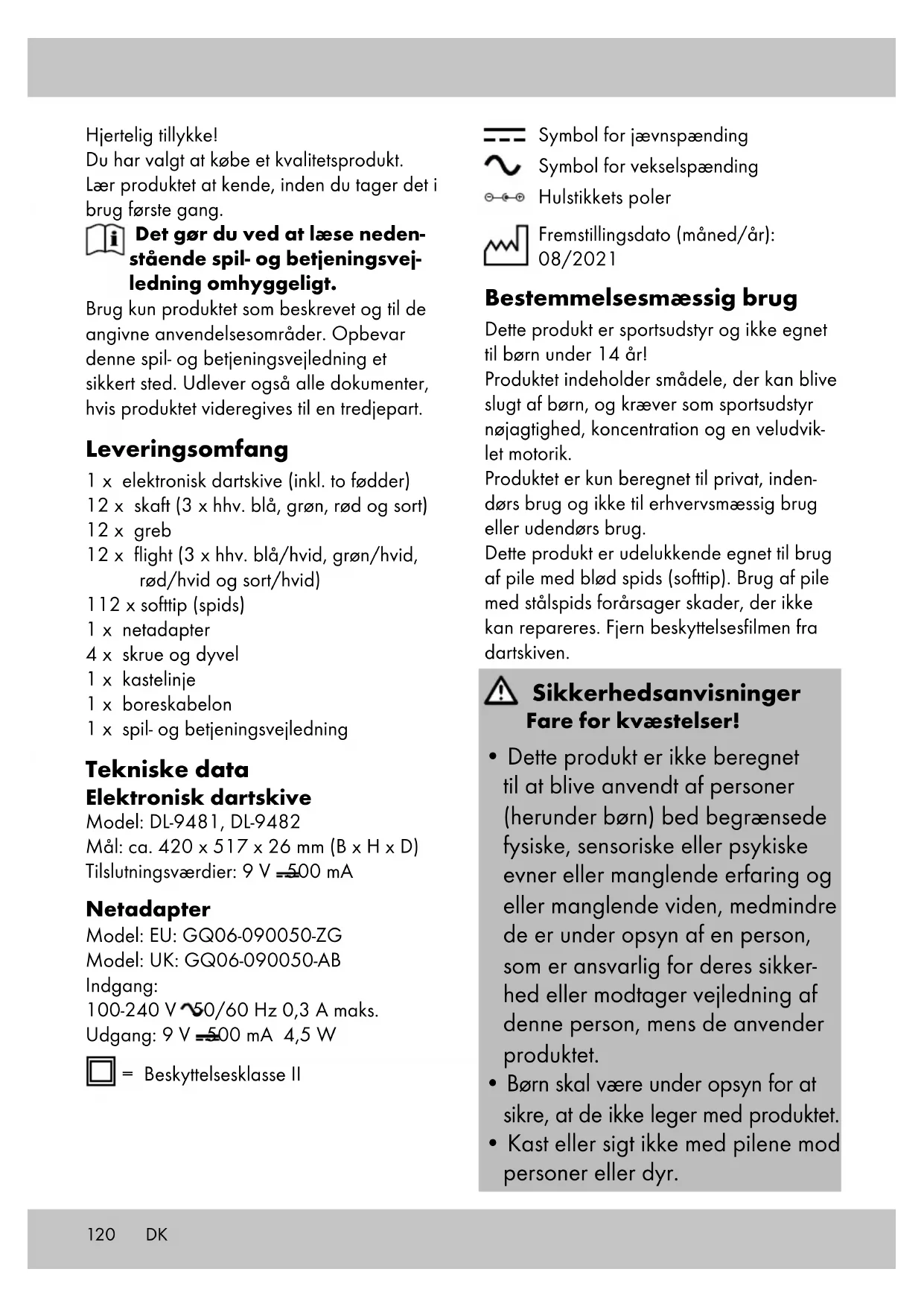 Oplysninger om garanti og servicehåndtering Varen er fremstillet med største omhu og under løbende kontrol. DELTA-SPORT HANDELSKONTOR GmbH yder private slutkunder tre års garanti på varen fra købs- dato (Garantifrist) i henhold til følgende bestemmelser. Garantien gælder kun for materiale- og fremstillingsfejl. Garantien omfatter ikke dele, der er udsat for normal slid og derfor skal betragtes som sliddele (f.eks. batterier) og ikke skrøbelige dele, f.eks. kontakter, genopladelige batterier eller dele, der er fremstillet af glas. Garantien kan ikke gøres gældende, hvis varen er blevet anvendt ukorrekt eller uagtsomt eller til andre formål end det tilsigtede eller i det tilsigtede omfang. Ga- rantien bortfalder ligeledes ved manglende overholdelse af anvisningerne i betjenings- vejledningen. Kunden skal kunne påvise, at der er tale om materiale- eller fremstillings- fejl og ikke fejl som følge af ovenstående omstændigheder. Garantien kan kun gøres gældende i garan- tiperioden mod fremvisning af original kvit- tering. Gem derfor den originale kvittering Garantiperioden forlænges ikke i tilfælde af reparation i henhold til garantien, den lovpligtige garanti eller pr. kulance. Dette gælder også for udskiftede og reparerede dele. I tilfælde af klager er det muligt at kontakte nedenstående servicelinje eller kontakte os pr. e-mail. Ved garantisager vil vi efter eget skøn reparere varen uden beregning, ombytte varen eller refundere købsprisen. Der er ingen yderligere rettigheder under garantien. Dine lovmæssige rettigheder, herunder navnlig garantikrav over for sælger, ind- skrænkes ikke som følge af denne garanti. IAN: 359727_2101 Service Danmark Tel.: 32 710005 E-Mail: deltasport@lidl.dk DKZUSATZINFORMATION ELEKTRONISCHE DARTSCHEIBE Hiermit erklärt Delta-Sport Handelskontor GmbH, dass dieser Artikel mit den folgenden grundlegenden Anforderungen und den übrigen einschlägigen Bestimmungen übereinstimmt: 2014/30/EU – EMV-Richtlinie 2011/65/EU – RoHS-Richtlinie 2014/35/EU – LVD-Richtlinie Technische Daten Netzadapter Name oder Handelsmarke des Herstellers, Handelsregisternummer und Anschrift Manufacturer: Dong Guan City GangQi Electronic Co., Ltd. Trade mark: N/A Commercial Number: