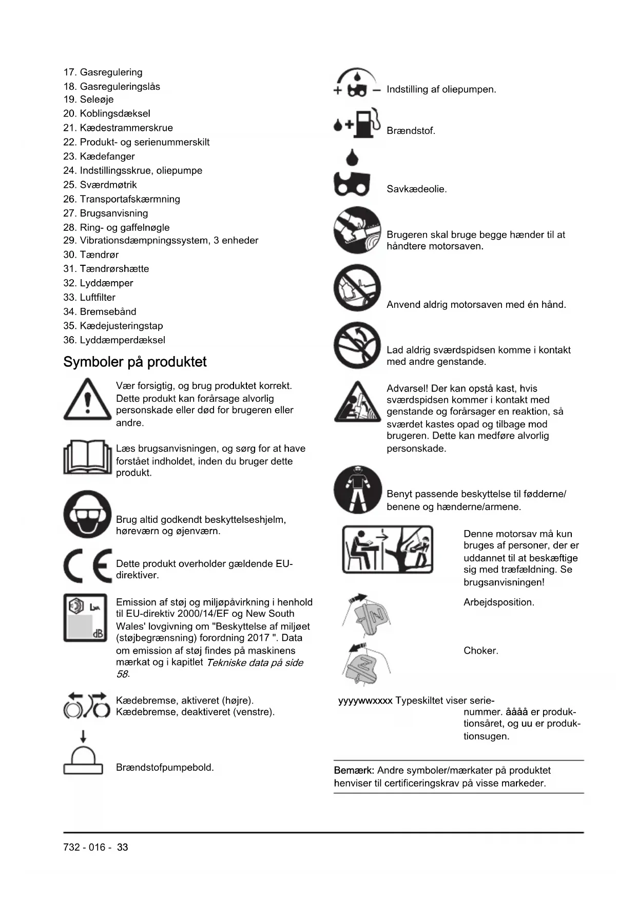 Kædebremse, aktiveret (højre). Kædebremse, deaktiveret (venstre). Brændstofpumpebold. Indstilling af oliepumpen. Brændstof. Savkædeolie. Brugeren skal bruge begge hænder til at håndtere motorsaven. Anvend aldrig motorsaven med én hånd. Lad aldrig sværdspidsen komme i kontakt med andre genstande. Advarsel! Der kan opstå kast, hvis sværdspidsen kommer i kontakt med genstande og forårsager en reaktion, så sværdet kastes opad og tilbage mod brugeren. Dette kan medføre alvorlig personskade. Benyt passende beskyttelse til fødderne/ benene og hænderne/armene. Denne motorsav må kun bruges af personer, der er uddannet til at beskæftige sig med træfældning. Se brugsanvisningen! Arbejdsposition. Choker. yyyywwxxxx Typeskiltet viser serie- nummer. åååå er produk- tionsåret, og uu er produk- tionsugen. Bemærk: Andre symboler/mærkater på produktet henviser til certificeringskrav på visse markeder.