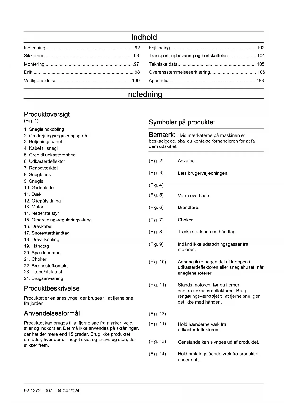 Produktbeskrivelse Produktet er en sneslynge, der bruges til at fjerne sne fra jorden. Anvendelsesformål Produktet kan bruges til at fjerne sne fra marker, veje, stier og indkørsler. Det må ikke anvendes på skråninger, der hælder mere end 15 grader. Brug ikke produktet i områder, hvor der er meget skidt og snavs og sten, der stikker frem. Symboler på produktet Bemærk: Hvis mærkaterne på maskinen er beskadigede, skal du kontakte forhandleren for at få dem udskiftet. (Fig. 2) Advarsel. (Fig. 3) Læs brugervejledningen. (Fig. 4) (Fig. 5) Varm overflade. (Fig. 6) Brandfare. (Fig. 7) Choker. (Fig. 8) Træk i startsnorens håndtag. (Fig. 9) Indånd ikke udstødningsgasser fra motoren. (Fig. 10) Anbring ikke nogen del af kroppen i udkasterdeflektoren eller sneglehuset, når sneglene roterer. (Fig. 11) Stands motoren, før du fjerner sne fra udkasterdeflektoren. Brug rengøringsværktøjet til at fjerne sne, gør det ikke med hånden. (Fig. 12) (Fig. 11) Hold hænderne væk fra udkasterdeflektoren. (Fig. 13) Genstande kan slynges ud af produktet. (Fig. 14) Hold omkringstående væk fra produktet under drift. 92 1272 - 007 - 04.04.2024(Fig. 15) Fjern nøglen før vedligeholdelse. (Fig. 16) Skub tænd/sluk-nøglen til positionen RUN. (Fig. 17) Flyt brændstofkontakten til positionen ON. (Fig. 18) Tryk på spædepumpen. (Fig. 19) Risiko for at falde. (Fig. 20) Flyt langsomt bagud. (Fig. 21) Brug godkendte beskyttelseshandsker. (Fig. 22) Brug en beskyttelseshjelm. Brug godkendt høreværn. Brug godkendt øjenværn. (Fig. 23) Emission af støj og miljøpåvirkning i henhold til EU-direktiv 2000/14/EF og New South Wales' lovgivning om "Beskyttelse af miljøet (støjbegrænsning) forordning 2017 ". Data om emission af støj findes på maskinens mærkat og i kapitlet Tekniske data. (Fig. 24) Dette produkt er i overensstemmelse med gældende EF-direktiv. (Fig. 25) Dette produkt er i overensstemmelse med gældende UK-bestemmelser. Bemærk: Andre symboler/mærkater på produktet henviser til certificeringskrav på visse markeder. Euro V-emissioner ADVARSEL: Ved manipulation af motoren bortfalder EU-typegodkendelsen af dette produkt. Producent Husqvarna AB Drottninggatan 2, SE-561 82 Huskvarna Skader på produktet Vi er ikke ansvarlige for skader på vores produkt, hvis: