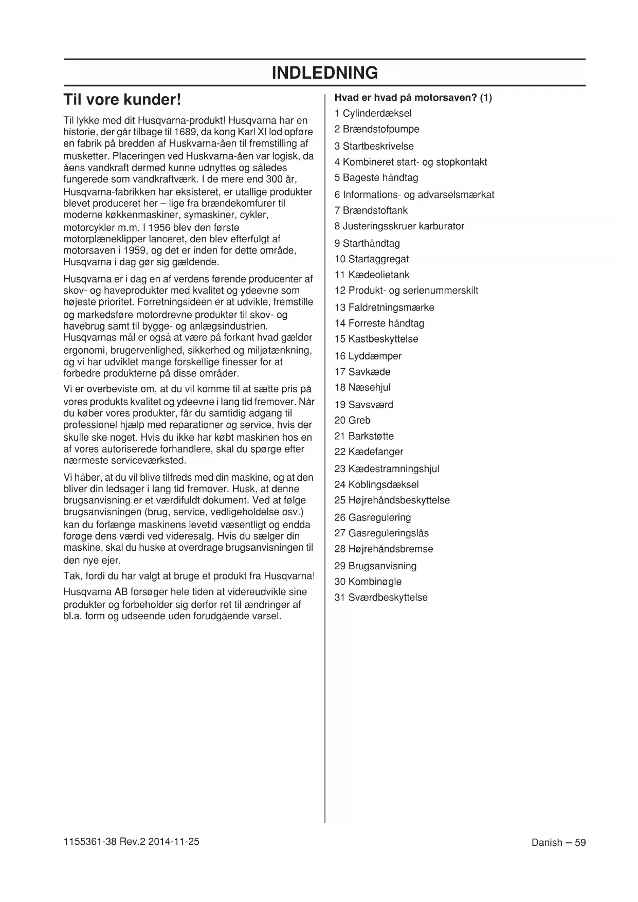 - EF-overensstemmelseserklæring INDLEDNING Danish – 59 1155361-38 Rev.2 2014-11-25 Til vore kunder! Til lykke med dit Husqvarna-produkt! Husqvarna har en historie, der går tilbage til 1689, da kong Karl XI lod opføre en fabrik på bredden af Huskvarna-åen til fremstilling af musketter. Placeringen ved Huskvarna-åen var logisk, da åens vandkraft dermed kunne udnyttes og således fungerede som vandkraftværk. I de mere end 300 år, Husqvarna-fabrikken har eksisteret, er utallige produkter blevet produceret her – lige fra brændekomfurer til moderne køkkenmaskiner, symaskiner, cykler, motorcykler m.m. I 1956 blev den første motorplæneklipper lanceret, den blev efterfulgt af motorsaven i 1959, og det er inden for dette område, Husqvarna i dag gør sig gældende. Husqvarna er i dag en af verdens førende producenter af skov- og haveprodukter med kvalitet og ydeevne som højeste prioritet. Forretningsideen er at udvikle, fremstille og markedsføre motordrevne produkter til skov- og havebrug samt til bygge- og anlægsindustrien. Husqvarnas mål er også at være på forkant hvad gælder ergonomi, brugervenlighed, sikkerhed og miljøtænkning, og vi har udviklet mange forskellige finesser for at forbedre produkterne på disse områder. Vi er overbeviste om, at du vil komme til at sætte pris på vores produkts kvalitet og ydeevne i lang tid fremover. Når du køber vores produkter, får du samtidig adgang til professionel hjælp med reparationer og service, hvis der skulle ske noget. Hvis du ikke har købt maskinen hos en af vores autoriserede forhandlere, skal du spørge efter nærmeste serviceværksted. Vi håber, at du vil blive tilfreds med din maskine, og at den bliver din ledsager i lang tid fremover. Husk, at denne brugsanvisning er et værdifuldt dokument. Ved at følge brugsanvisningen (brug, service, vedligeholdelse osv.) kan du forlænge maskinens levetid væsentligt og endda forøge dens værdi ved videresalg. Hvis du sælger din maskine, skal du huske at overdrage brugsanvisningen til den nye ejer. Tak, fordi du har valgt at bruge et produkt fra Husqvarna! Husqvarna AB forsøger hele tiden at videreudvikle sine produkter og forbeholder sig derfor ret til ændringer af bl.a. form og udseende uden forudgående varsel. Hvad er hvad på motorsaven? (1) 1 Cylinderdæksel 2 Brændstofpumpe 3 Startbeskrivelse 4 Kombineret start- og stopkontakt 5 Bageste håndtag 6 Informations- og advarselsmærkat 7 Brændstoftank 8 Justeringsskruer karburator 9 Starthåndtag 10 Startaggregat 11 Kædeolietank 12 Produkt- og serienummerskilt 13 Faldretningsmærke 14 Forreste håndtag 15 Kastbeskyttelse 16 Lyddæmper 17 Savkæde 18 Næsehjul 19 Savsværd 20 Greb 21 Barkstøtte 22 Kædefanger 23 Kædestramningshjul 24 Koblingsdæksel 25 Højrehåndsbeskyttelse 26 Gasregulering 27 Gasreguleringslås 28 Højrehåndsbremse 29 Brugsanvisning 30 Kombinøgle 31 SværdbeskyttelseGENERELLE SIKKERHEDSINSTRUKTIONER 60 – Danish 1155361-38 Rev.2 2014-11-25 Forberedelser, inden en ny motorsav tages i brug p. 81