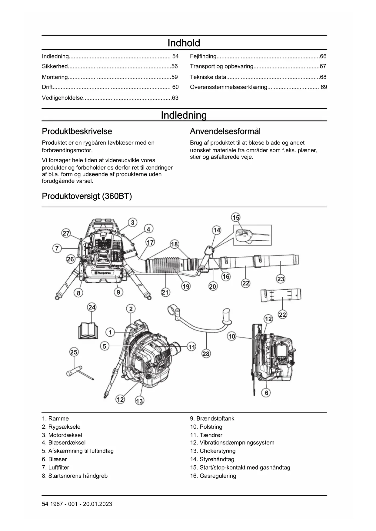 68 1967 - 001 - 20.01.2023Overensstemmelseserklæring EU-overensstemmelseserklæring Vi, Husqvarna AB, SE-561 82 Huskvarna, Sverige, tlf.: +46-36-146500 erklærer under eneansvar, at det pågældende produkt: Beskrivelse Rygsækblæser Varemærke Husqvarna Type / model 360BT, 570BTS, 580BTS Identifikation Serienumrene fra 2022 (360BT), 2023 (570BTS, 580BTS) og fremefter. overholder følgende EU-direktiver og bestemmelser: Regulativ Beskrivelse 2006/42/EF "vedrørende maskiner" 2014/30/EU "vedrørende elektromagnetisk kompatibilitet" 2000/14/EF "vedrørende støjemissioner til omgivelserne" 2011/65/EU "om begrænsning af anvendelsen af visse farlige stoffer i elektrisk og elektronisk udstyr" og at følgende standarder og/eller tekniske specifikationer anvendes: EN ISO 12100:2010,