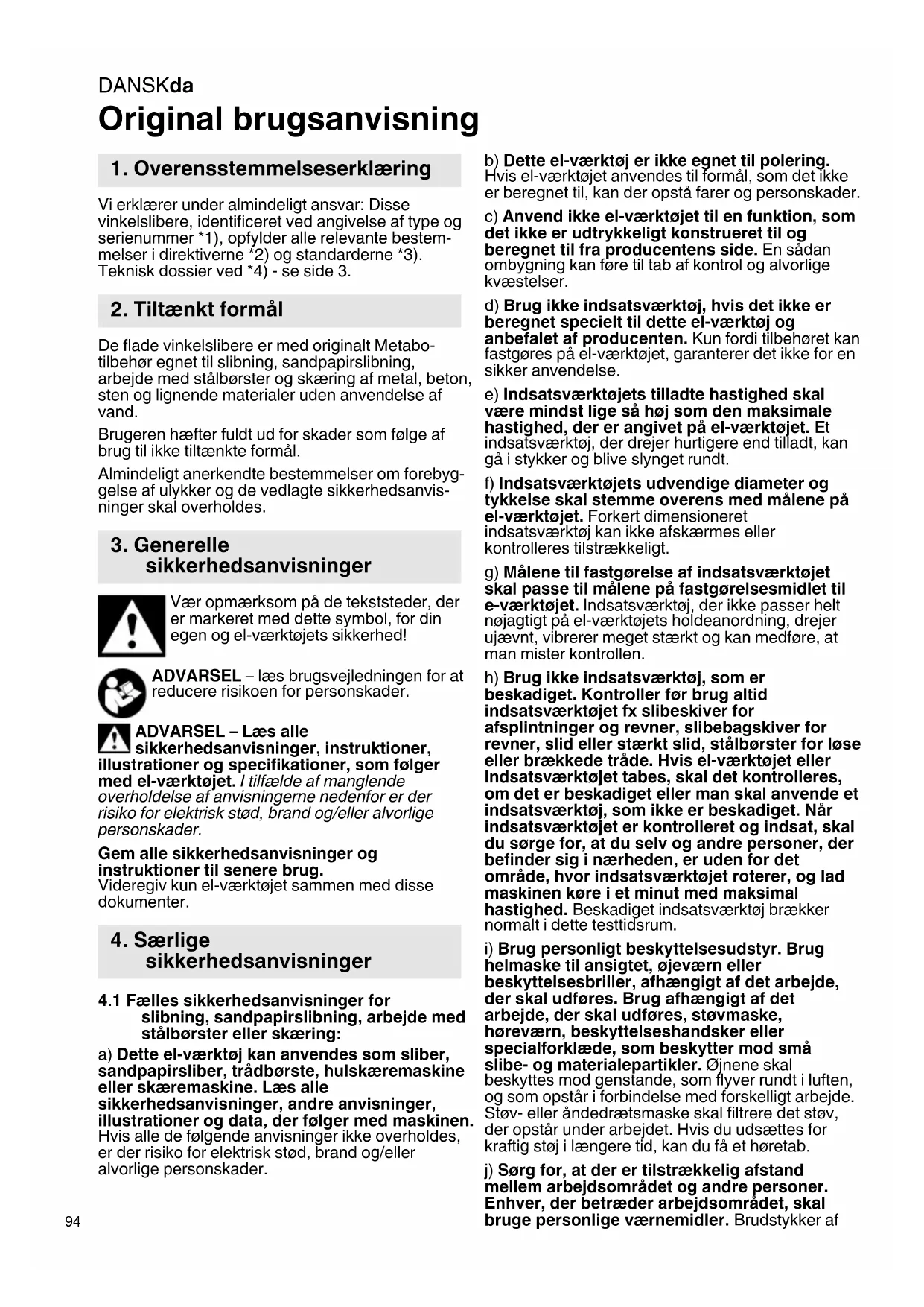 Original brugsanvisning Vi erklærer under almindeligt ansvar: Disse vinkelslibere, identificeret ved angivelse af type og serienummer *1), opfylder alle relevante bestem- melser i direktiverne *2) og standarderne *3). Teknisk dossier ved *4) - se side 3. De flade vinkelslibere er med originalt Metabo- tilbehør egnet til slibning, sandpapirslibning, arbejde med stålbørster og skæring af metal, beton, sten og lignende materialer uden anvendelse af vand. Brugeren hæfter fuldt ud for skader som følge af brug til ikke tiltænkte formål. Almindeligt anerkendte bestemmelser om forebyg- gelse af ulykker og de vedlagte sikkerhedsanvis- ninger skal overholdes. Vær opmærksom på de tekststeder, der er markeret med dette symbol, for din egen og el-værktøjets sikkerhed! ADVARSEL – læs brugsvejledningen for at reducere risikoen for personskader. ADVARSEL – Læs alle sikkerhedsanvisninger, instruktioner, illustrationer og specifikationer, som følger med el-værktøjet. I tilfælde af manglende overholdelse af anvisningerne nedenfor er der risiko for elektrisk stød, brand og/eller alvorlige personskader. Gem alle sikkerhedsanvisninger og instruktioner til senere brug. Videregiv kun el-værktøjet sammen med disse dokumenter.