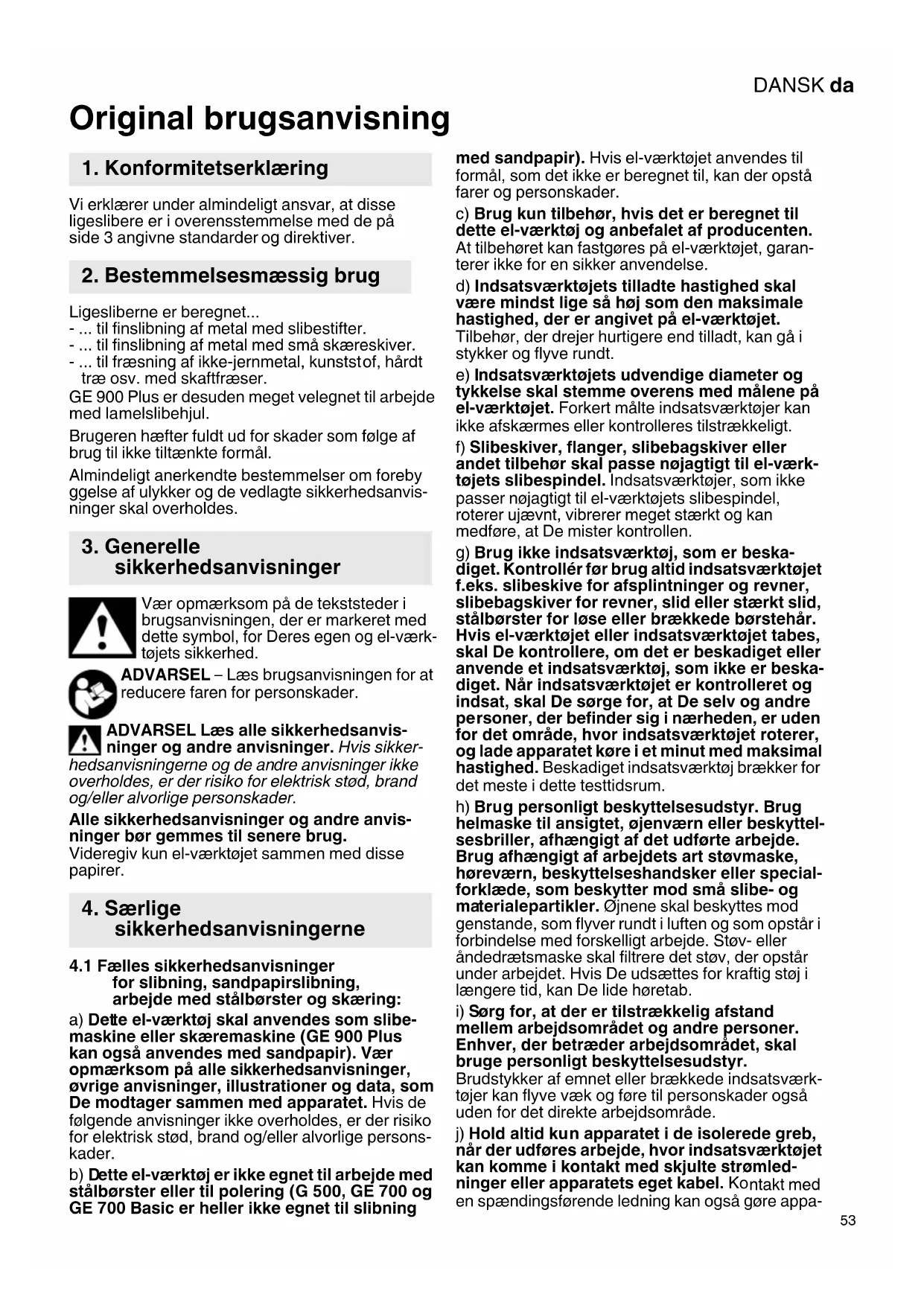 for slibning, sandpapirslibning, arbejde med stålbørster og skæring: a) Det te el-værktøj skal anvendes som slibe- maskine eller skæremaskine (GE 900 Plus kan også anvendes med sandpapir). Vær opmærk som på alle sikkerheds anvisninger, øvrige anvisninger, illustrationer og data, som De modtager sammen med apparatet. Hvis de følgende anvisninger ikke overholdes, er der risiko for elektrisk stød, brand og/eller alvorlige persons- kader. b) D ette el-værktøj er ikke egnet til arbejde med stålbørster eller til polering (G 500, GE 700 og GE 700 Basic er heller ikke egnet til slibning med sandpapir). Hvis el-værktøjet anvendes til formål, som det ikke er beregnet til, kan der opstå farer og personskader. c) Brug kun til behør, hvis det er beregnet til dette el-værktøj og anbefalet af producenten. At tilbehøret kan fastgøres på el-værktøjet, garan- terer ikke for en sikker anvendelse. d) Indsatsværktøjets tilladt e hastighed skal være mindst lige så høj som den maksimale hastighed, der er angivet på el-værktøjet. Tilbehør, der drejer hurtigere end tilladt, kan gå i stykker og flyve rundt. e) I ndsatsværktøjets udvendige diameter og tykkelse skal stemme overens med målene på el-værktøjet. Forkert målte indsatsværktøjer kan ikke afskærmes eller kontrolleres tilstrækkeligt. f) Slibeskiver, flanger, slibebag skiver eller andet tilbehør skal passe nøjagtigt til el-værk- tøjets slibespindel. Indsatsværktøjer, som ikke passer nøjagtigt til el-værktøjets slibespindel, roterer ujævnt, vibrerer meget stærkt og kan medføre, at De mister kontrollen. g) Bru g ikke indsatsværktøj, som er beska- diget. Kontrollér før brug altid indsatsværktøjet f.eks. slibeskive for afsplintninger og revner, slibebagskiver for revner, slid eller stærkt slid, stålbørster for løse eller brækkede børstehår. Hvis el-værktøjet eller indsatsværktøjet tabes, skal De kontrollere, om det er beskadiget eller anvende et indsatsværktøj, som ikke er beska- diget. Når indsatsværktøjet er kontrolleret og indsat, skal De sørge for, at De selv og andre