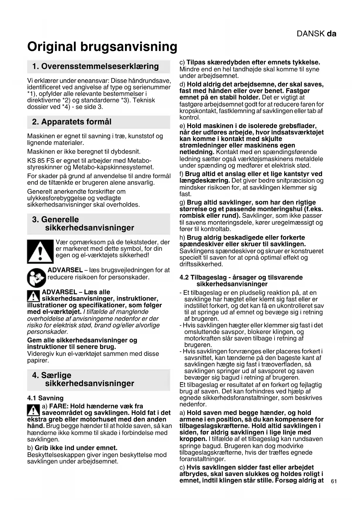 Original brugsanvisning Vi erklærer under eneansvar: Disse håndrundsave, identificeret ved angivelse af type og serienummer *1), opfylder alle relevante bestemmelser i direktiverne *2) og standarderne *3). Teknisk dossier ved *4) - se side 3. Maskinen er egnet til savning i træ, kunststof og lignende materialer. Maskinen er ikke beregnet til dybdesnit. KS 85 FS er egnet til arbejder med Metabo- styreskinner og Metabo-kapskinnesystemet. For skader på grund af anvendelse til andre formål end de tiltænkte er brugeren alene ansvarlig. Generelt anerkendte forskrifter om ulykkesforebyggelse og vedlagte sikkerhedsanvisninger skal overholdes. Vær opmærksom på de tekststeder, der er markeret med dette symbol, for din egen og el-værktøjets sikkerhed! ADVARSEL – læs brugsvejledningen for at reducere risikoen for personskader. ADVARSEL – Læs alle sikkerhedsanvisninger, instruktioner, illustrationer og specifikationer, som følger med el-værktøjet. I tilfælde af manglende overholdelse af anvisningerne nedenfor er der risiko for elektrisk stød, brand og/eller alvorlige personskader. Gem alle sikkerhedsanvisninger og instruktioner til senere brug. Videregiv kun el-værktøjet sammen med disse papirer.