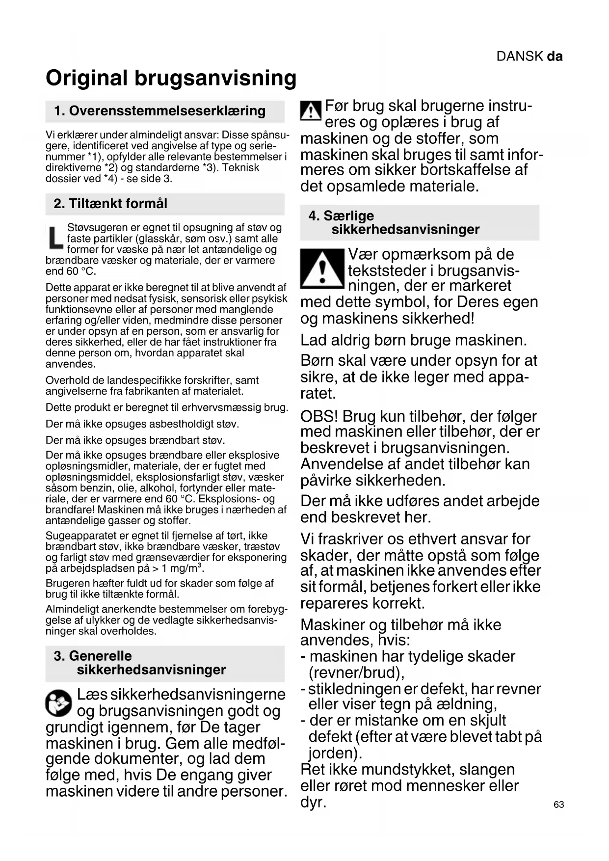 Original brugsanvisning Vi erklærer under almindeligt ansvar: Disse spånsu- gere, identificeret ved angivelse af type og serie- nummer *1), opfylder alle relevante bestemmelser i direktiverne *2) og standarderne *3). Teknisk dossier ved *4) - se side 3. Støvsugeren er egnet til opsugning af støv og faste partikler (glasskår, søm osv.) samt alle former for væske på nær let antændelige og brændbare væsker og materiale, der er varmere end 60 °C. Dette apparat er ikke beregnet til at blive anvendt af personer med nedsat fysisk, sensorisk eller psykisk funktionsevne eller af personer med manglende erfaring og/eller viden, medmindre disse personer er under opsyn af en person, som er ansvarlig for deres sikkerhed, eller de har fået instruktioner fra denne person om, hvordan apparatet skal anvendes. Overhold de landespecifikke forskrifter, samt angivelserne fra fabrikanten af materialet. Dette produkt er beregnet til erhvervsmæssig brug. Der må ikke opsuges asbestholdigt støv. Der må ikke opsuges brændbart støv. Der må ikke opsuges brændbare eller eksplosive opløsningsmidler, materiale, der er fugtet med opløsningsmiddel, eksplosionsfarligt støv, væsker såsom benzin, olie, alkohol, fortynder eller mate- riale, der er varmere end 60 °C. Eksplosions- og brandfare! Maskinen må ikke bruges i nærheden af antændelige gasser og stoffer. Sugeapparatet er egnet til fjernelse af tørt, ikke brændbart støv, ikke brændbare væsker, træstøv og farligt støv med grænseværdier for eksponering på arbejdspladsen på > 1 mg/m³. Brugeren hæfter fuldt ud for skader som følge af brug til ikke tiltænkte formål. Almindeligt anerkendte bestemmelser om forebyg- gelse af ulykker og de vedlagte sikkerhedsanvis- ninger skal overholdes. Læs sikkerhedsanvisningerne og brugsanvisningen godt og grundigt igennem, før De tager maskinen i brug. Gem alle medføl- gende dokumenter, og lad dem følge med, hvis De engang giver maskinen videre til andre personer. Før brug skal brugerne instru- eres og oplæres i brug af maskinen og de stoffer, som maskinen skal bruges til samt infor- meres om sikker bortskaffelse af det opsamlede materiale. Vær opmærksom på de tekststeder i brugsanvis- ningen, der er markeret med dette symbol, for Deres egen og maskinens sikkerhed! Lad aldrig børn bruge maskinen. Børn skal være under opsyn for at sikre, at de ikke leger med appa- ratet. OBS! Brug kun tilbehør, der følger med maskinen eller tilbehør, der er beskrevet i brugsanvisningen. Anvendelse af andet tilbehør kan påvirke sikkerheden. Der må ikke udføres andet arbejde end beskrevet her. Vi fraskriver os ethvert ansvar for skader, der måtte opstå som følge af, at maskinen ikke anvendes efter sit formål, betjenes forkert eller ikke repareres korrekt. Maskiner og tilbehør må ikke anvendes, hvis: - maskinen har tydelige skader (revner/brud), - stikledningen er defekt, har revner eller viser tegn på ældning, - der er mistanke om en skjult defekt (efter at være blevet tabt på jorden). Ret ikke mundstykket, slangen eller røret mod mennesker eller dyr.