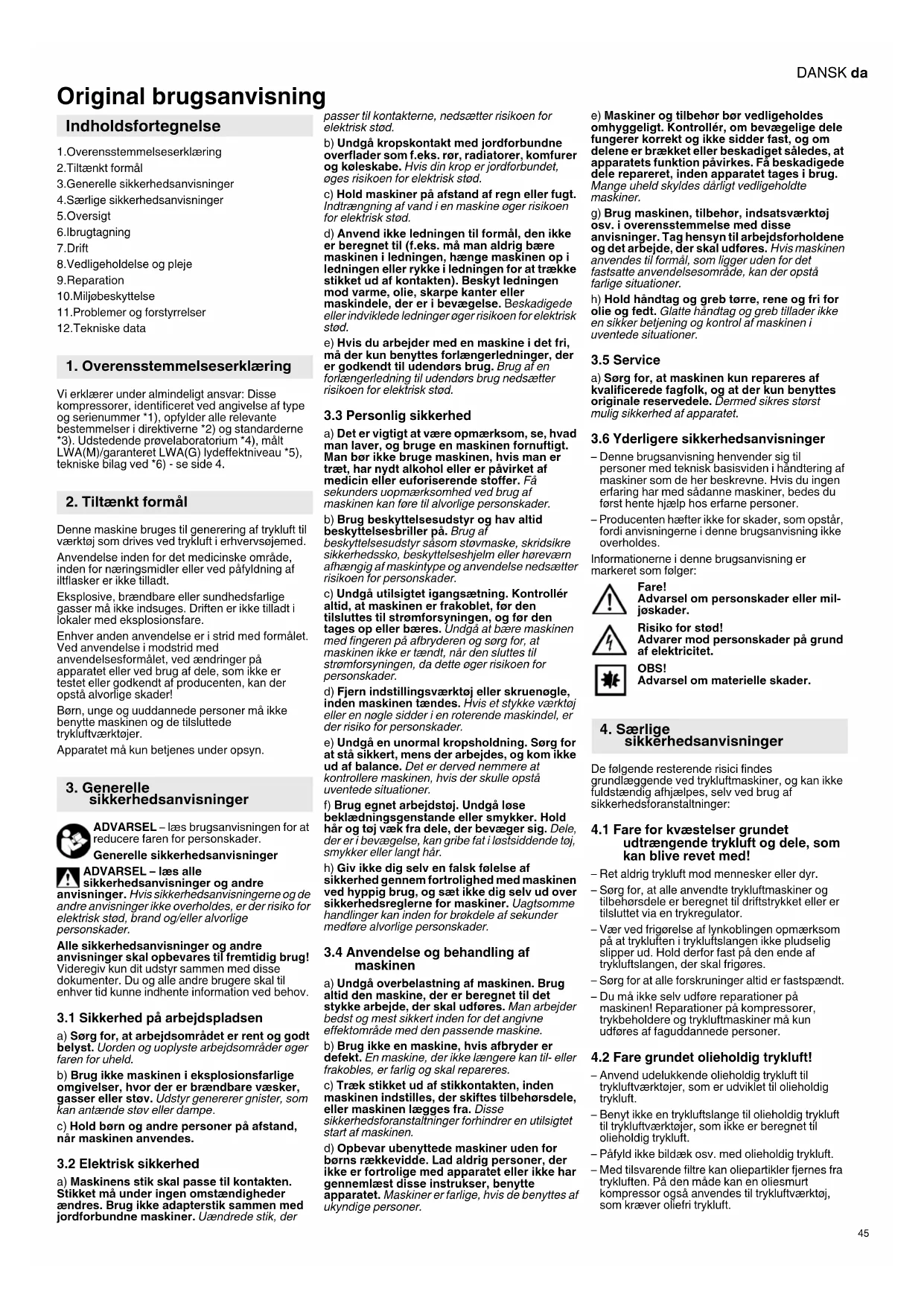 Original brugsanvisning 1.Overensstemmelseserklæring 2.Tiltænkt formål 3.Generelle sikkerhedsanvisninger 4.Særlige sikkerhedsanvisninger 5.Oversigt 6.Ibrugtagning 7.Drift 8.Vedligeholdelse og pleje 9.Reparation 10.Miljøbeskyttelse 11.Problemer og forstyrrelser 12.Tekniske data Vi erklærer under almindeligt ansvar: Disse kompressorer, identificeret ved angivelse af type og serienummer *1), opfylder alle relevante bestemmelser i direktiverne *2) og standarderne *3). Udstedende prøvelaboratorium *4), målt LWA(M)/garanteret LWA(G) lydeffektniveau *5), tekniske bilag ved *6) - se side 4. Denne maskine bruges til generering af trykluft til værktøj som drives ved trykluft i erhvervsøjemed. Anvendelse inden for det medicinske område, inden for næringsmidler eller ved påfyldning af iltflasker er ikke tilladt. Eksplosive, brændbare eller sundhedsfarlige gasser må ikke indsuges. Driften er ikke tilladt i lokaler med eksplosionsfare. Enhver anden anvendelse er i strid med formålet. Ved anvendelse i modstrid med anvendelsesformålet, ved ændringer på apparatet eller ved brug af dele, som ikke er testet eller godkendt af producenten, kan der opstå alvorlige skader! Børn, unge og uuddannede personer må ikke benytte maskinen og de tilsluttede trykluftværktøjer. Apparatet må kun betjenes under opsyn. ADVARSEL – læs brugsanvisningen for at reducere faren for personskader. Generelle sikkerhedsanvisninger ADVARSEL – læs alle sikkerhedsanvisninger og andre anvisninger. Hvis sikkerhedsanvisningerne og de andre anvisninger ikke overholdes, er der risiko for elektrisk stød, brand og/eller alvorlige personskader. Alle sikkerhedsanvisninger og andre anvisninger skal opbevares til fremtidig brug! Videregiv kun dit udstyr sammen med disse dokumenter. Du og alle andre brugere skal til enhver tid kunne indhente information ved behov.