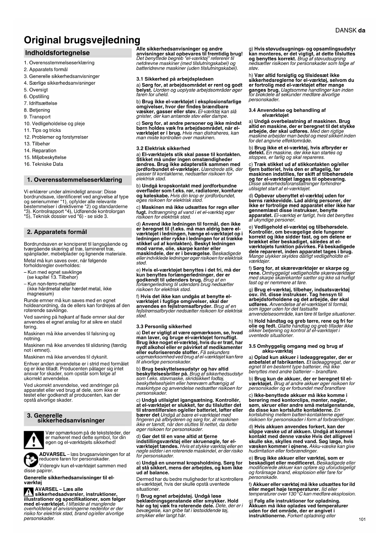 Vi erklærer under almindeligt ansvar: Disse bordrundsave, identificeret ved angivelse af type og serienummer *1), opfylder alle relevante bestemmelser i direktiverne *2) og standarderne *3). Kontrolrapport *4), Udførende kontrolorgan *5), Teknisk dossier ved *6) - se side 3. Bordrundsaven er konciperet til langsgående og tværgående skæring af træ, lamineret træ, spånplader, møbelplader og lignende materiale. Metal må kun saves over, når følgende forholdsregler overholdes: – Kun med egnet savklinge (se kapitel 13. Tilbehør) – Kun non-ferro-metaller (ikke hårdmetal eller hærdet metal, ikke magnesium) Runde emner må kun saves med en egnet holdeanordning, da de ellers kan fordrejes af den roterende savklinge. Ved savning på højkant af flade emner skal der anvendes et egnet anslag for at sikre en stabil føring. Maskinen må ikke anvendes til falsning og notning. Maskinen må ikke anvendes til slidsning (færdig not i emnet). Maskinen må ikke anvendes til dyksnit. Enhver anden anvendelse er i strid med formålet og er ikke tilladt. Producenten påtager sig intet ansvar for skader, som opstår som følge af ukorrekt anvendelse. Ved ukorrekt anvendelse, ved ændringer på apparatet eller ved brug af dele, som ikke er testet eller godkendt af producenten, kan der opstå alvorlige skader. Vær opmærksom på de tekststeder, der er markeret med dette symbol, for din egen og el-værktøjets sikkerhed! ADVARSEL – læs brugsanvisningen for at reducere faren for personskader. Videregiv kun el-værktøjet sammen med disse papirer. Generelle sikkerhedsanvisninger til el- værktøj AVARSEL – Læs alle sikkerhedsadvarsler, instruktioner, illustrationer og specifikationer, som følger med el-værktøjet. I tilfælde af manglende overholdelse af anvisningerne nedenfor er der risiko for elektrisk stød, brand og/eller alvorlige personskader. Alle sikkerhedsanvisninger og andre anvisninger skal opbevares til fremtidig brug! Det benyttede begreb "el-værktøj" refererer til netdrevne maskiner (med tilslutningskabel) og batteridrevne maskiner (uden tilslutningskabel).
