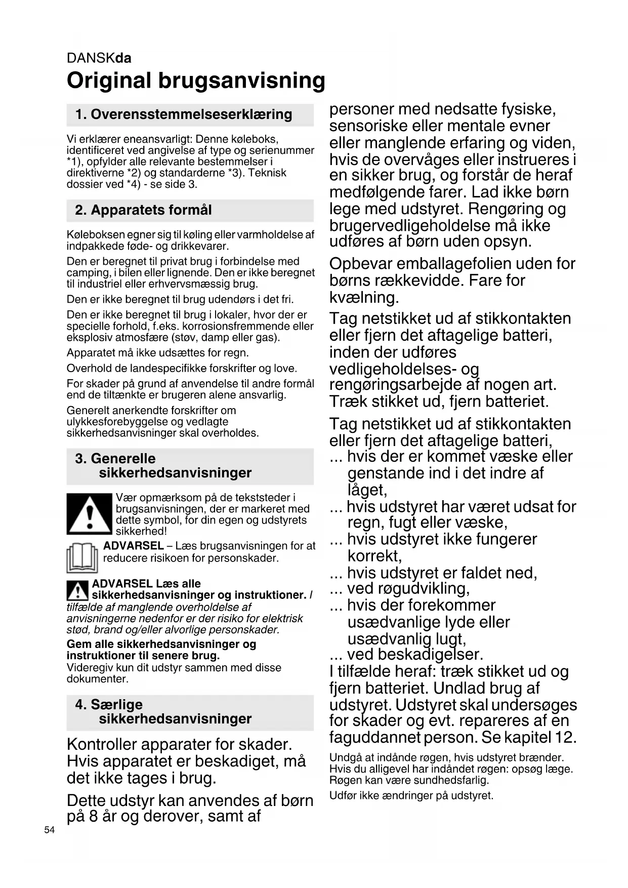 Original brugsanvisning Vi erklærer eneansvarligt: Denne køleboks, identificeret ved angivelse af type og serienummer *1), opfylder alle relevante bestemmelser i direktiverne *2) og standarderne *3). Teknisk dossier ved *4) - se side 3. Køleboksen egner sig til køling eller varmholdelse af indpakkede føde- og drikkevarer. Den er beregnet til privat brug i forbindelse med camping, i bilen eller lignende. Den er ikke beregnet til industriel eller erhvervsmæssig brug. Den er ikke beregnet til brug udendørs i det fri. Den er ikke beregnet til brug i lokaler, hvor der er specielle forhold, f.eks. korrosionsfremmende eller eksplosiv atmosfære (støv, damp eller gas). Apparatet må ikke udsættes for regn. Overhold de landespecifikke forskrifter og love. For skader på grund af anvendelse til andre formål end de tiltænkte er brugeren alene ansvarlig. Generelt anerkendte forskrifter om ulykkesforebyggelse og vedlagte sikkerhedsanvisninger skal overholdes. Vær opmærksom på de tekststeder i brugsanvisningen, der er markeret med dette symbol, for din egen og udstyrets sikkerhed! ADVARSEL – Læs brugsanvisningen for at reducere risikoen for personskader. ADVARSEL Læs alle sikkerhedsanvisninger og instruktioner. I tilfælde af manglende overholdelse af anvisningerne nedenfor er der risiko for elektrisk stød, brand og/eller alvorlige personskader. Gem alle sikkerhedsanvisninger og instruktioner til senere brug. Videregiv kun dit udstyr sammen med disse dokumenter. Kontroller apparater for skader. Hvis apparatet er beskadiget, må det ikke tages i brug. Dette udstyr kan anvendes af børn på 8 år og derover, samt af personer med nedsatte fysiske, sensoriske eller mentale evner eller manglende erfaring og viden, hvis de overvåges eller instrueres i en sikker brug, og forstår de heraf medfølgende farer. Lad ikke børn lege med udstyret. Rengøring og brugervedligeholdelse må ikke udføres af børn uden opsyn. Opbevar emballagefolien uden for børns rækkevidde. Fare for kvælning. Tag netstikket ud af stikkontakten eller fjern det aftagelige batteri, inden der udføres vedligeholdelses- og rengøringsarbejde af nogen art. Træk stikket ud, fjern batteriet. Tag netstikket ud af stikkontakten eller fjern det aftagelige batteri, ... hvis der er kommet væske eller genstande ind i det indre af låget, ... hvis udstyret har været udsat for regn, fugt eller væske, ... hvis udstyret ikke fungerer korrekt, ... hvis udstyret er faldet ned, ... ved røgudvikling, ... hvis der forekommer usædvanlige lyde eller usædvanlig lugt, ... ved beskadigelser. I tilfælde heraf: træk stikket ud og fjern batteriet. Undlad brug af udstyret. Udstyret skal undersøges for skader og evt. repareres af en faguddannet person. Se kapitel 12. Undgå at indånde røgen, hvis udstyret brænder. Hvis du alligevel har indåndet røgen: opsøg læge. Røgen kan være sundhedsfarlig. Udfør ikke ændringer på udstyret.