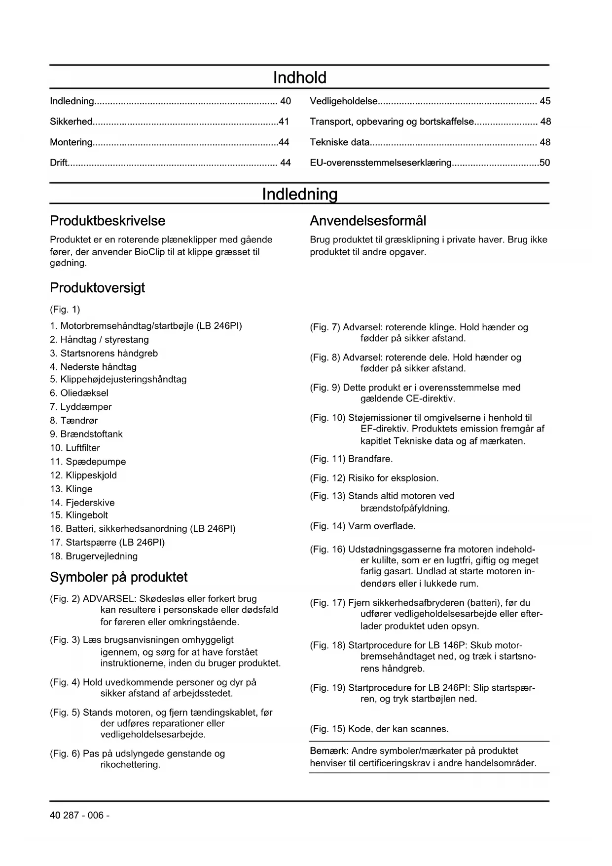 Symboler på produktet (Fig. 2) ADVARSEL: Skødesløs eller forkert brug kan resultere i personskade eller dødsfald for føreren eller omkringstående. (Fig. 3) Læs brugsanvisningen omhyggeligt igennem, og sørg for at have forstået instruktionerne, inden du bruger produktet. (Fig. 4) Hold uvedkommende personer og dyr på sikker afstand af arbejdsstedet. (Fig. 5) Stands motoren, og fjern tændingskablet, før der udføres reparationer eller vedligeholdelsesarbejde. (Fig. 6) Pas på udslyngede genstande og rikochettering. (Fig. 7) Advarsel: roterende klinge. Hold hænder og fødder på sikker afstand. (Fig. 8) Advarsel: roterende dele. Hold hænder og fødder på sikker afstand. (Fig. 9) Dette produkt er i overensstemmelse med gældende CE-direktiv. (Fig. 10) Støjemissioner til omgivelserne i henhold til EF-direktiv. Produktets emission fremgår af kapitlet Tekniske data og af mærkaten. (Fig. 11) Brandfare. (Fig. 12) Risiko for eksplosion. (Fig. 13) Stands altid motoren ved brændstofpåfyldning. (Fig. 14) Varm overflade. (Fig. 16) Udstødningsgasserne fra motoren indehold- er kulilte, som er en lugtfri, giftig og meget farlig gasart. Undlad at starte motoren in- dendørs eller i lukkede rum. (Fig. 17) Fjern sikkerhedsafbryderen (batteri), før du udfører vedligeholdelsesarbejde eller efter- lader produktet uden opsyn. (Fig. 18) Startprocedure for LB 146P: Skub motor- bremsehåndtaget ned, og træk i startsno- rens håndgreb. (Fig. 19) Startprocedure for LB 246PI: Slip startspær- ren, og tryk startbøjlen ned. (Fig. 15) Kode, der kan scannes. Bemærk: Andre symboler/mærkater på produktet henviser til certificeringskrav i andre handelsområder. 40 287 - 006 -Euro V-emissioner ADVARSEL: Ved manipulation af motoren bortfalder EU-typegodkendelsen af dette produkt. Produktansvar Som nævnt i produktansvarsbestemmelserne hæfter vi ikke for skader forårsaget af vores produkt, hvis: